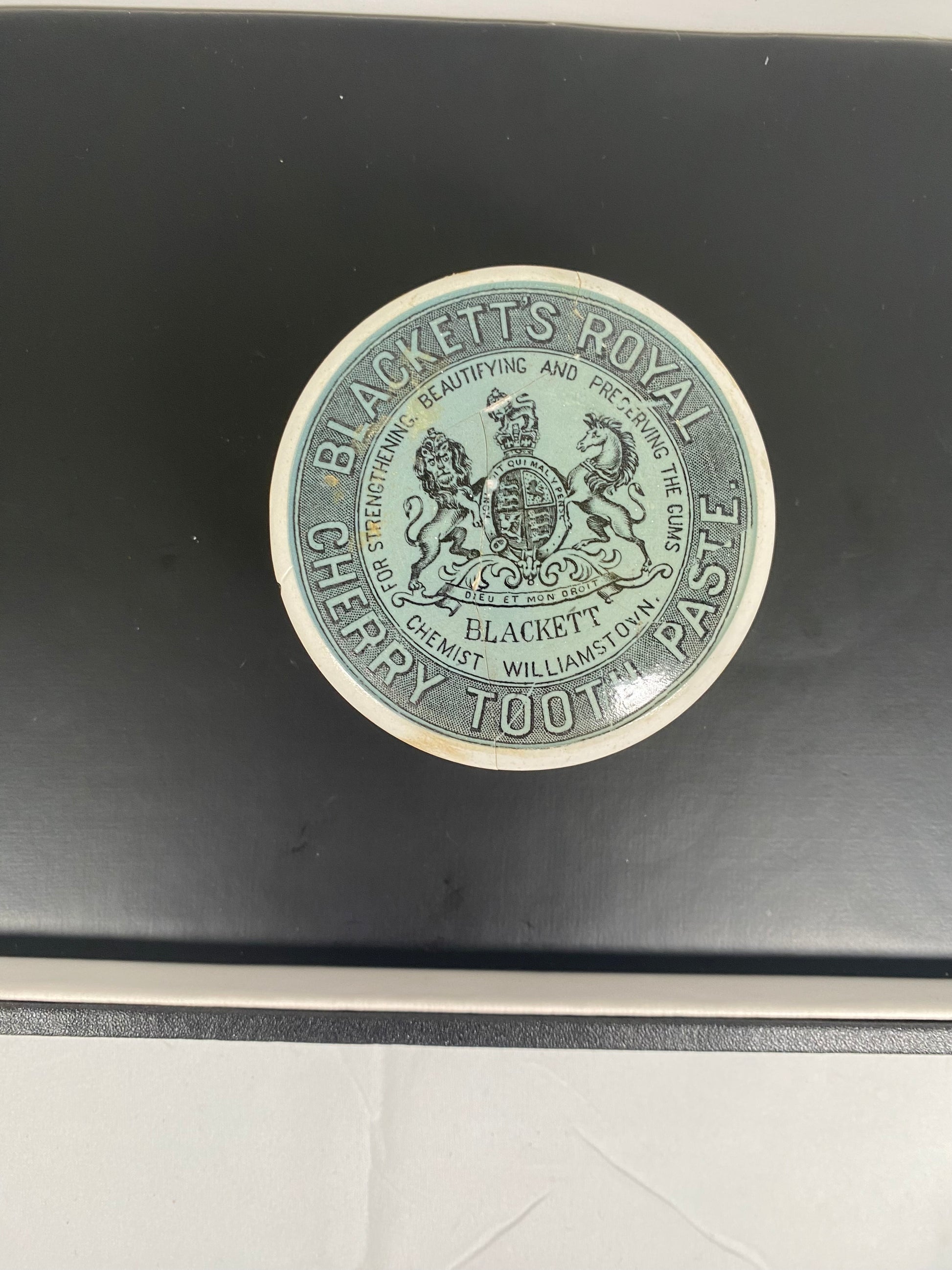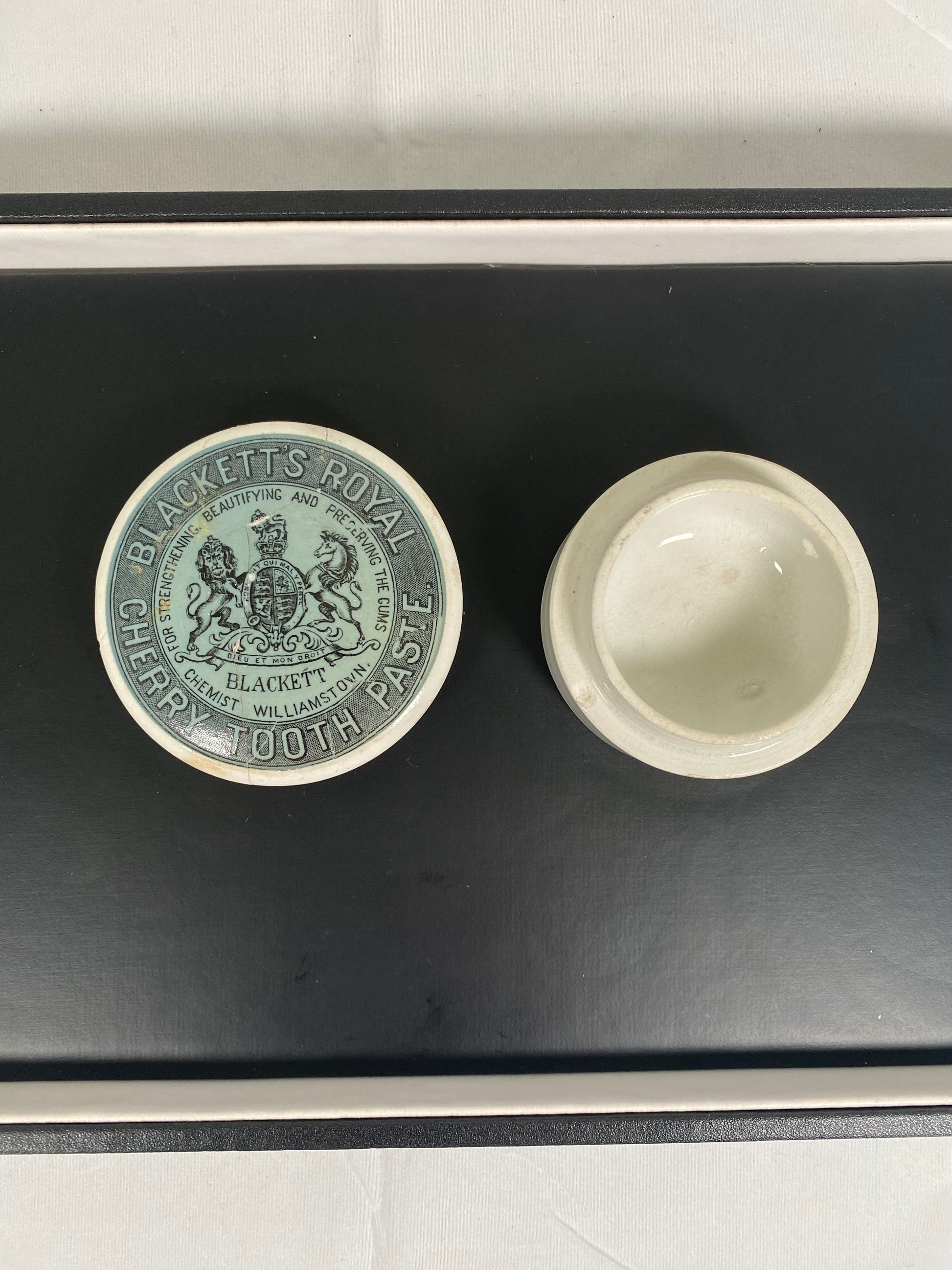 Tapa y base de bote de pasta de dientes Blackett's, raras, tal como están, reparadas