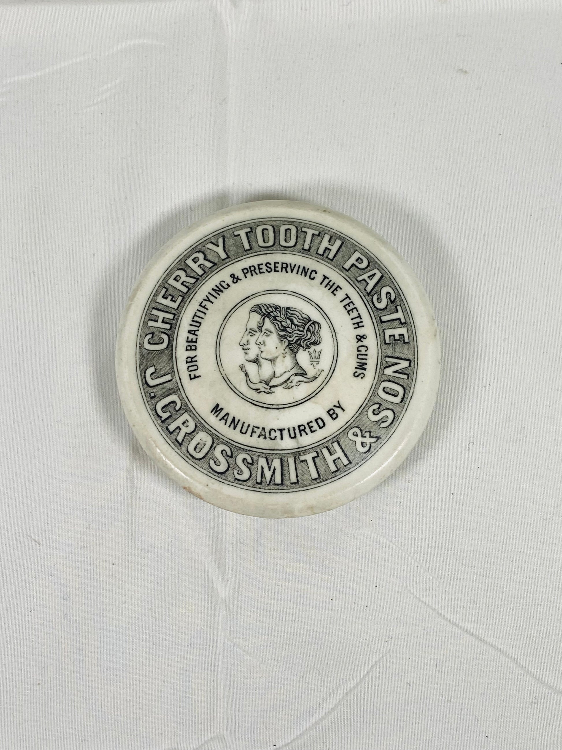 Tapa de bote de pasta de dientes de cereza, de loza victoriana de mediados a finales del siglo XIX, J Grossmith & Son