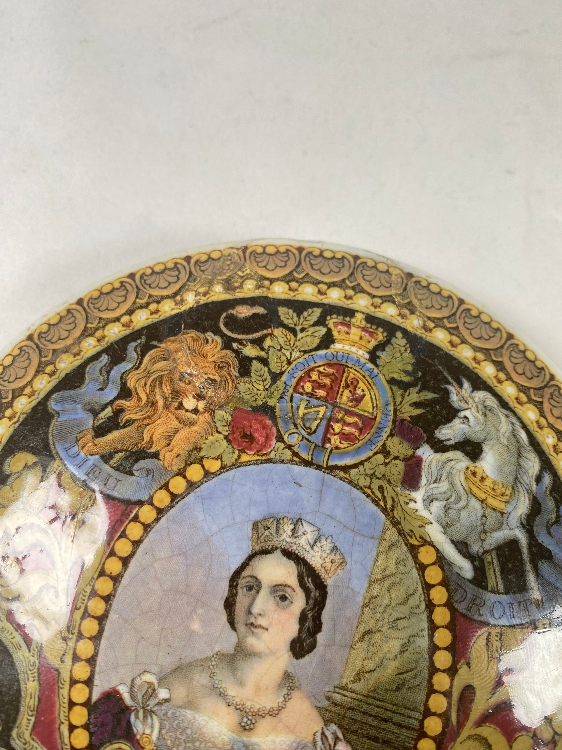 Una preciosa tapa de olla Prattware que conmemora el reinado de la reina Victoria, representada aquí en su juventud como "Orgullo de Inglaterra". Se trata de un diseño particularmente raro, de mediados de la década de 1840 a 1860.