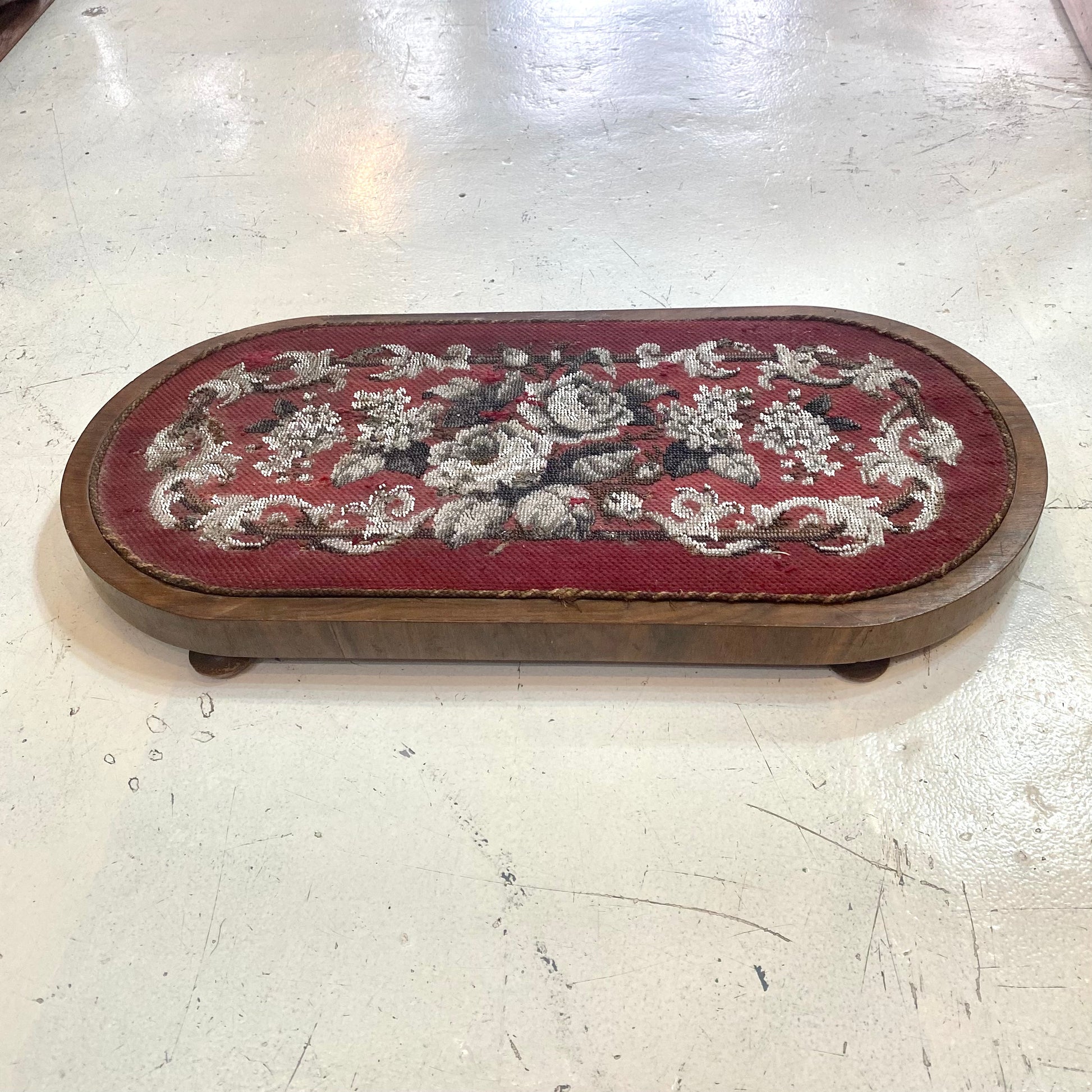 Estos reposapiés se ven más a menudo con diseños bordados o de tapiz, por lo que las cuentas son una opción poco común y atractiva. El estampado de rosas gris plateadas sobre el fondo de lana de tapiz rojo intenso es absolutamente impresionante.
