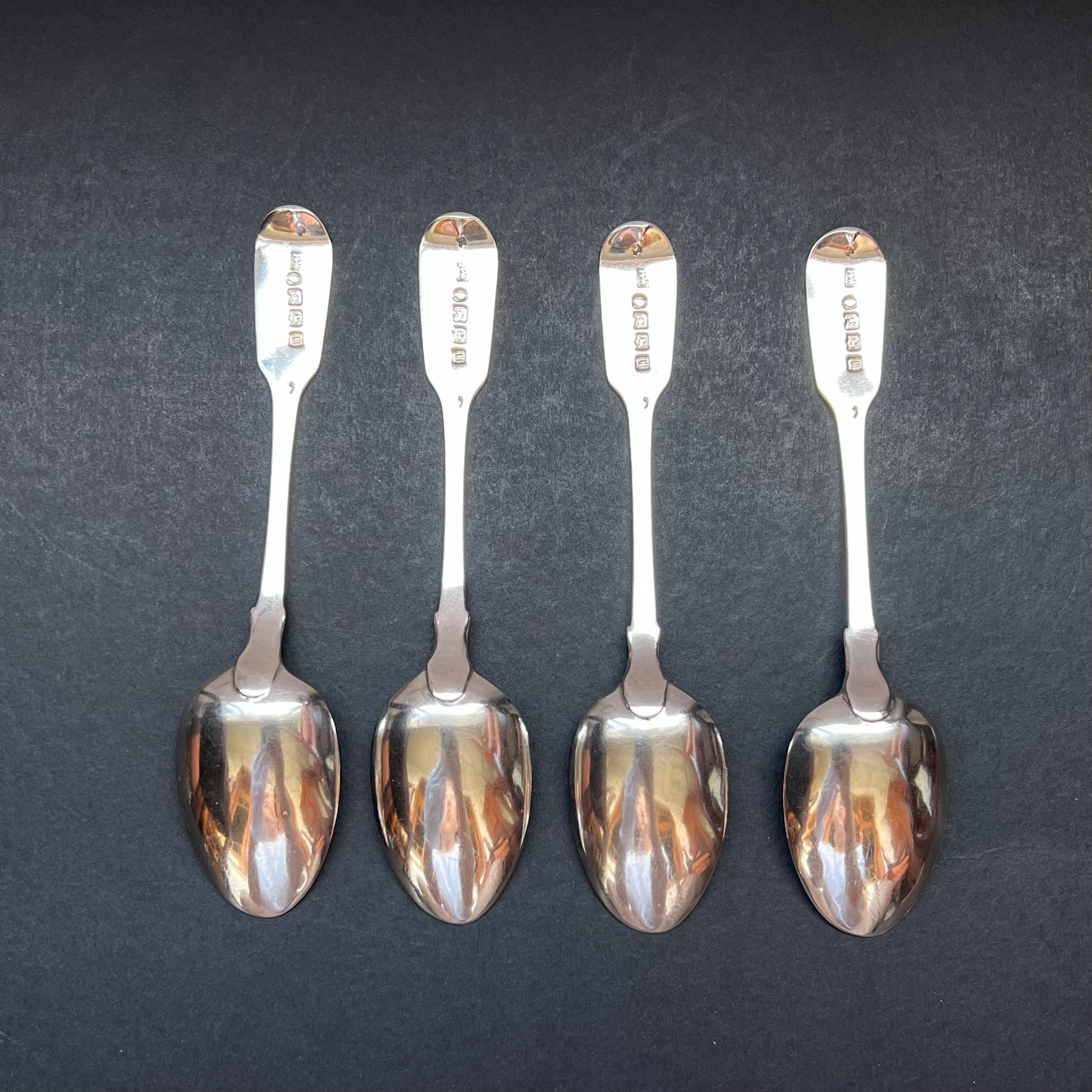 Precioso juego de cuatro cucharas de plata de ley de Guillermo IV, con marcas de Robert Williams, 1836, Exeter. Exeter es una marca relativamente rara, lo que convierte a este juego en un ejemplar coleccionable de plata provincial antigua previctoriana.