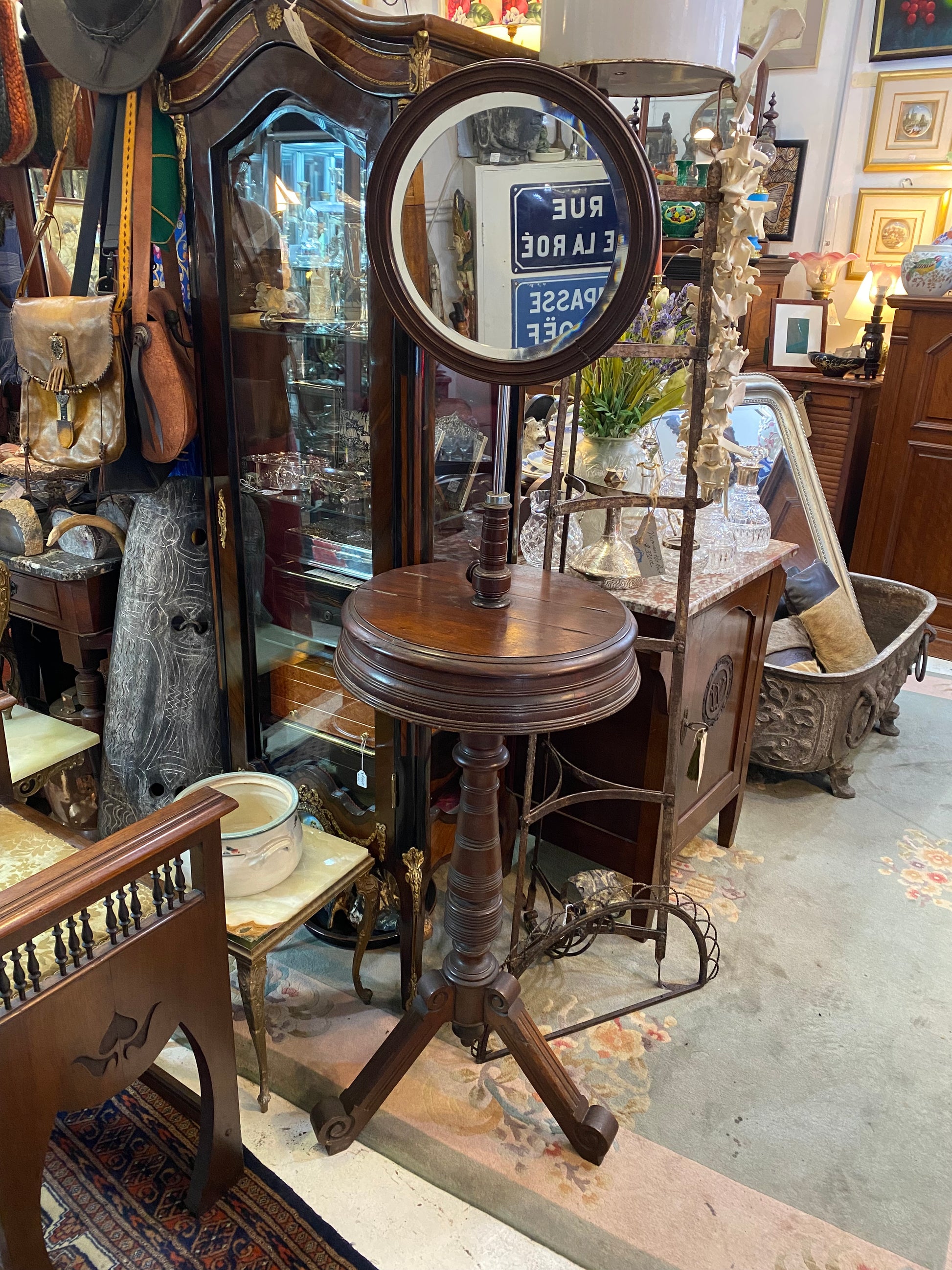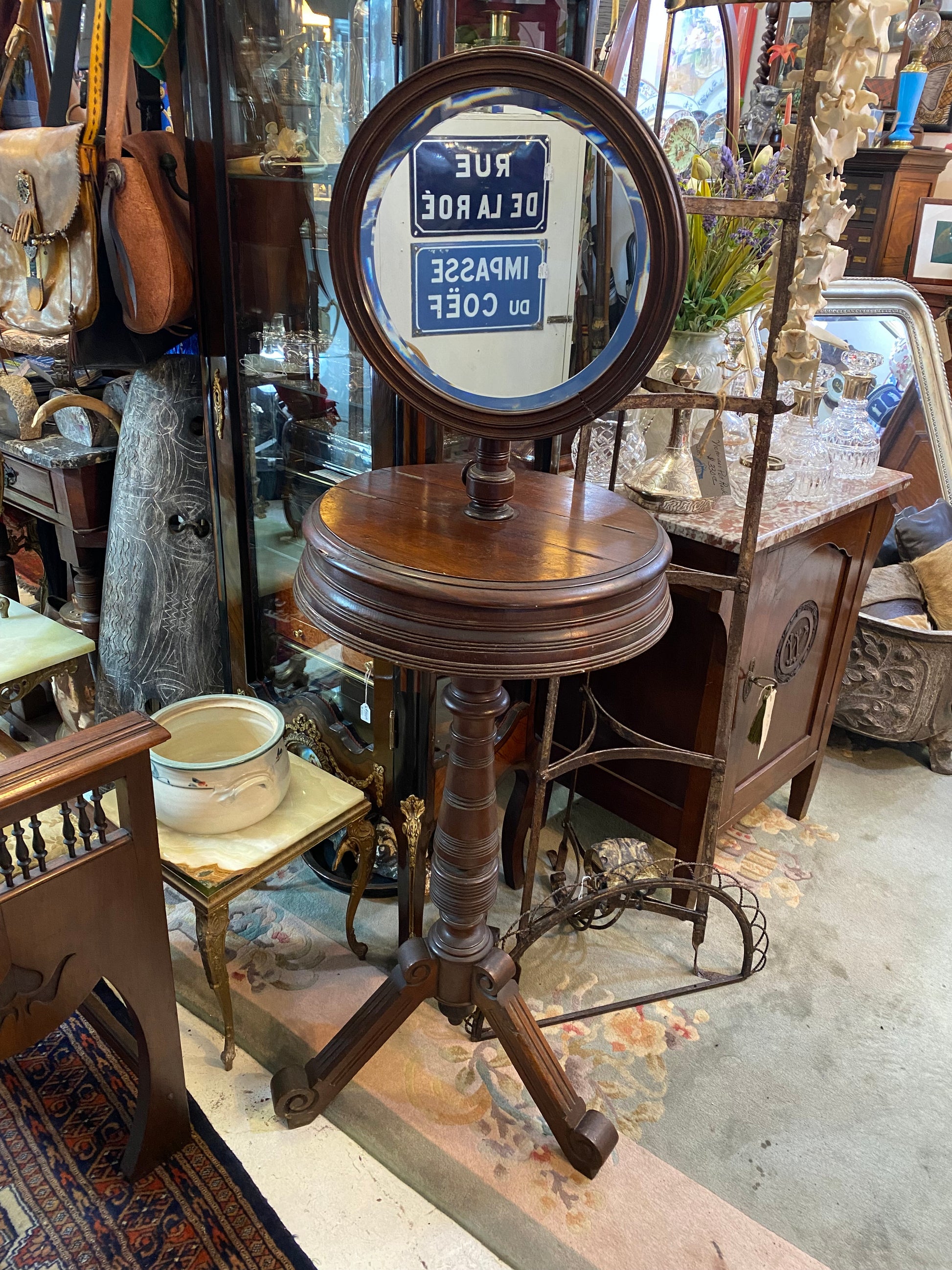 Esta mesa victoriana de caoba, de circa 1880, es una pieza increíblemente hermosa y práctica, con un mecanismo telescópico cromado. Originalmente se usaba como tocador de afeitar, pero con dos compartimentos superiores elevables, se puede colocar fácilmente en un dormitorio y usar como tocador de afeitar o de maquillaje, con compartimentos para él y para ella. Perfecta para añadir un toque de elegancia a la habitación y para quienes siempre están en movimiento.