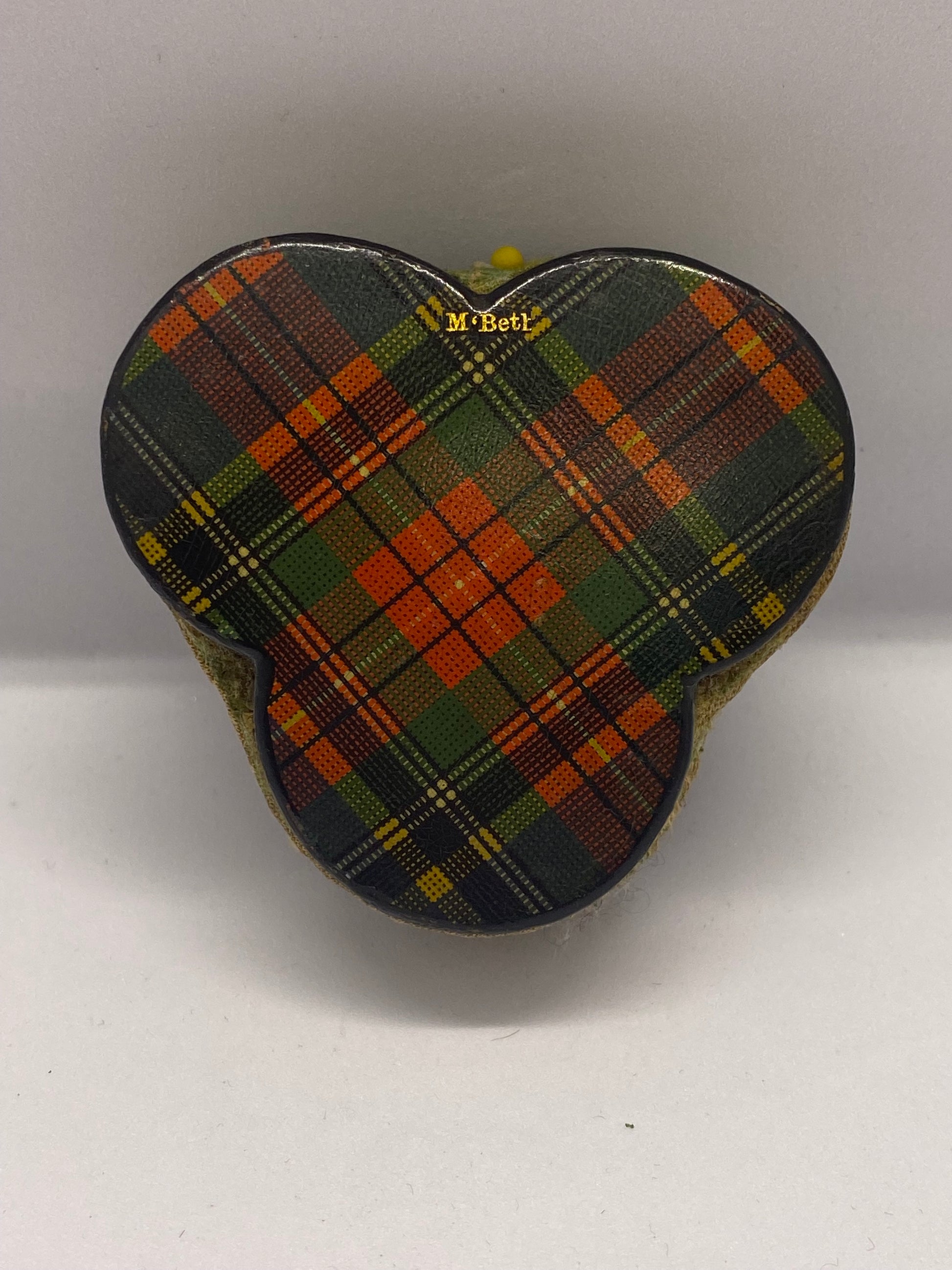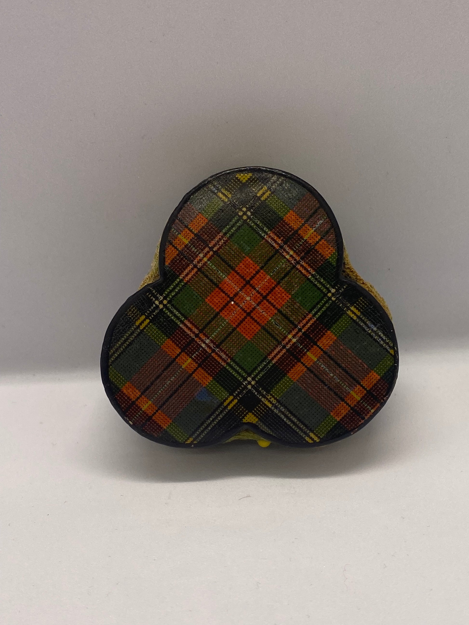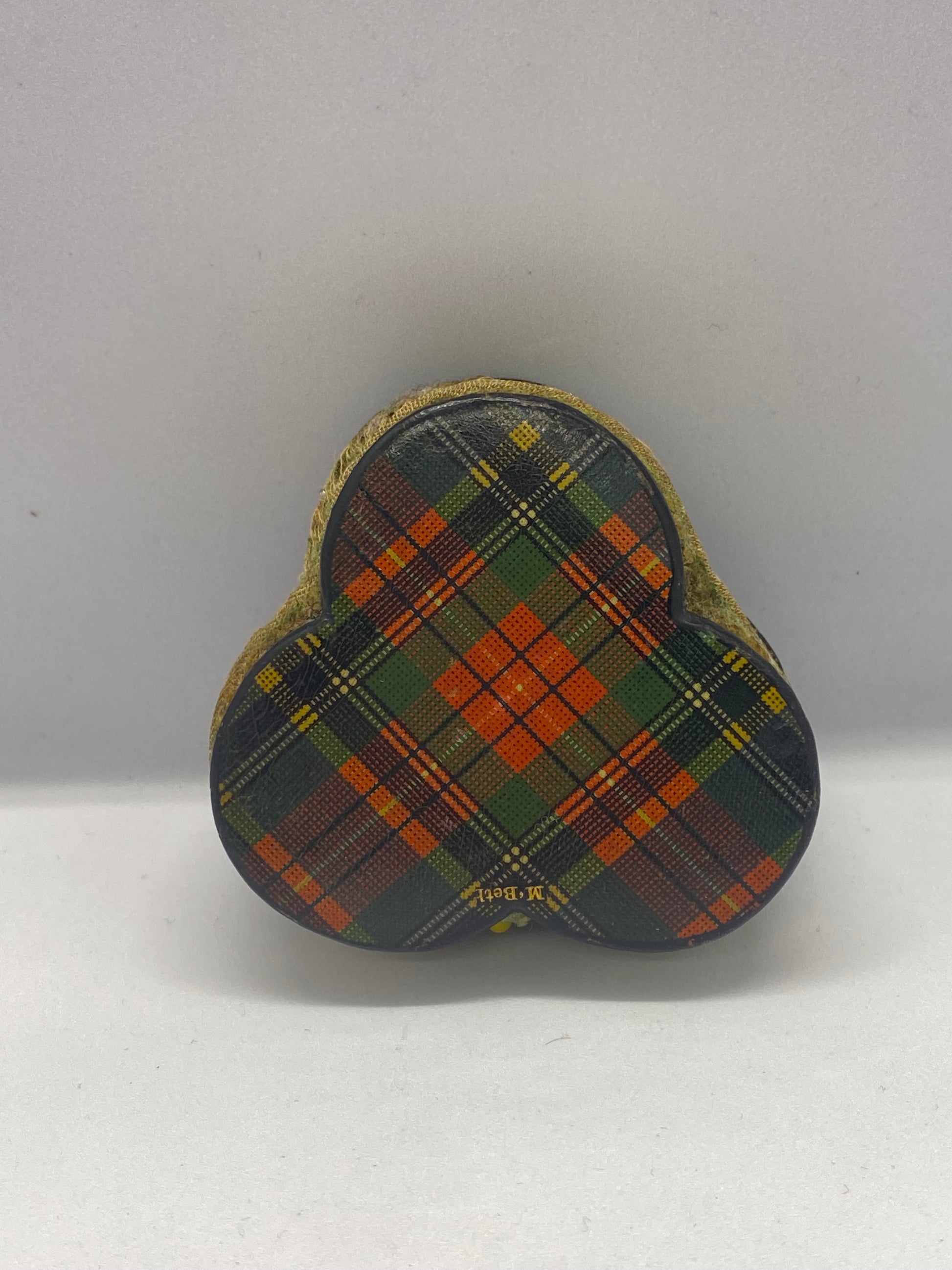A Precioso alfiletero de tartán de finales del siglo XIX con forma de trébol. La marquetería está en buen estado; el terciopelo del alfiletero muestra signos de desgaste, pero en general sigue siendo una pieza encantadora y coleccionable. Un patrón clásico del tartán del clan McBeth.