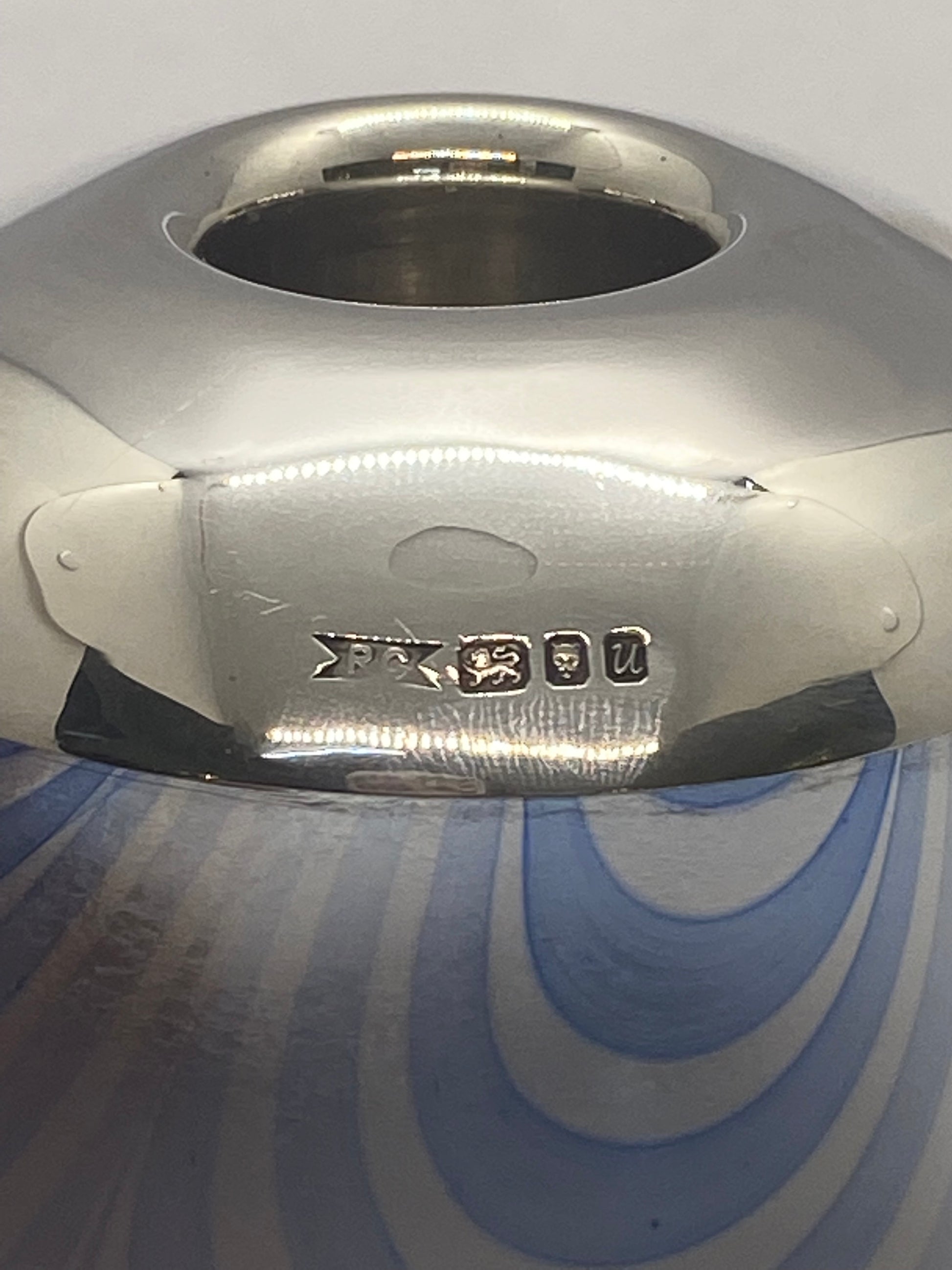 Precioso cerillero con borde de plata de ley, con sello de Londres de 1994. Marcas de fabricante en plata de RC , quien parece haber estado activo solo por un corto periodo, entre 1989 y 1997. Hermoso cuerpo de vidrio soplado a mano con un hermoso patrón de espirales azules.