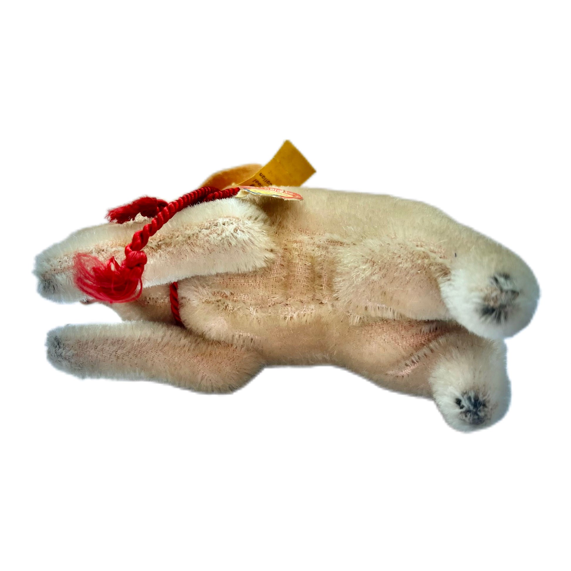 Bellamente elaborada con ojos de cristal azul, detalles aerografiados a mano en el rostro y el cuerpo, y detalles de fieltro cosidos a mano, cada pieza Steiff de este período es única. Otros detalles encantadores incluyen su lengua de fieltro y un collar de cuerda roja del que cuelga la placa del pecho.