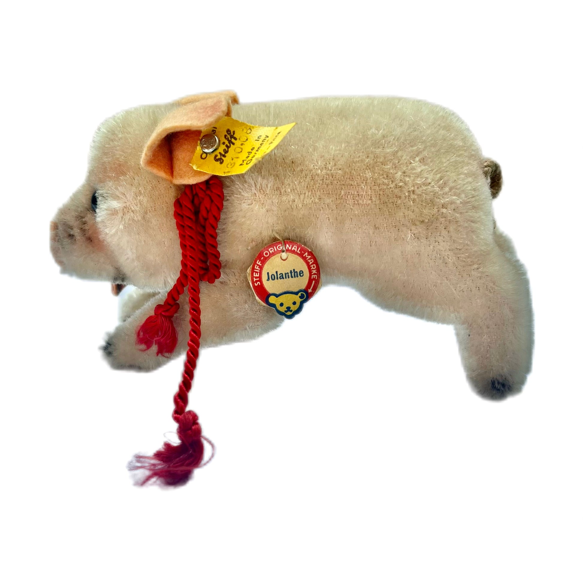 Aquí tenemos un precioso cerdo de peluche vintage Steiff “Jolanthe”, fabricado en Alemania entre los años 1950 y 1960.