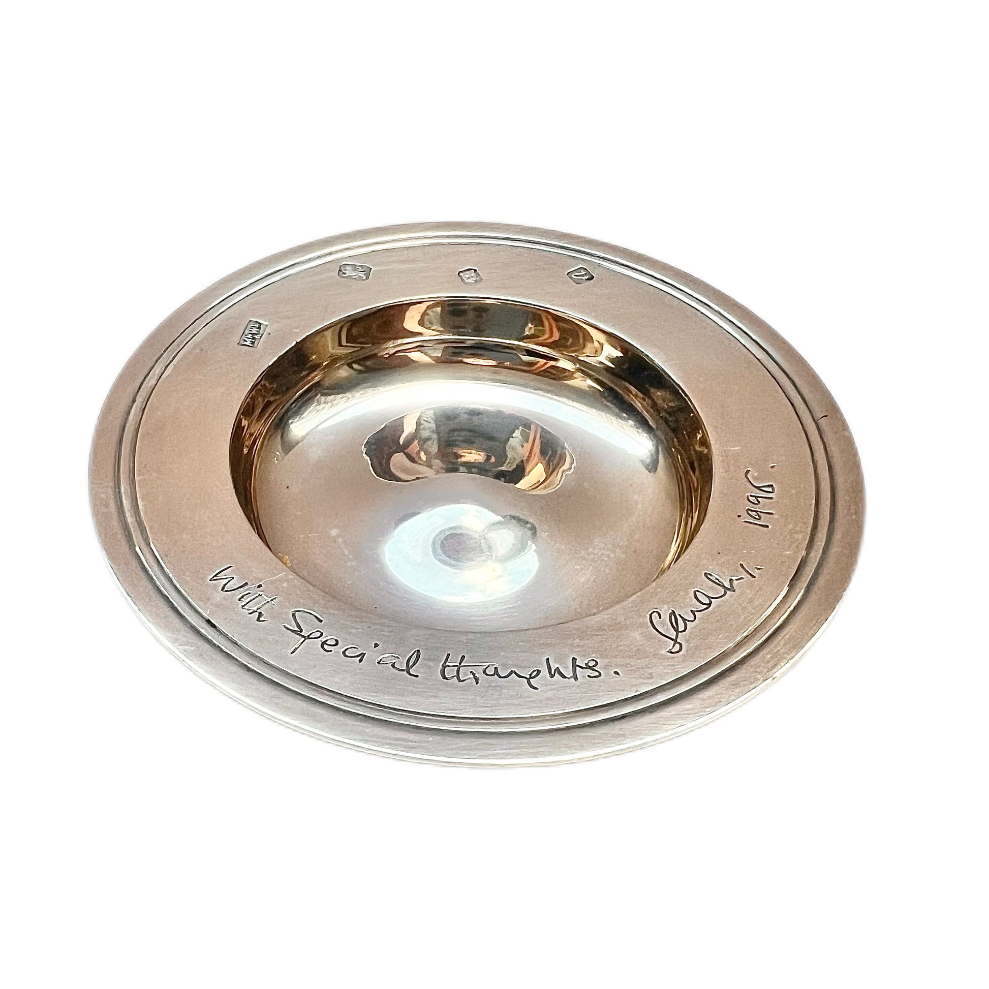 A charming sterling silver miniature Armada dish with marks for London, 1995, Mappin & Webb. With special inscription “With Special Thoughts / Sarah I 1996”.