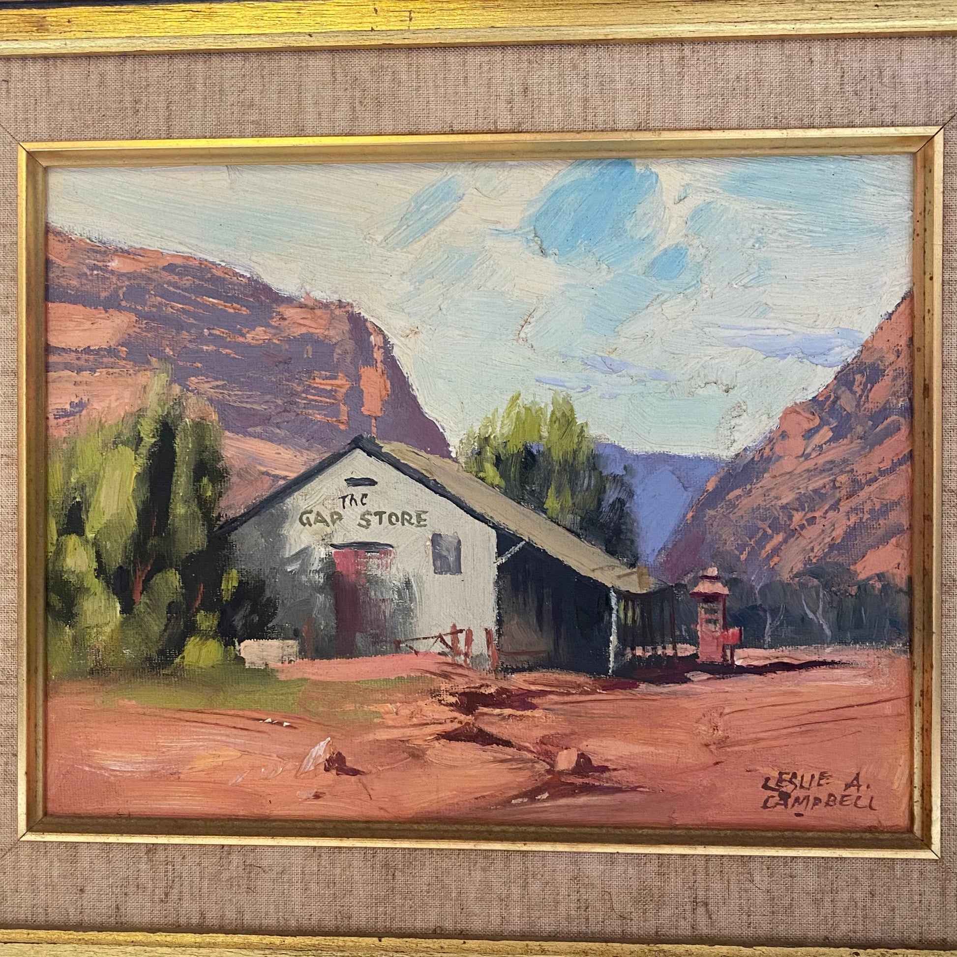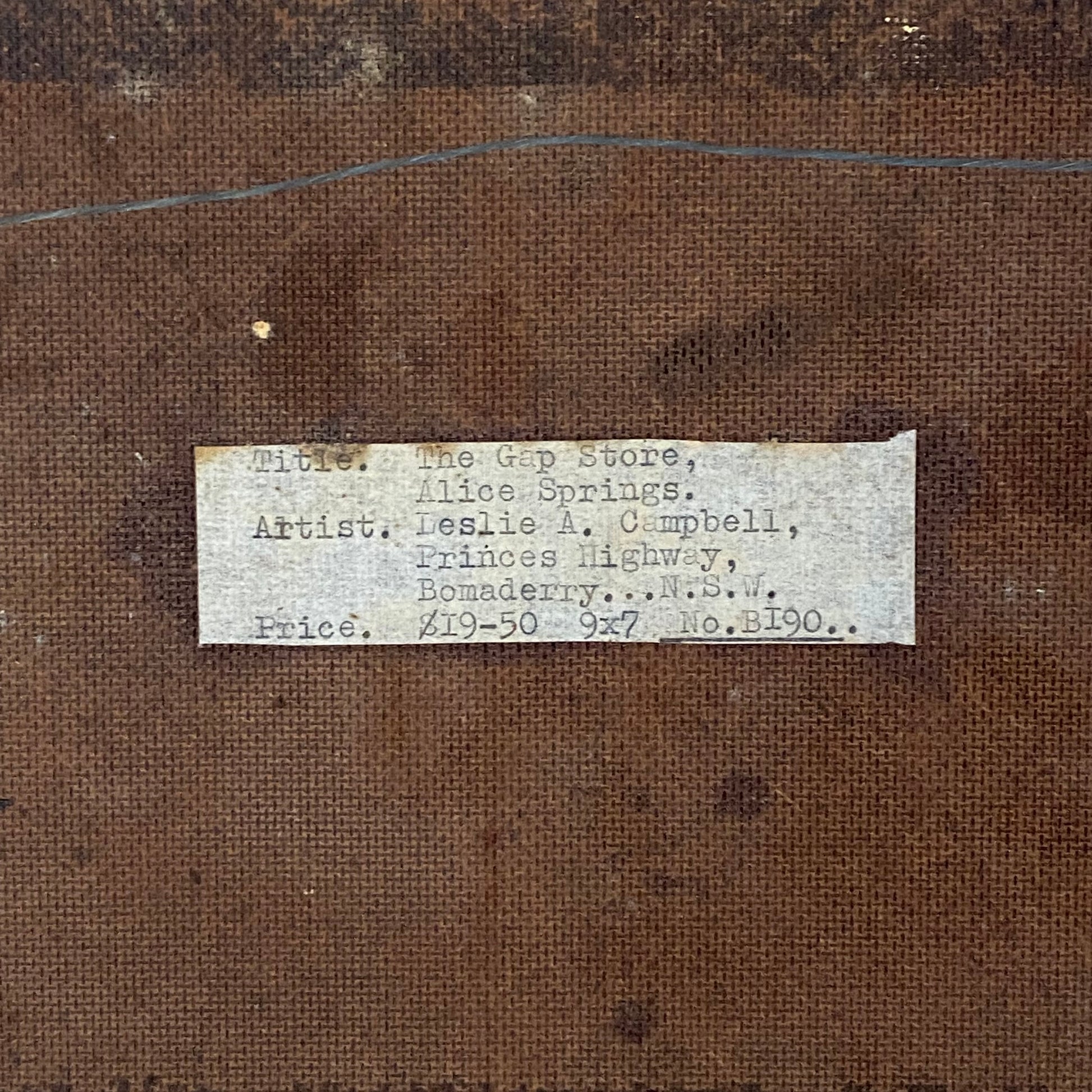 “The Gap Store, Alice Springs". 20th century oil Australian outback painting by listed artist Leslie A. Campbell