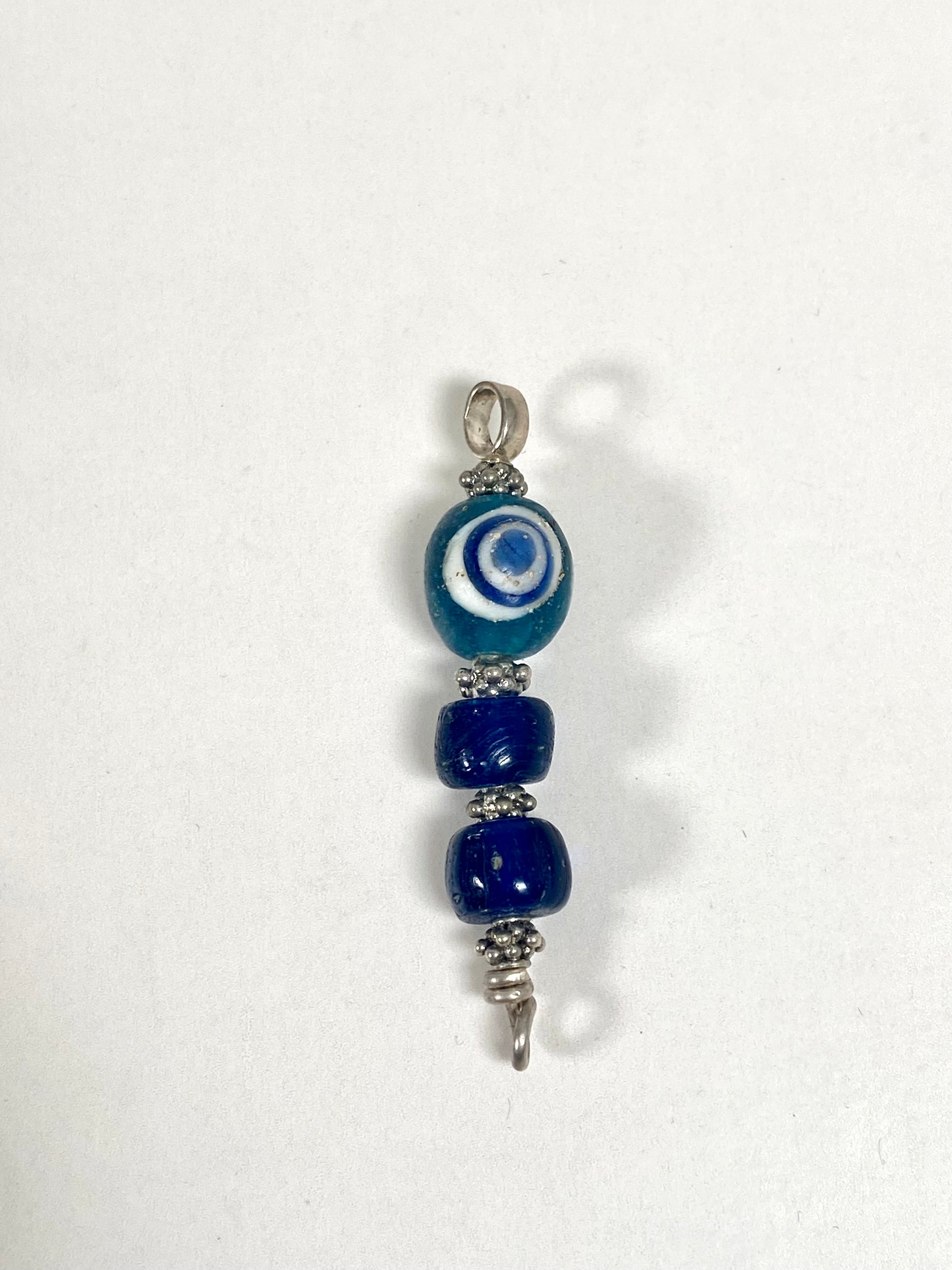 This particular listing is for a pendant featuring a turquoise millefiori eye beads with white and cobalt details, as well as two Indo-Pacific beads. The top bead features four millefiori eyes, and showcase unique hand-rolled characteristics to each segment. They are set in sterling silver, including modern spacer beads which help protect the bead’s integrity, and it is marked 925 on the bail.