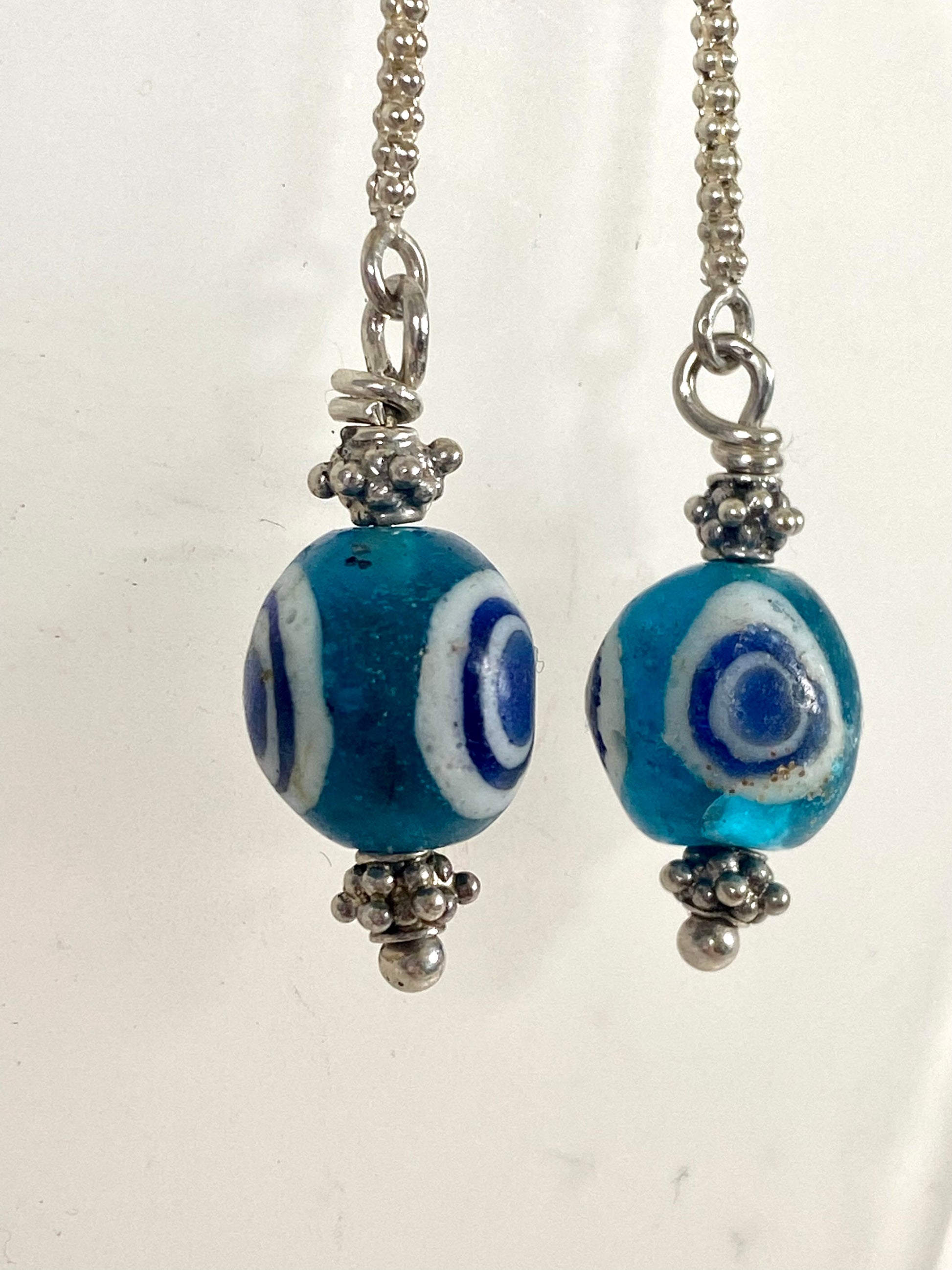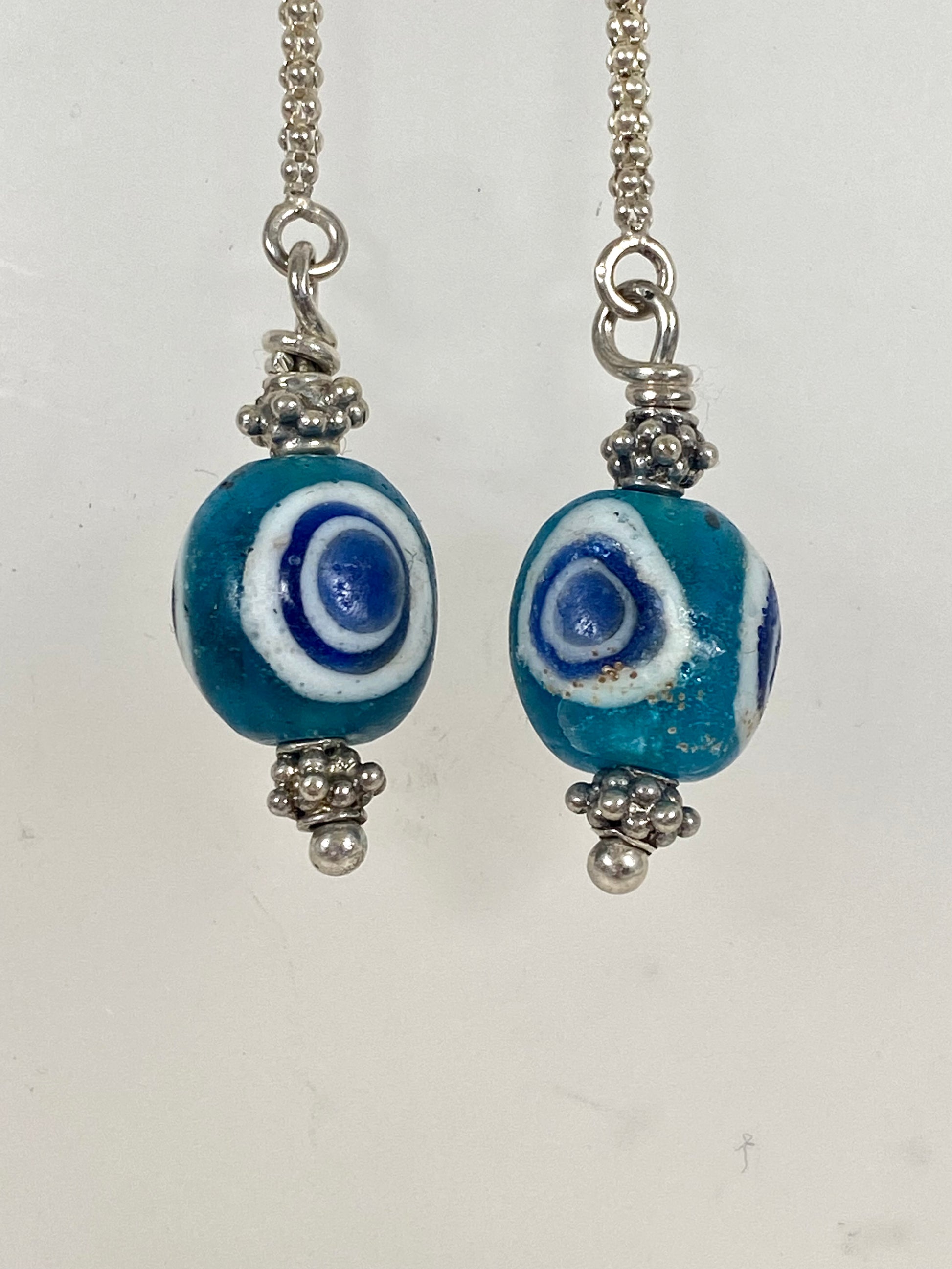 Ancient / Antique Javanese Trade Beads- Turquoise Millefiori Eye Bead Earrings circa 10th to 14th century w Sterling Silver