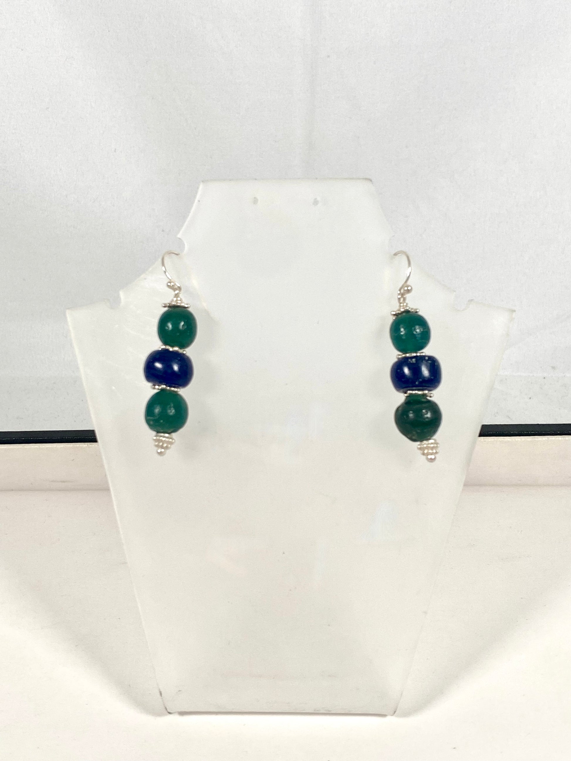Ancient Javanese Trade Beads-Blue and Green Indo-Pacific Glass Bead Earrings w Sterling Silver