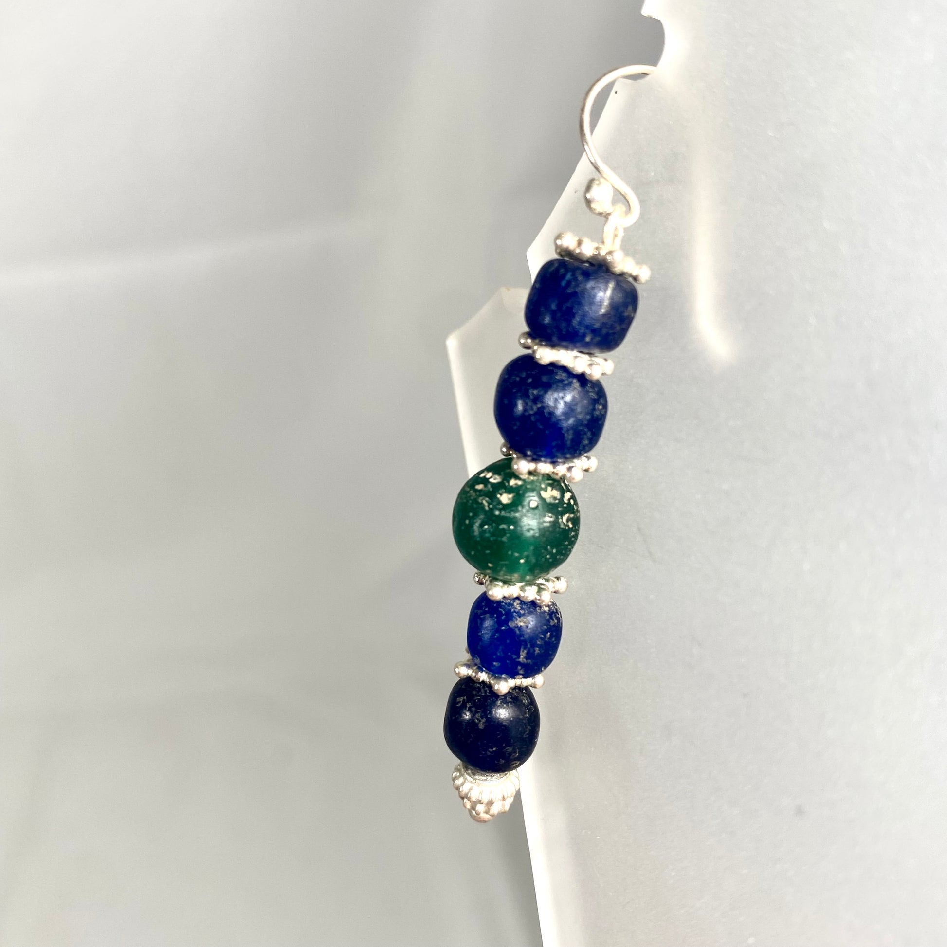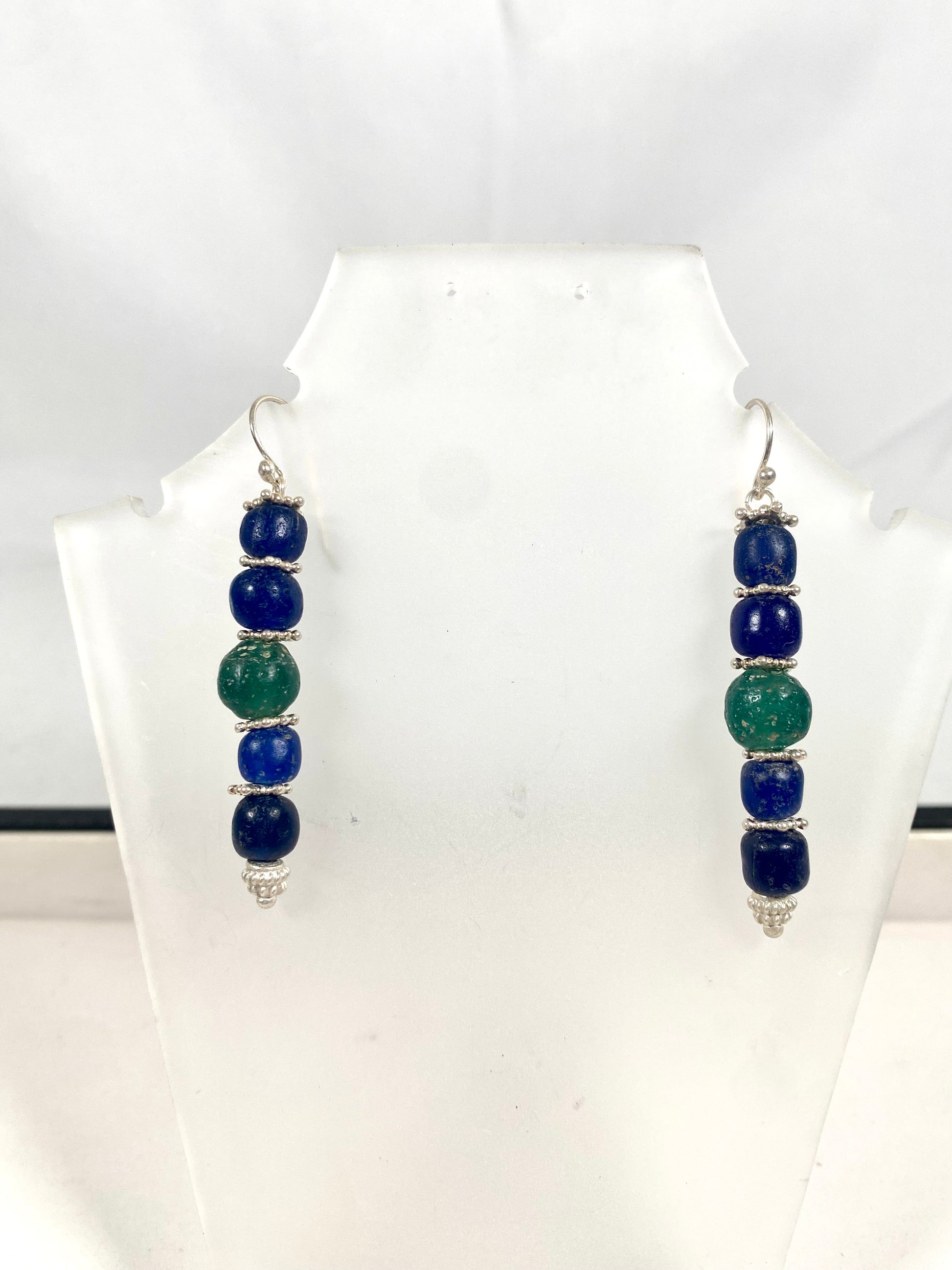 Ancient Javanese Trade Beads-Blue and Green Indo-Pacific Glass Bead Earrings w Sterling Silver