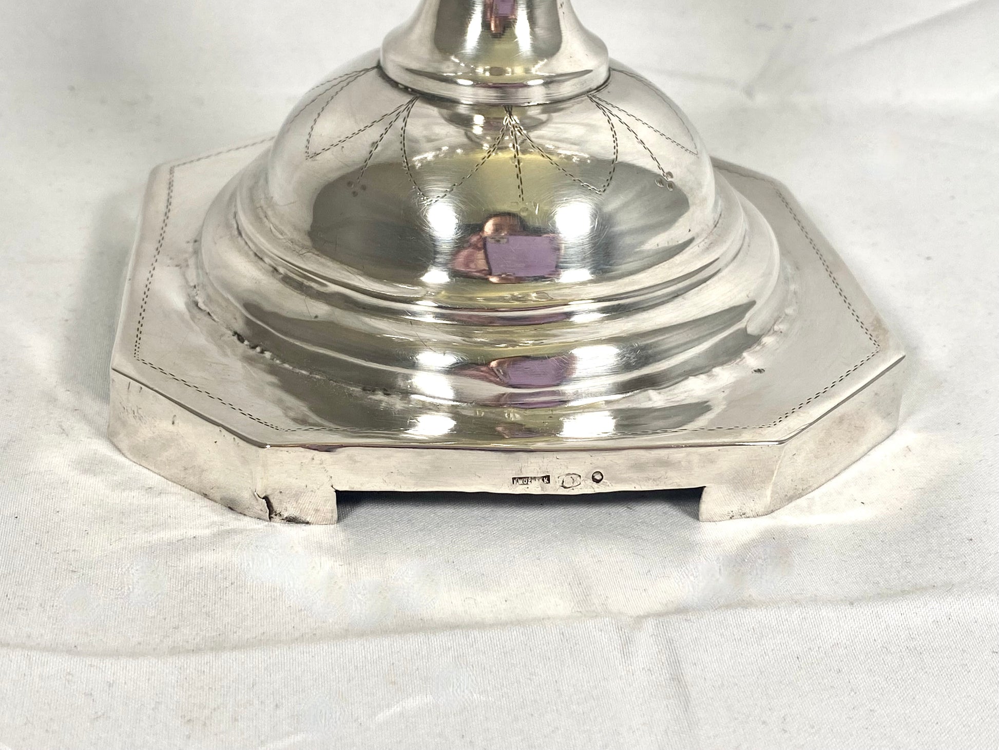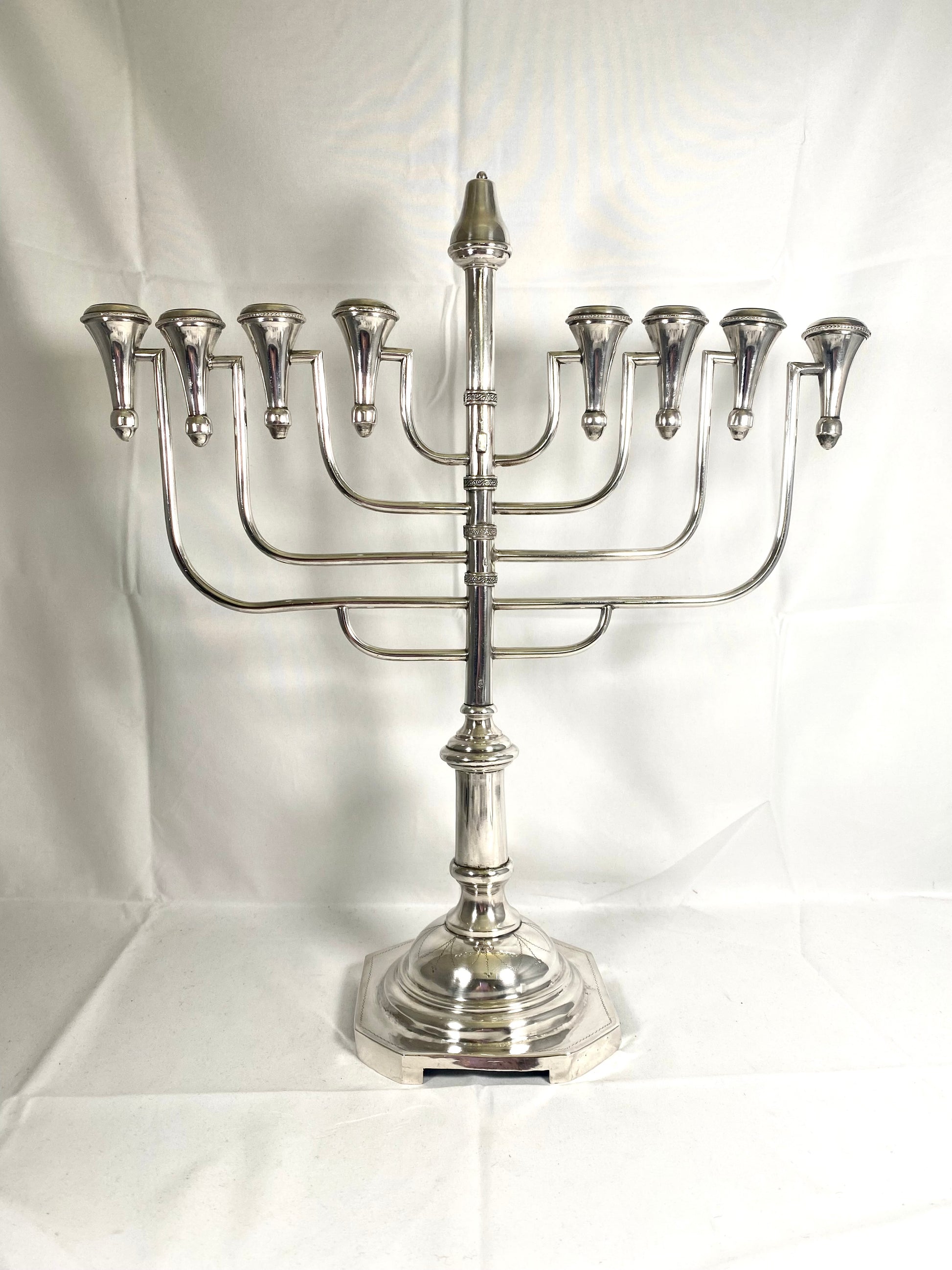 A lovely and substantial antique 8 light Polish .800 silver menorah, with marks indicating it is circa 1920-31. A Hanukkah menorah or Hanukkiah is lit during the eight days of the Jewish holiday, with the lit candles increasing with each day. An elegant, meaningful piece.