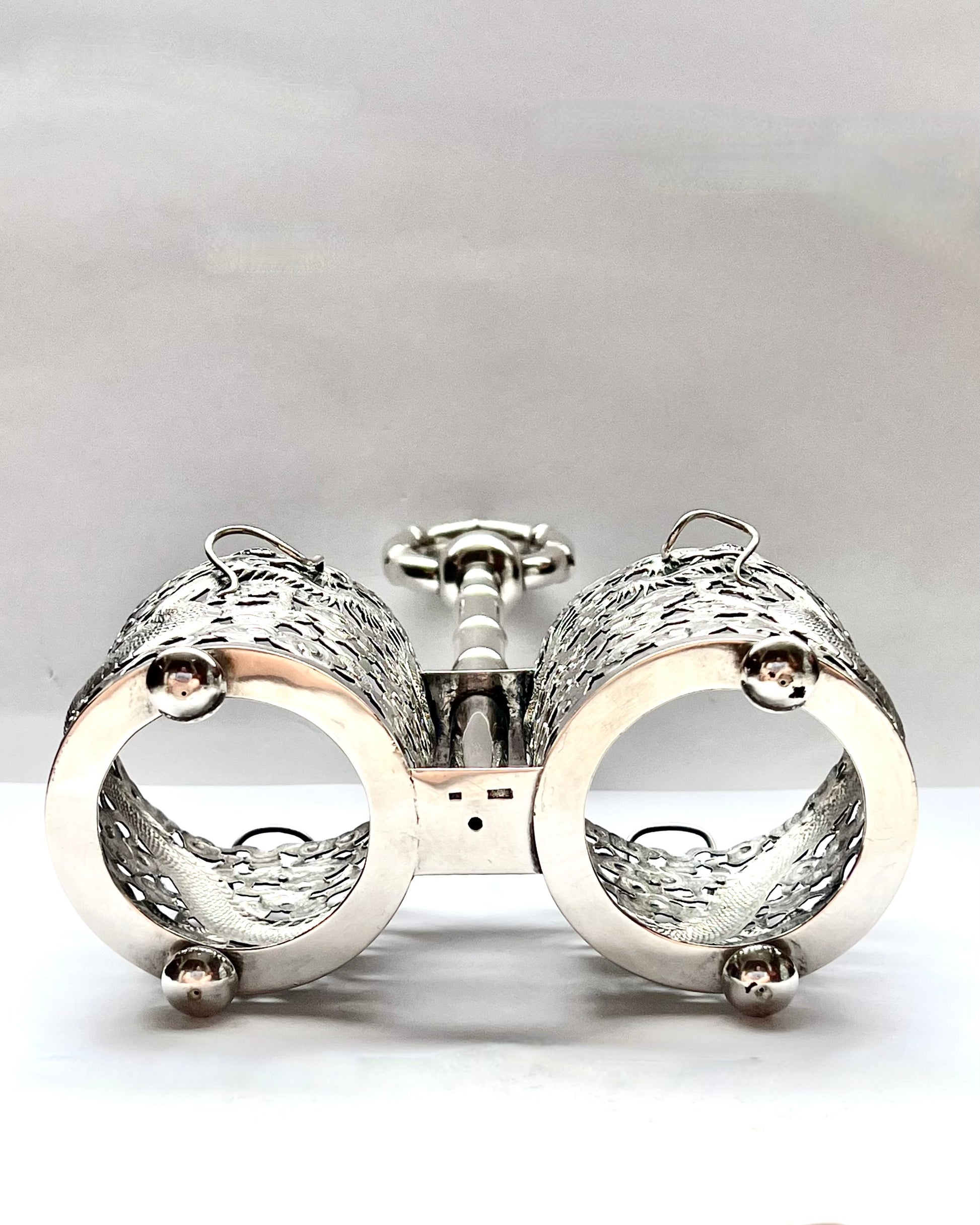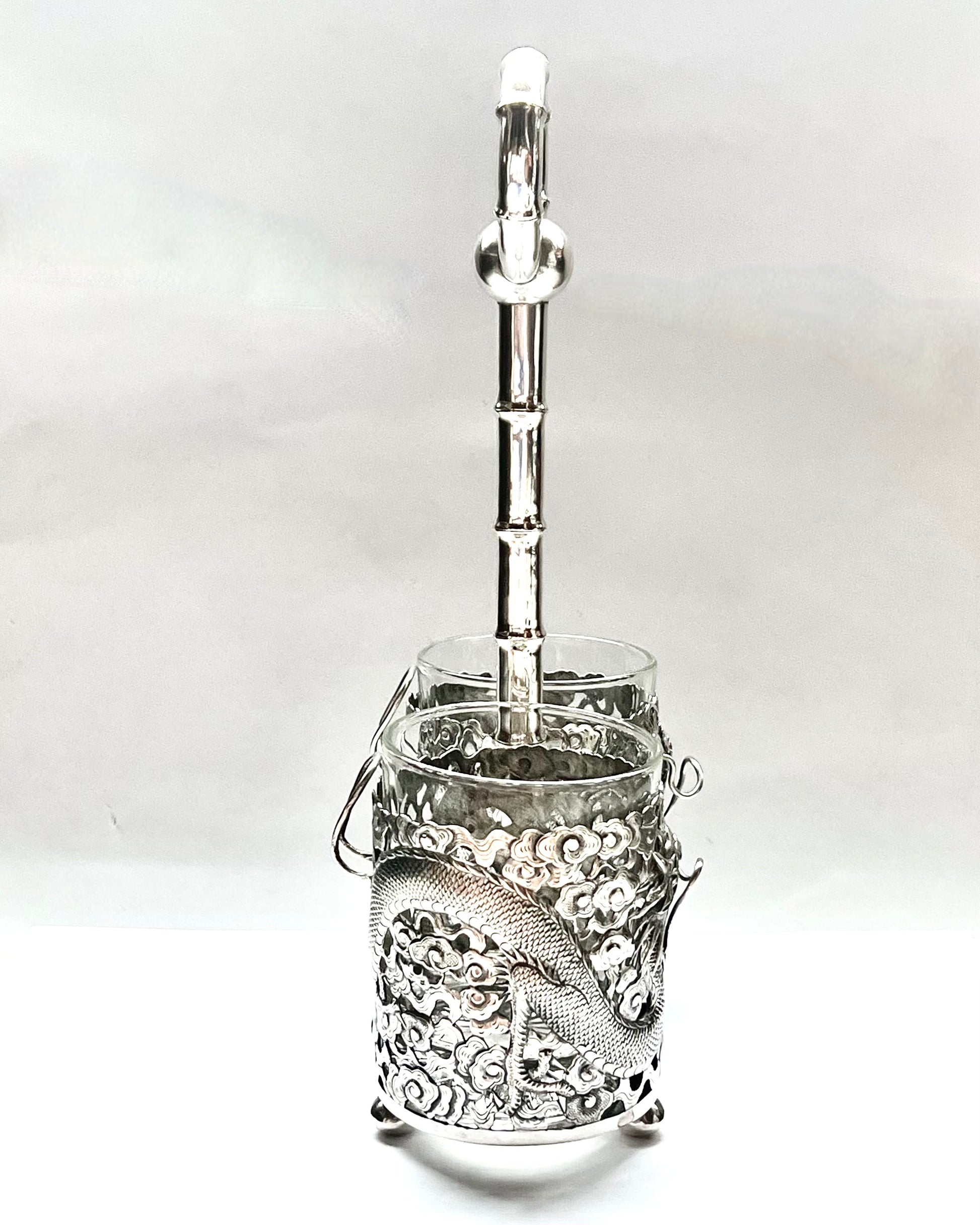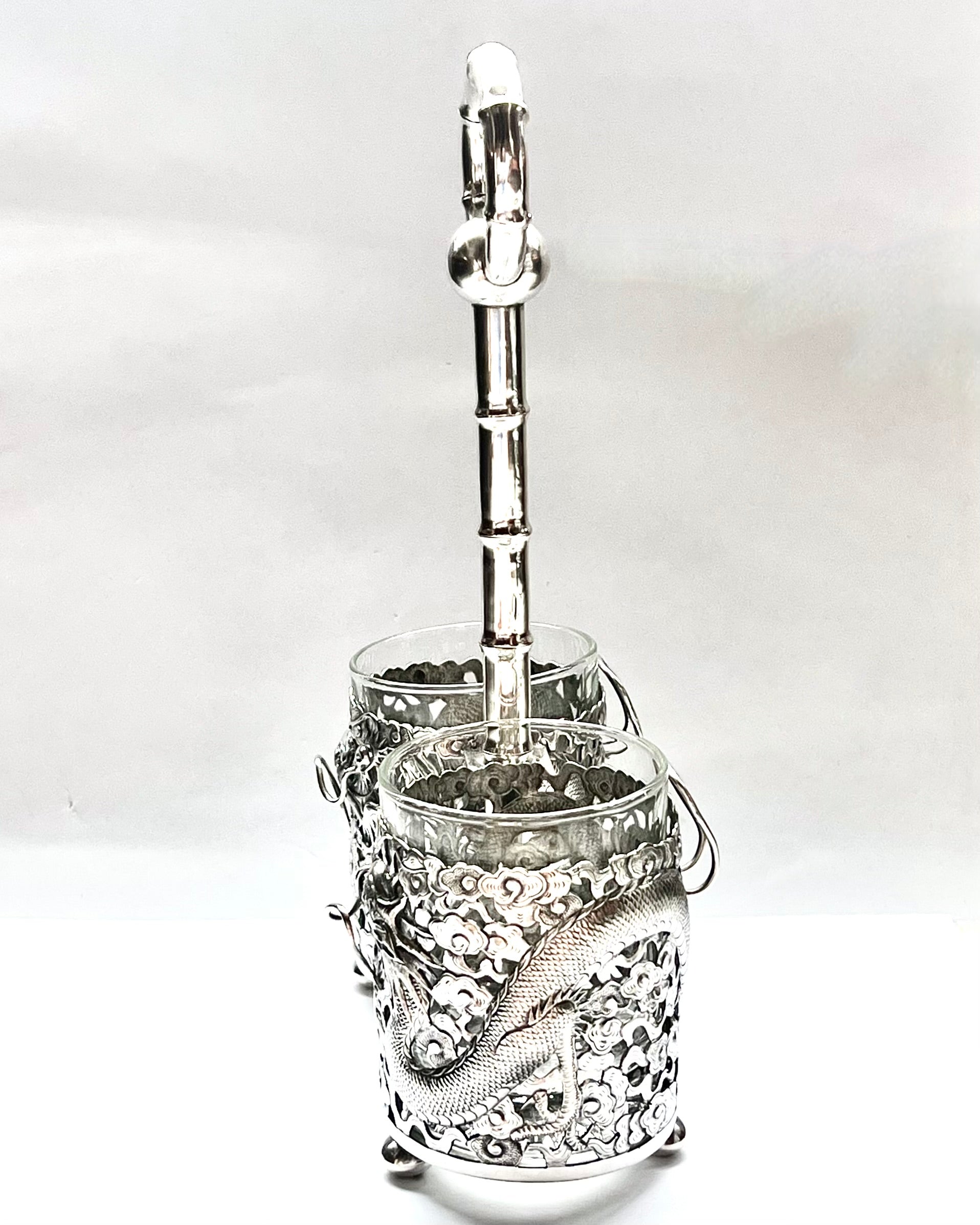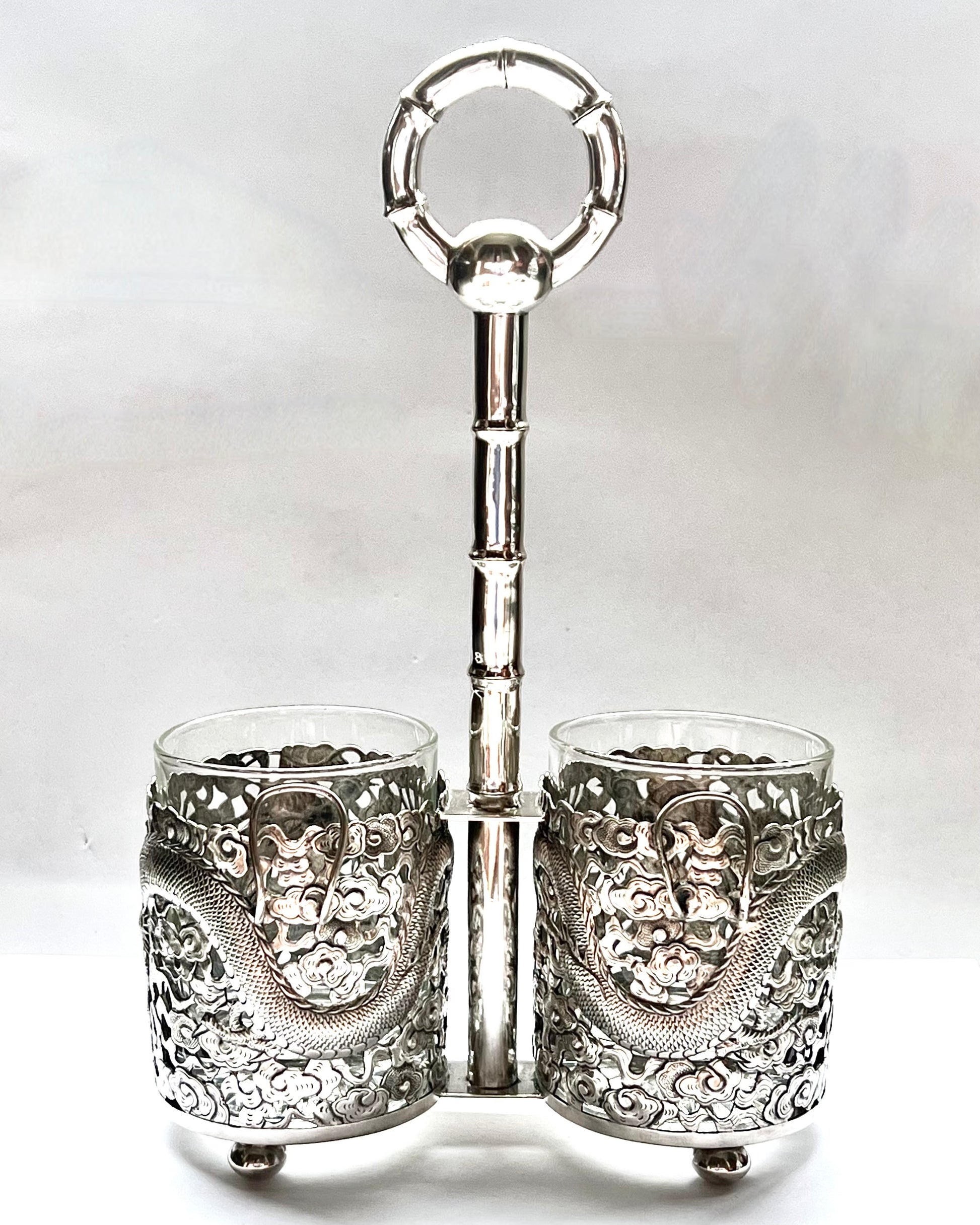 Here we have a lovely antique Chinese export silver twin drinks or bottle holder with associated glasses, with marks for Shao Ying Tang and Zee Sung, circa 1920s to 1930s, Shanghai. Beautifully worked with auspicious motifs of dragons soaring amongst clouds. The craftsmanship is impeccable with etched details to the clouds as well as throughout the dragons’ bodies. This holder could be used to decorate any table, for instance uses could include candles, cut fresh flowers, cutlery, condiments and spices etc. Perfect for a whisky connoisseur, as well as for The Year of The Dragon.