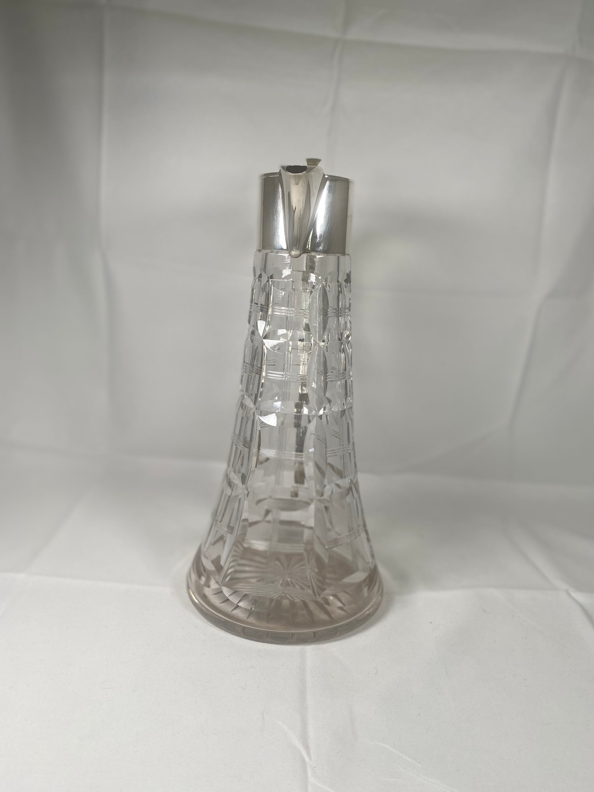 This stunning English Art Deco claret jug with sterling silver mounts was made in Sheffield, 1922. Made by premier silver makers Walker & Hall, this is of excellent quality and timeless style.
