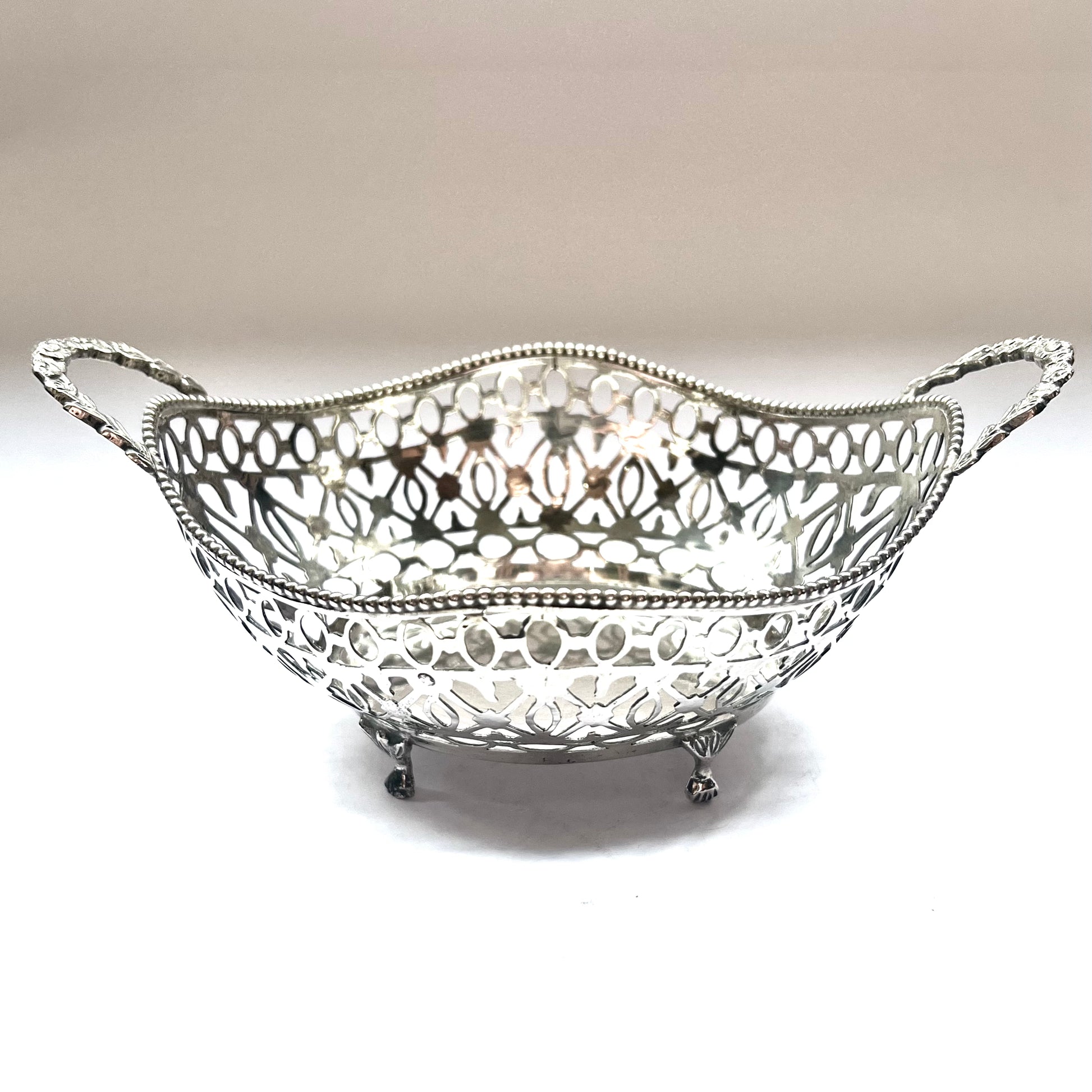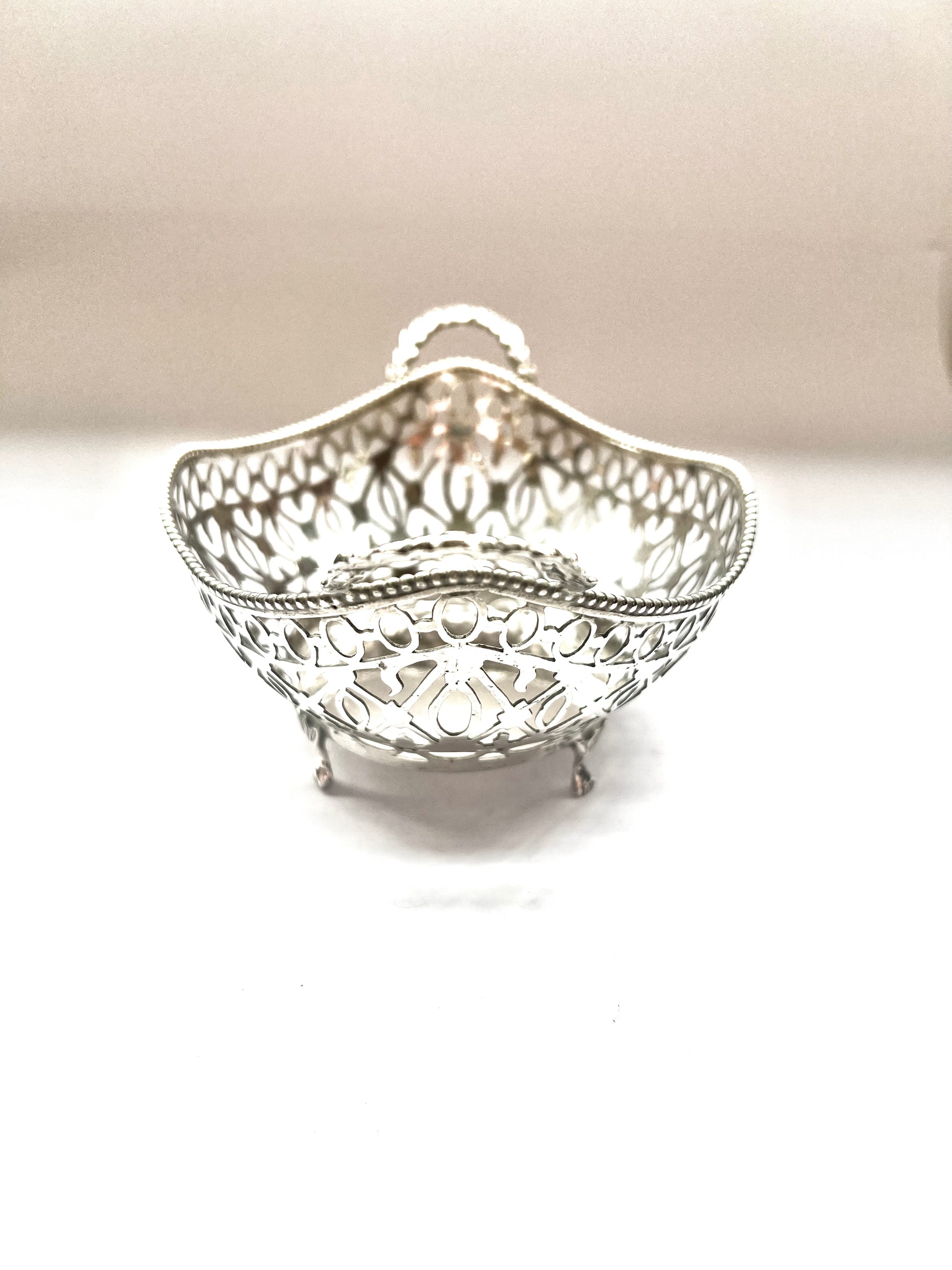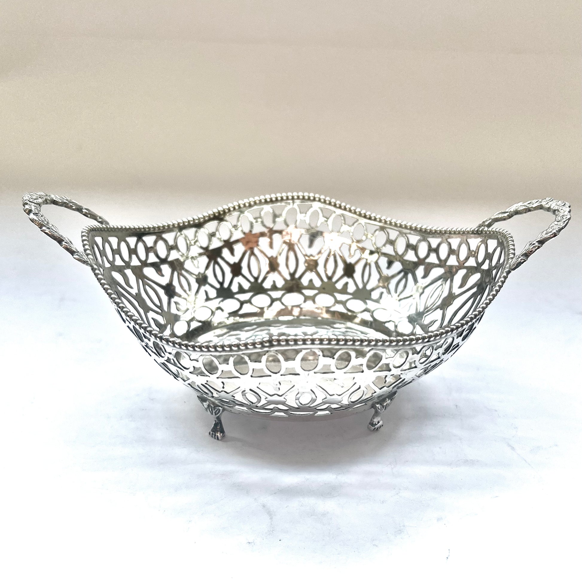 Beautiful antique Dutch .833 silver basket with pierced Art Nouveau design, with marks for 1914, maker’s mark J.P. Beautifully made with embossed floral designs to handles and 4 delicate claw feet.