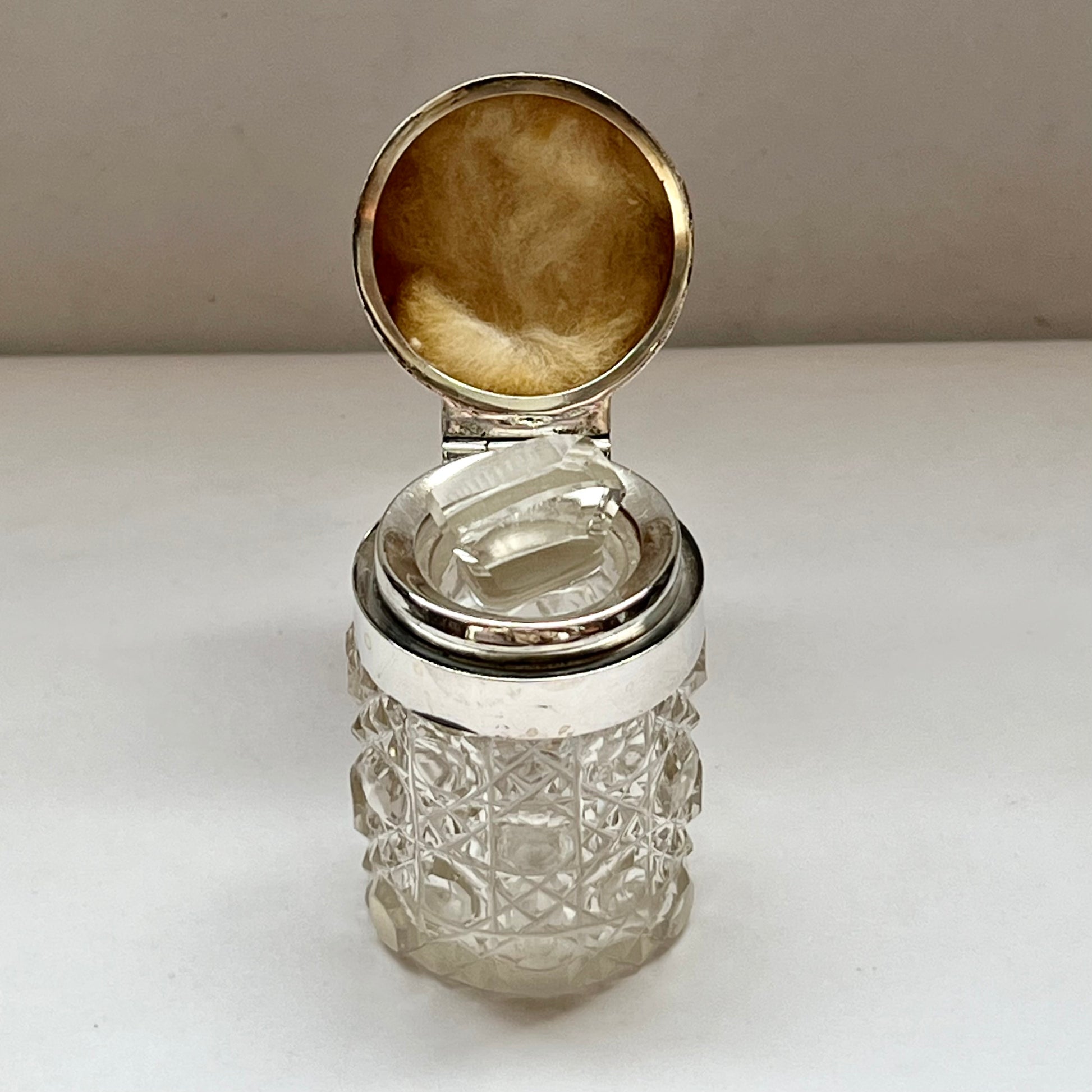Lovely antique Edwardian cut glass and sterling silver scent bottle, Birmingham 1910, G E Walton & Co Ltd (George Edwin Walton). It is in beautiful condition, with original stopper and the gilt-washed lid interior in excellent condition as well. Minor surface ding to lid as found but this is common with hollow silver of this age.