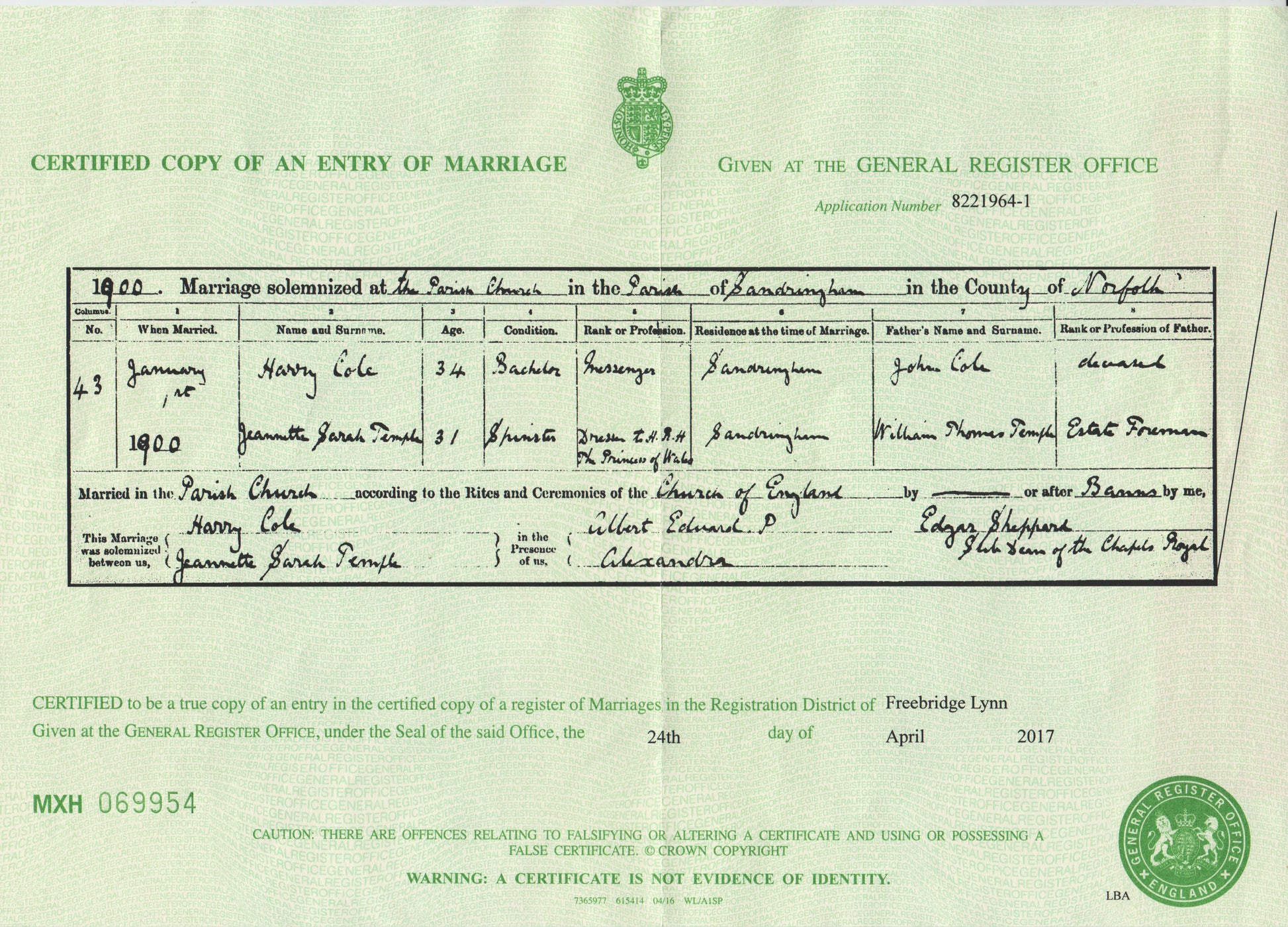 England and Wales Marriage Registration Index, 1837-2005," database, FamilySearch (https://familysearch.org/ark:/61903/1:1:26SH-HGM : 13 December 2014), Jeannette Sarah Temple, 1900; from “England & Wales Marriages, 1837-2005,” database, findmypast (http://www.findmypast.com : 2012); citing 1900, quarter 1, vol. 4B, p. 493, Freebridge Lynn, Norfolk, England, General Register Office, Southport, England.