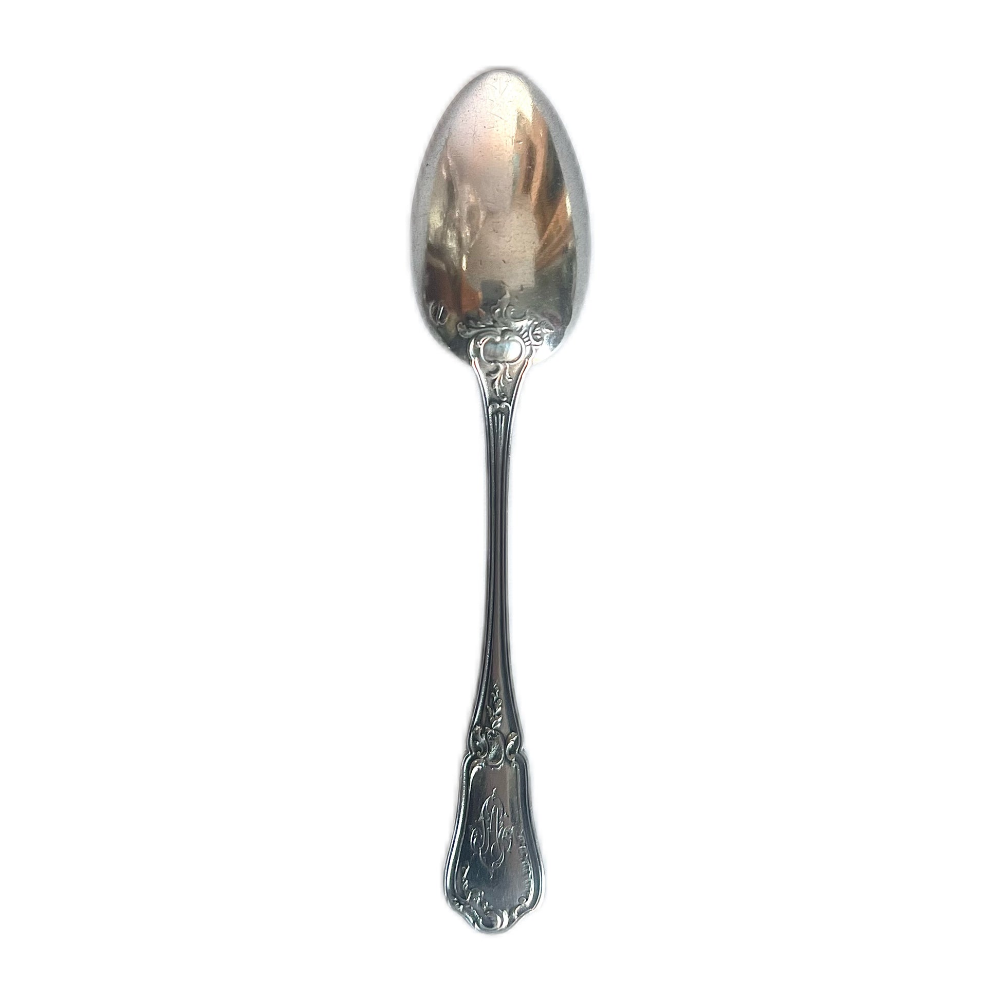 Beautiful antique French First Standard .950 silver teaspoon, monogrammed to the reverse in French manner of the period.