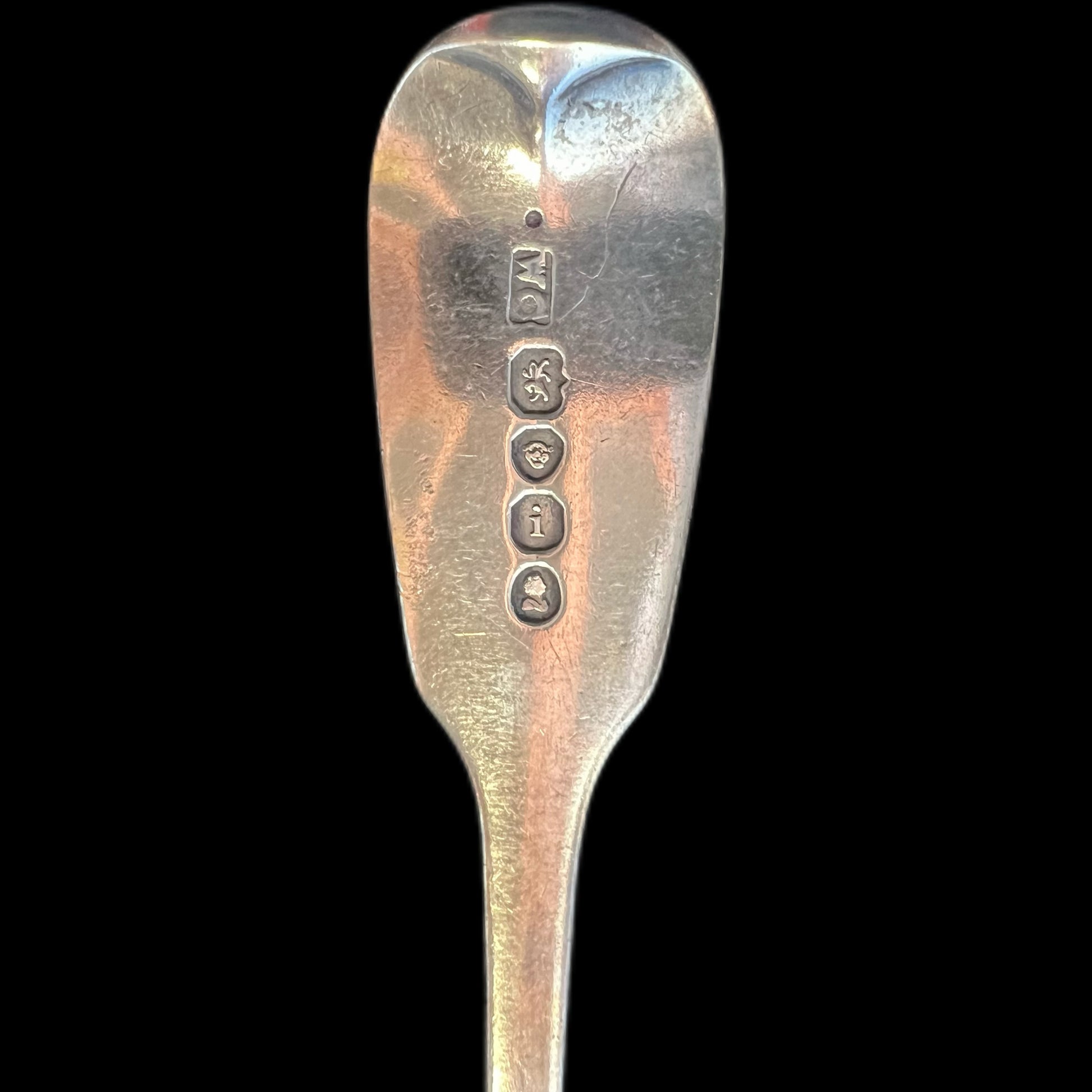 This antique George IV sterling silver fiddle & thread spoon has marks for London, 1824, William Chawner II. Chawner was active from 1815 to 1833. His wife Mary would later become an accomplished silversmith as well, and their children would go on to become some of England’s finest silversmiths.