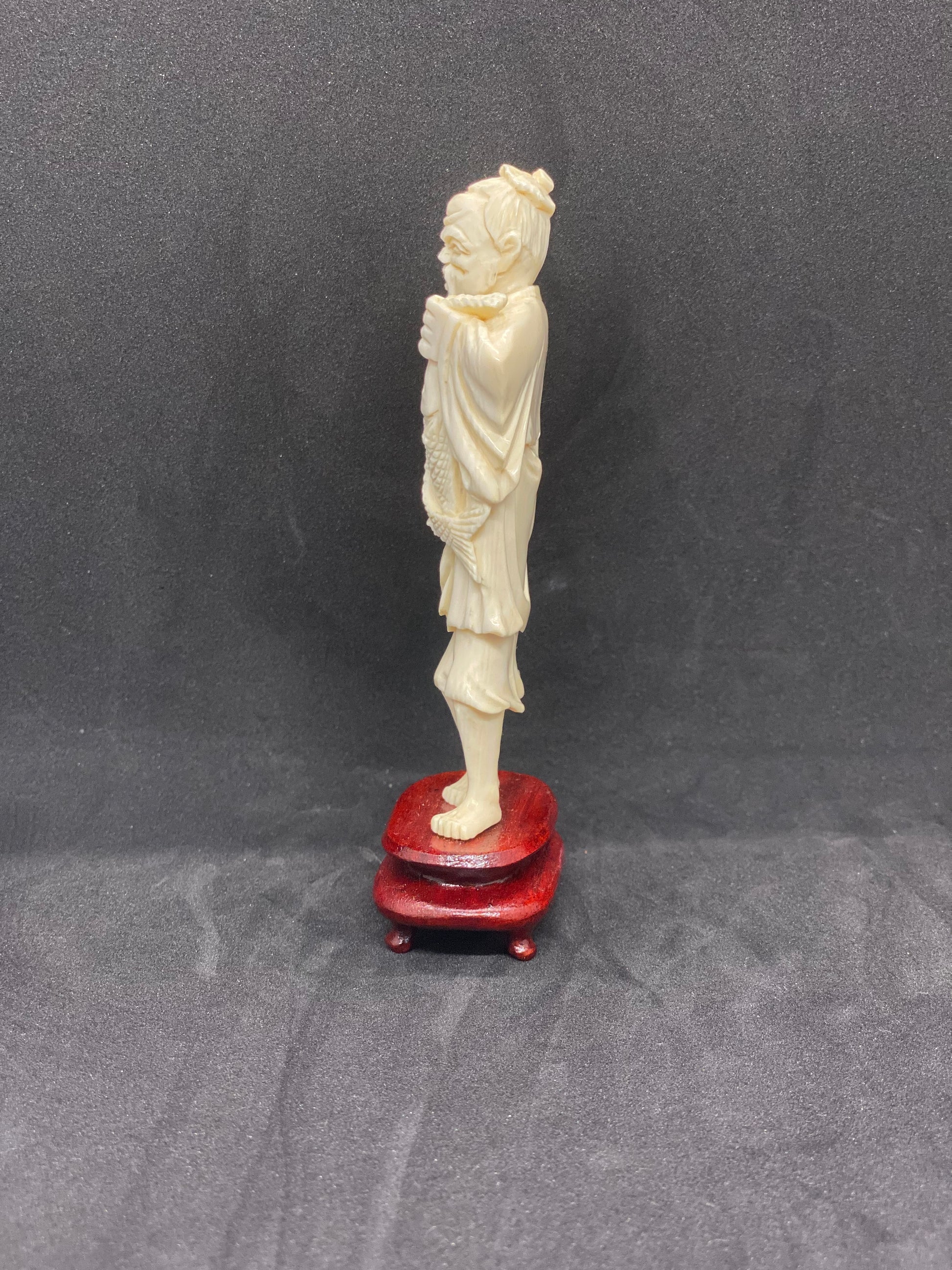 Fisherman holding fish; nicely executed smile as the old man holds his catch aloft. Well carved facial features and beaming expression.
