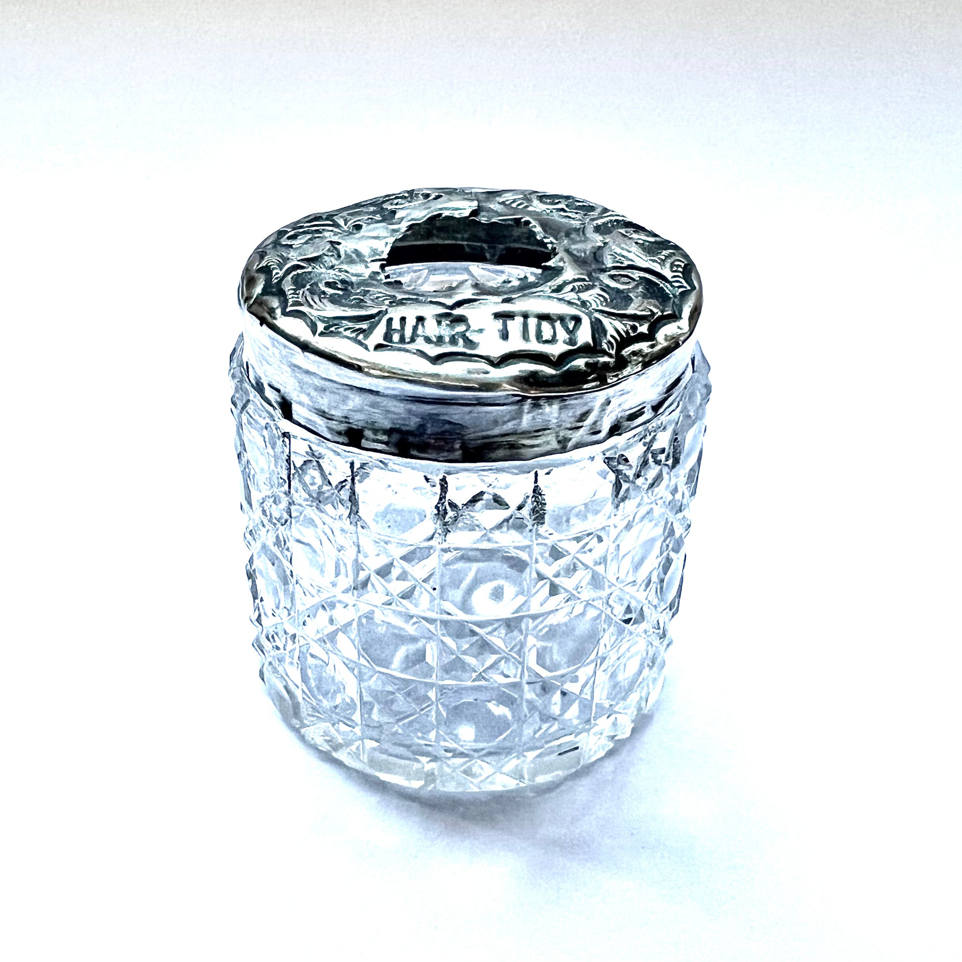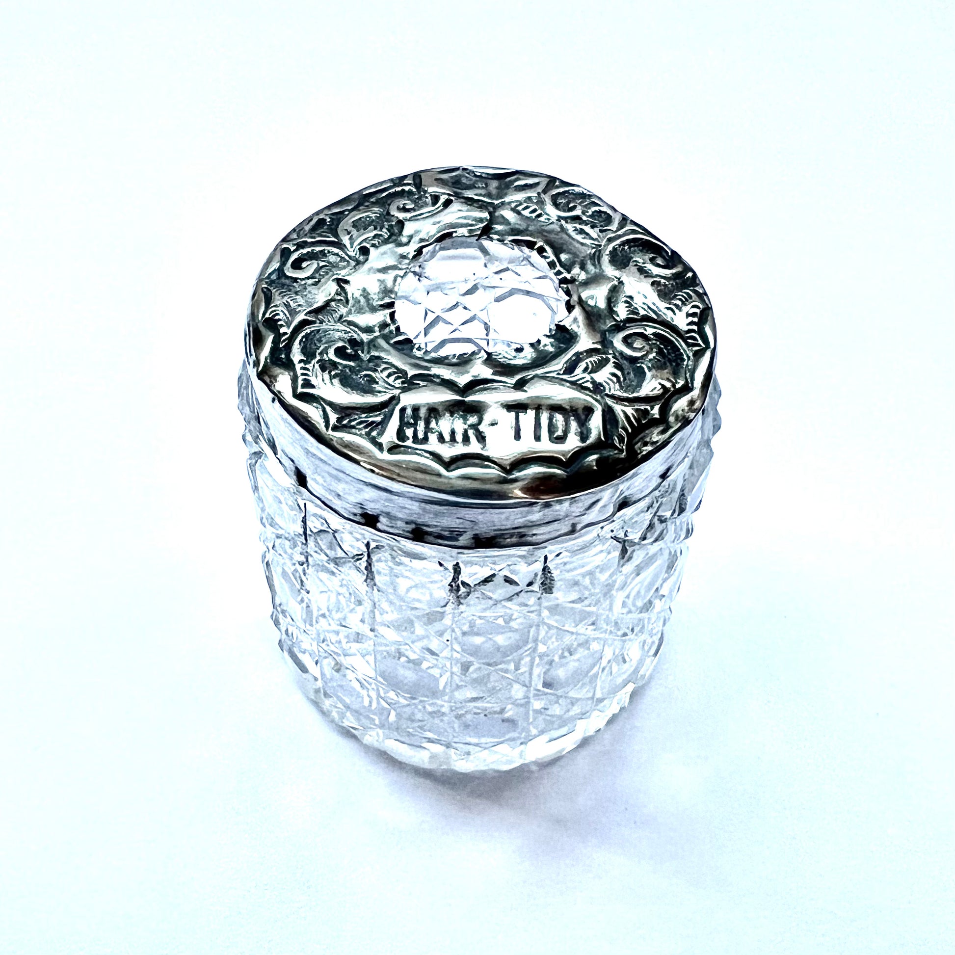 Charming antique sterling silver and crystal hair tidy circa London, 1907. Repousse motifs to the top, as well as the letters HAIR TIDY in elegant font.