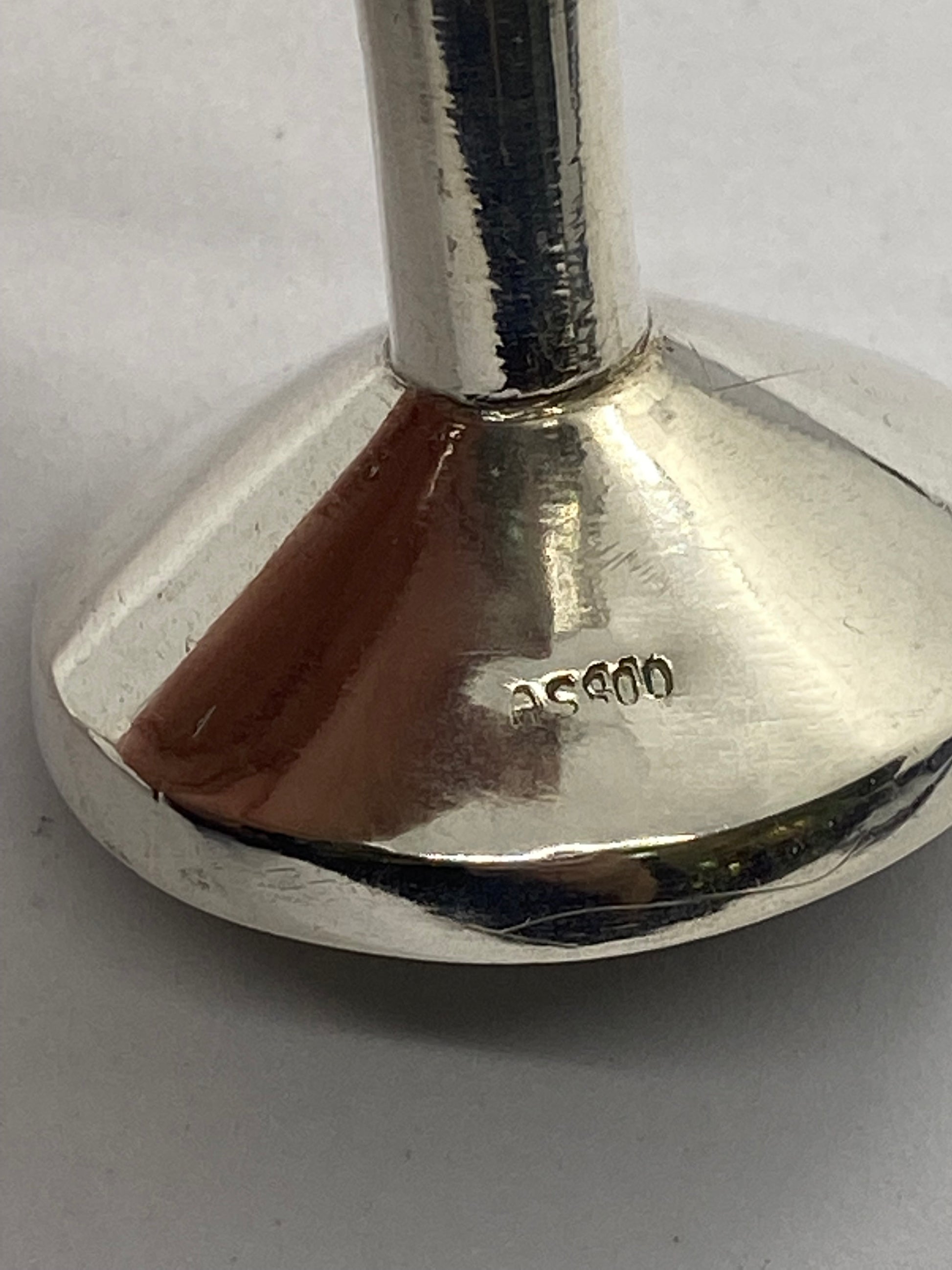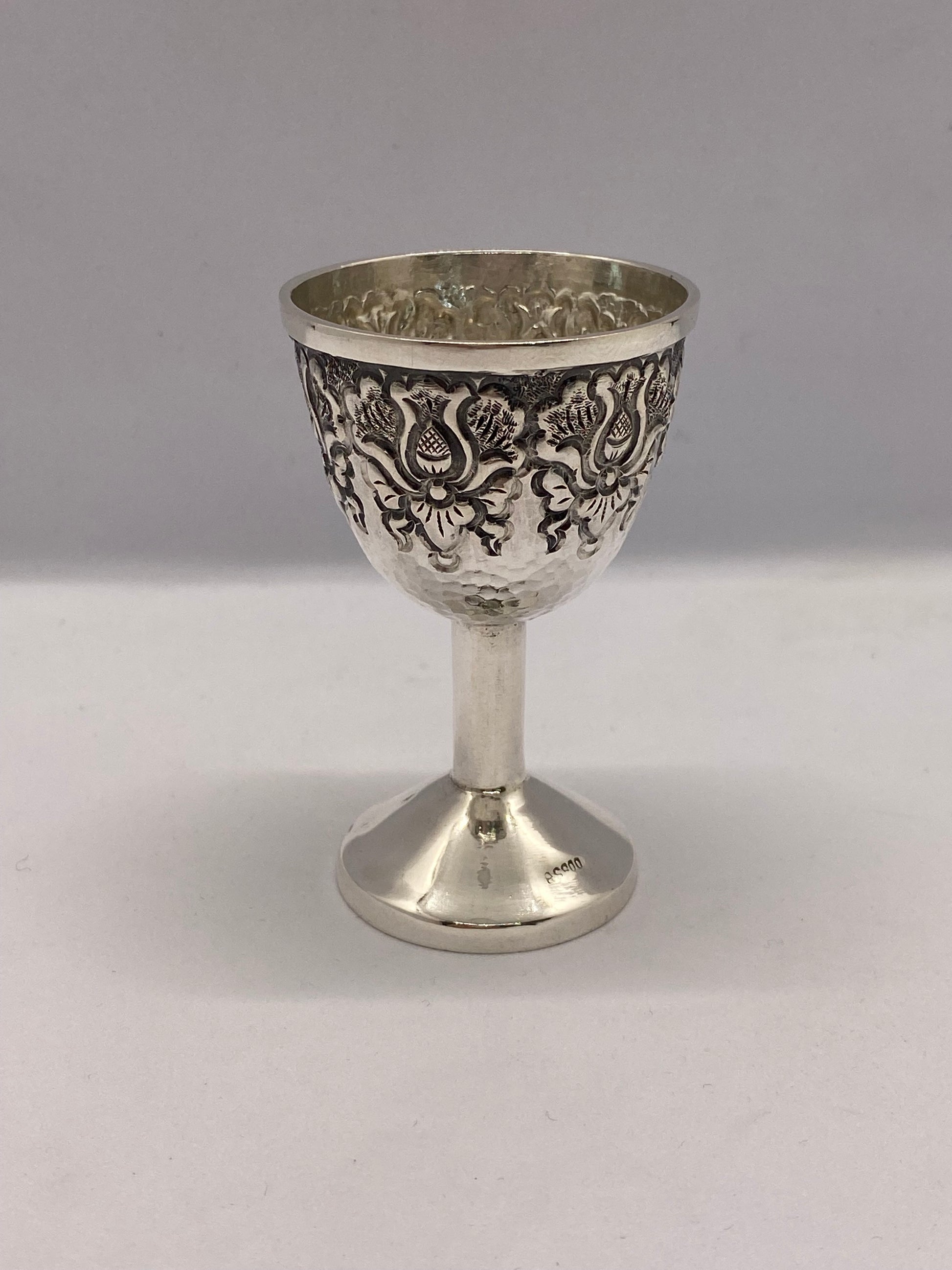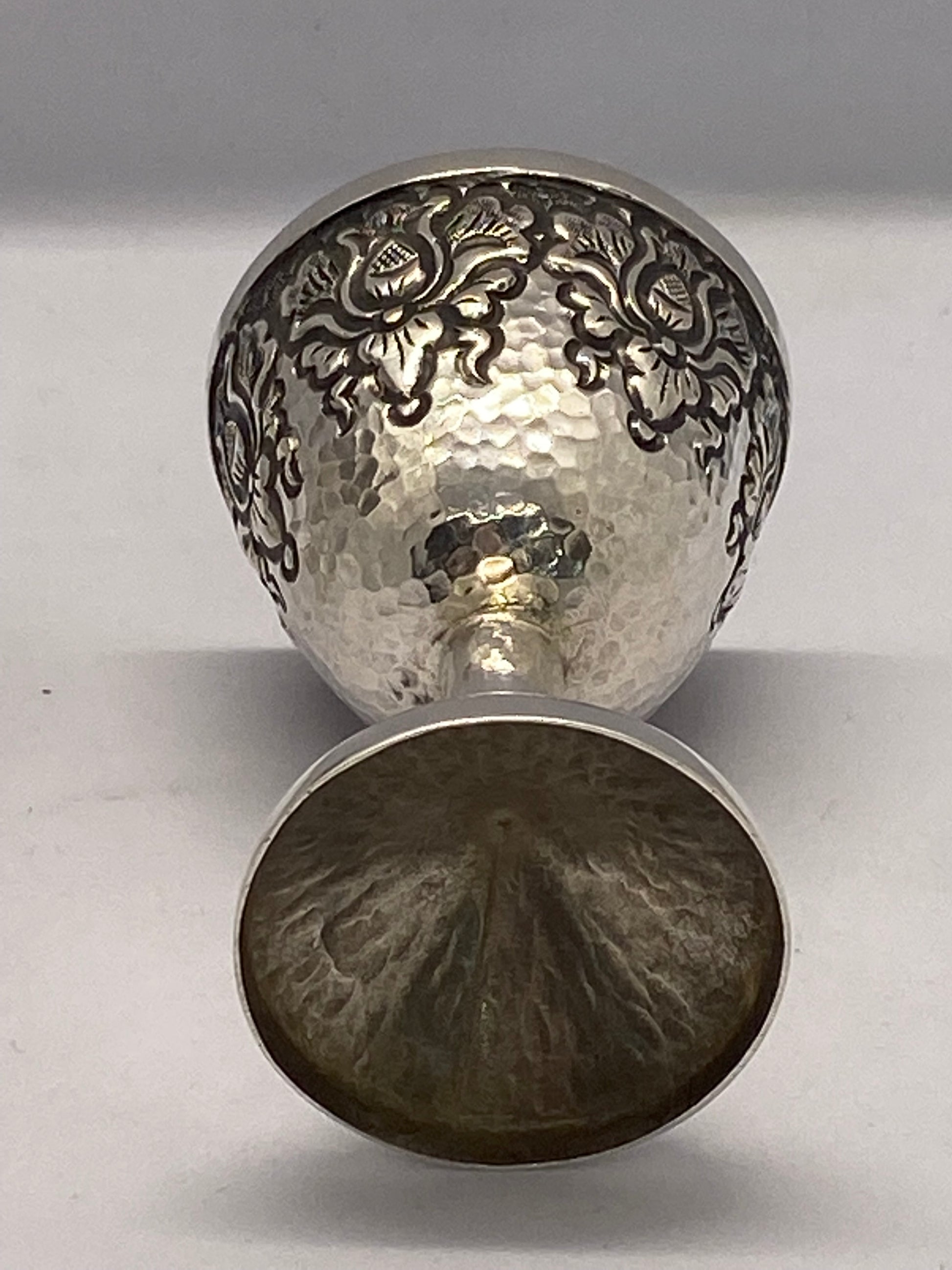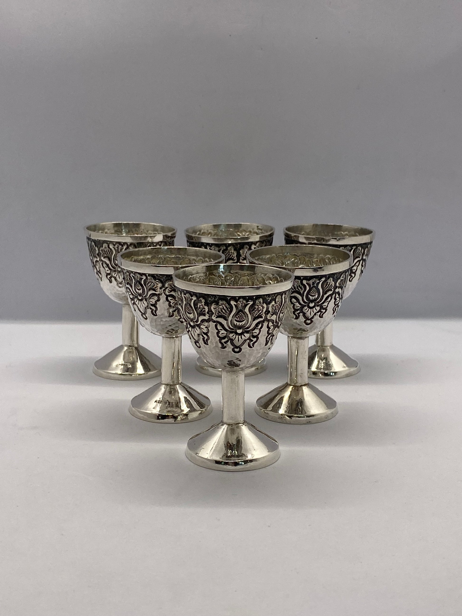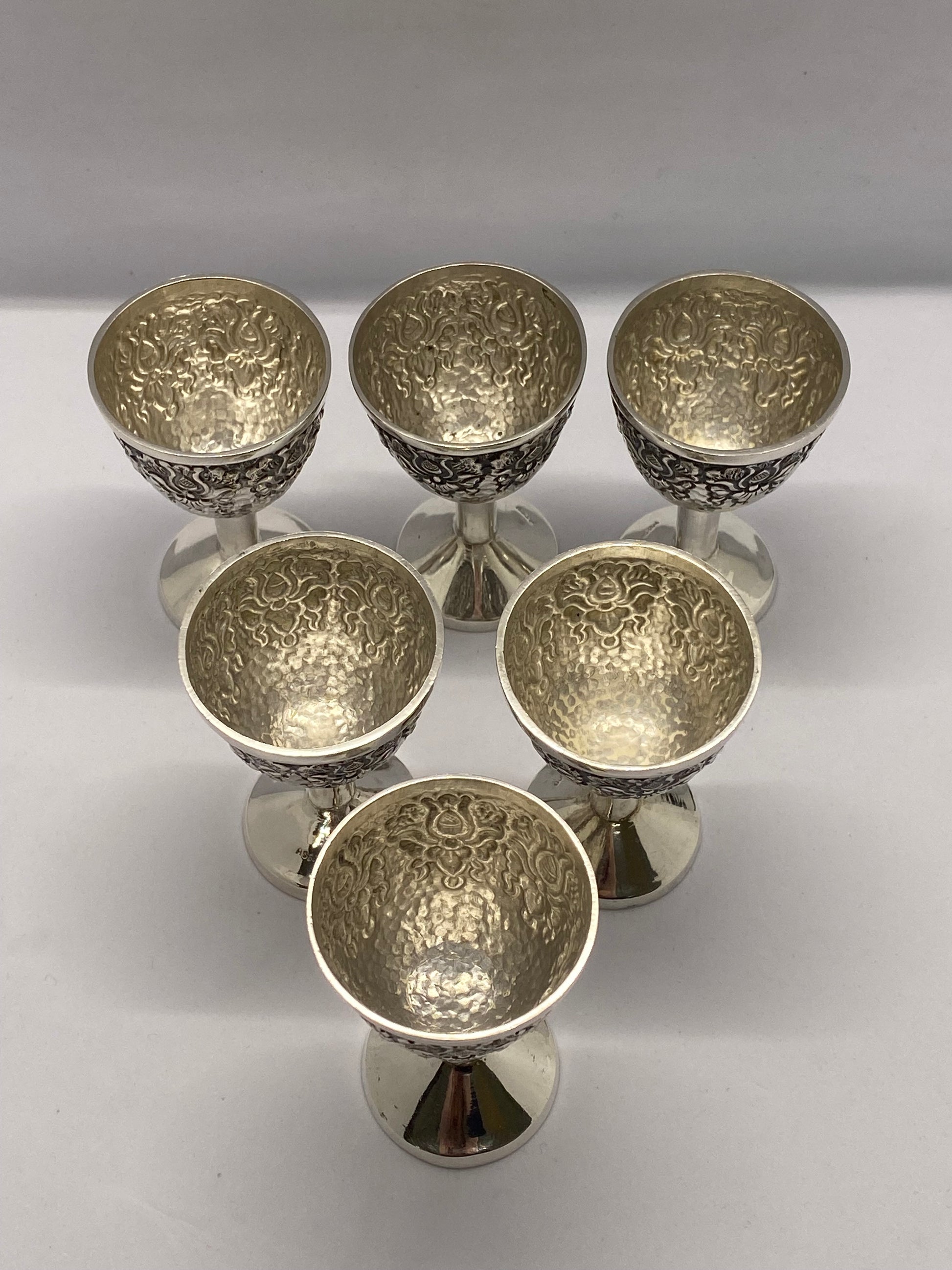A lovely set of 6 Continental silver liquor glasses with beautifully done repousse work. But perhaps the crowning detail is the hand-hammered details which can be seen to both the interior and exterior of the cups; absolutely beautiful texture both visually and in the hand. Perfect for sipping your aperitif of choice in. Hallmarks for AS800, indicating 800 standard silver. Circa first half of the 20th century.