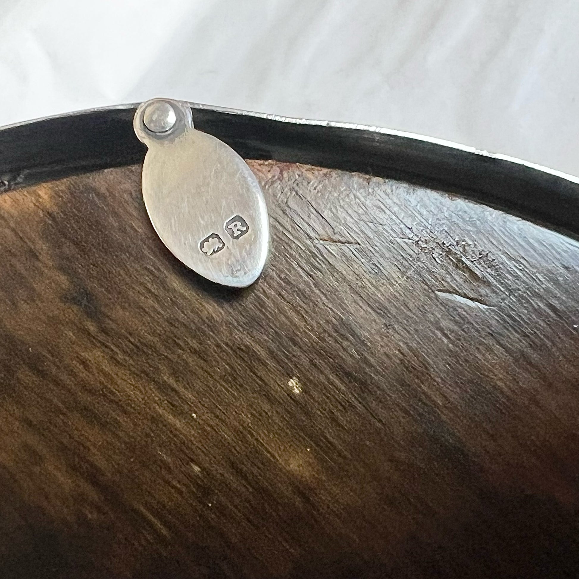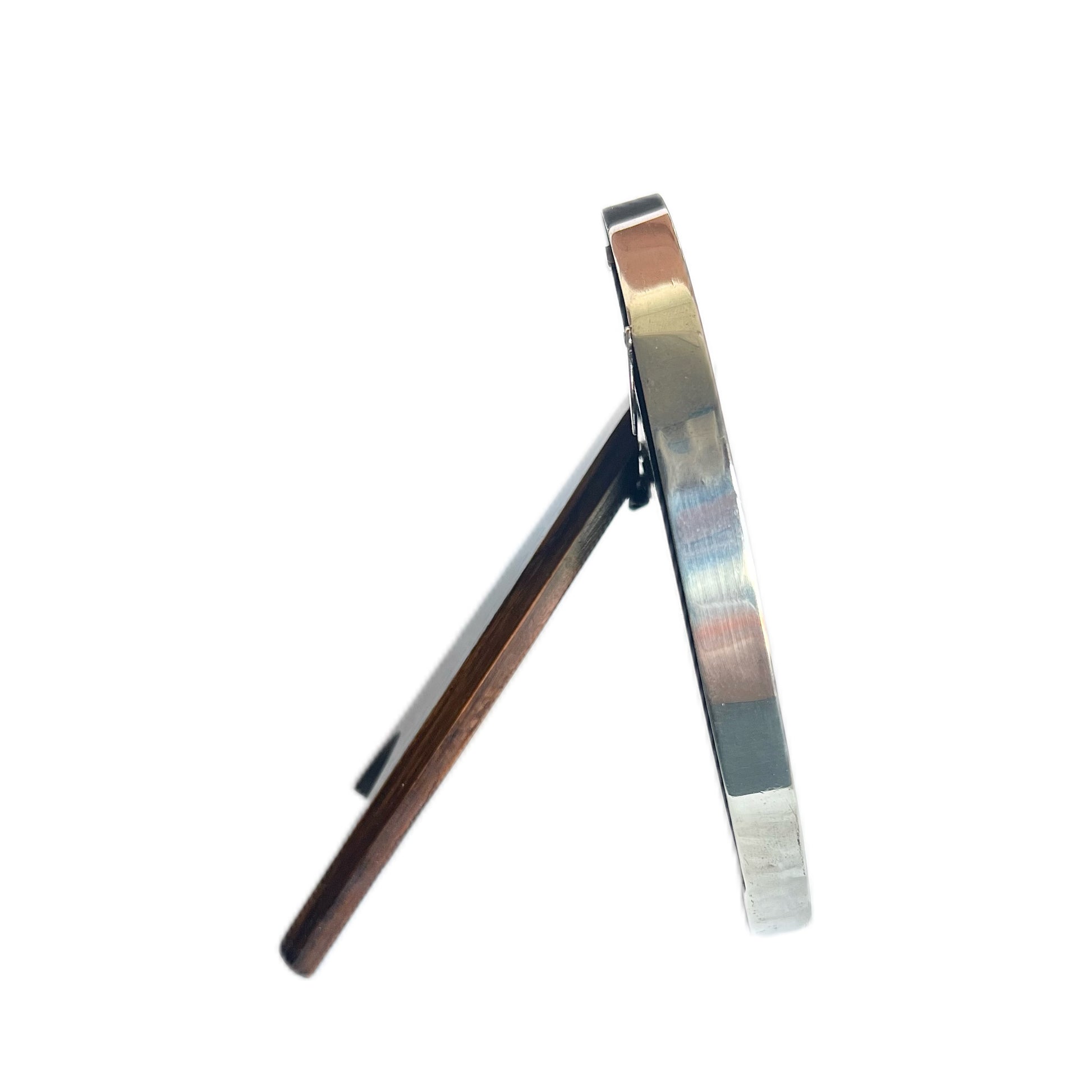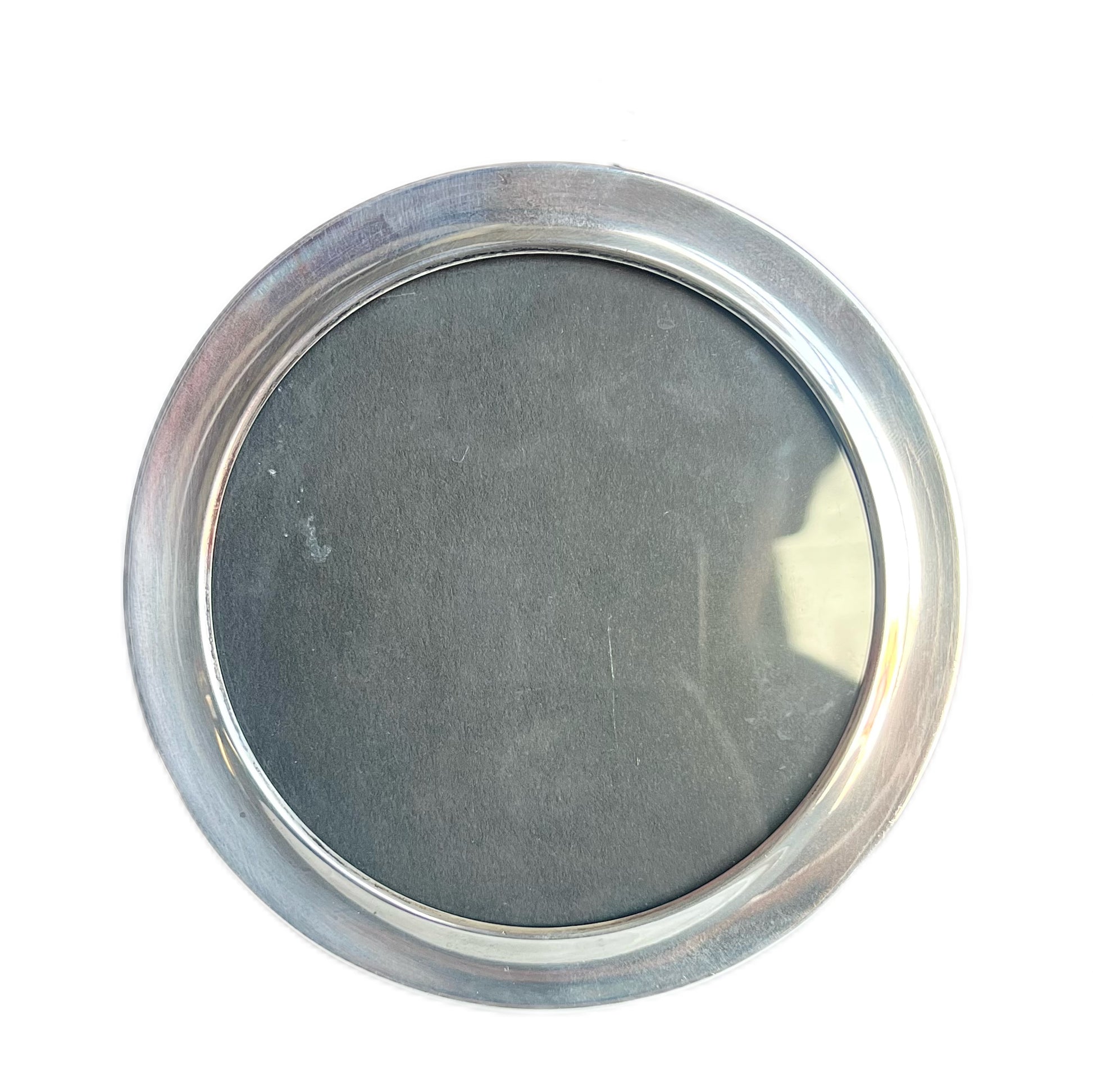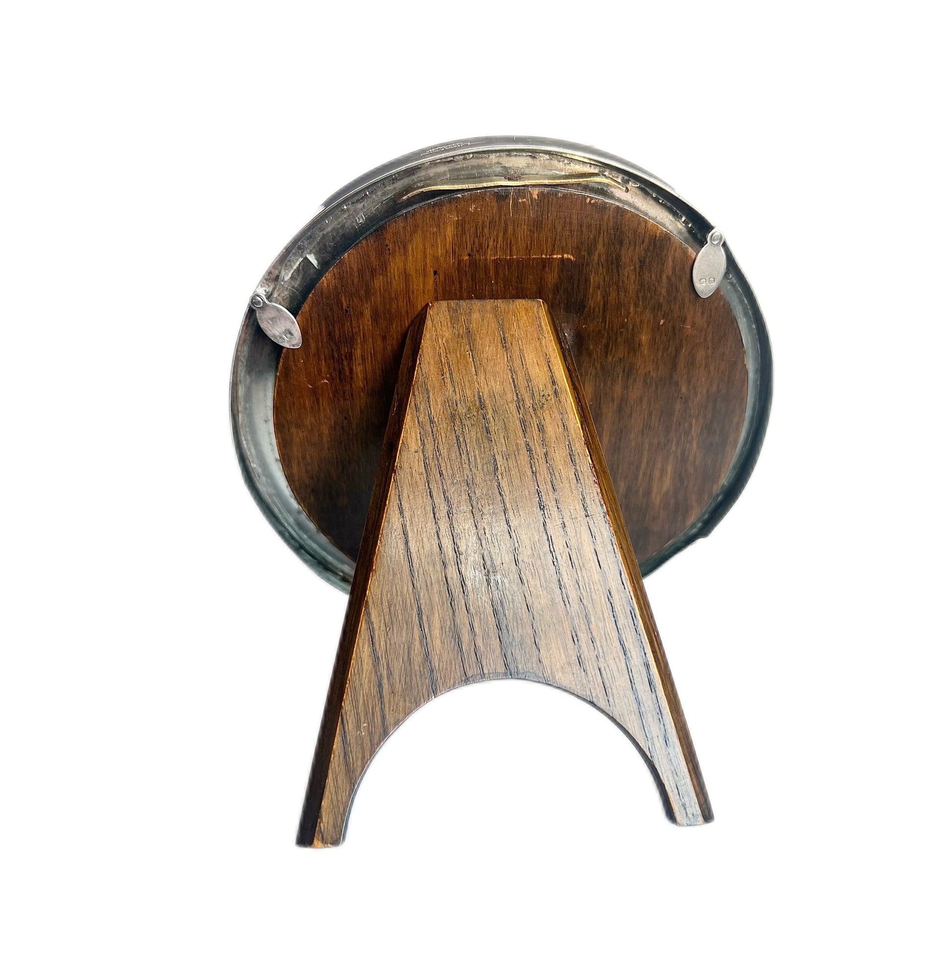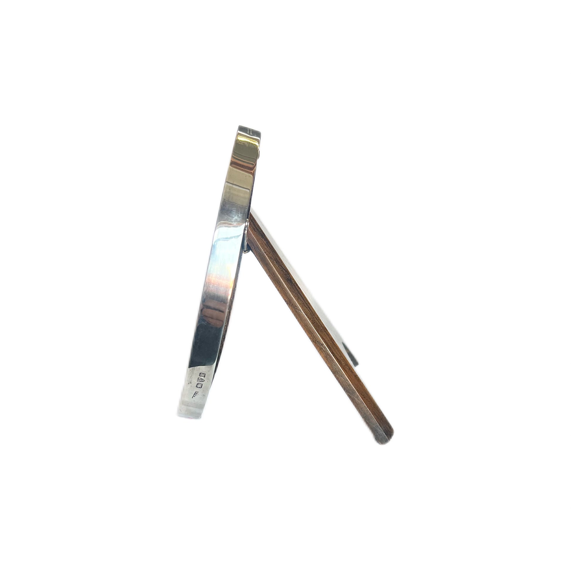 Elegant and timeless round sterling silver and timber Victorian photo frame with marks for Chester, 1900, Stokes & Ireland Ltd. A partnership between William Henry Stokes and Arthur George Ireland that was active from 1891 to 1939, whose premises were on Great Hampton Street, Birmingham. Marked to the top for Hardy Brothers in Sydney and Brisbane, where it would have been retailed during that period.
