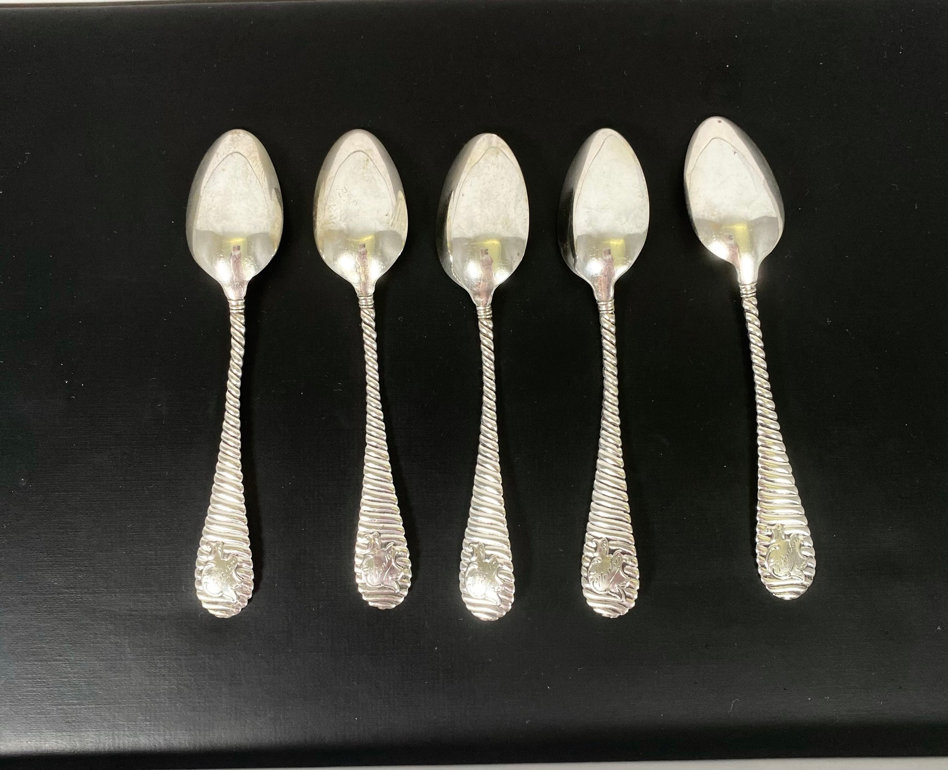 A lovely set of antique Viennese silver spoons with rope twist handles. Assay Marks for Austria-Hugnary circa 1872-1922, with the Dog Head mark which stands for .800 silver.