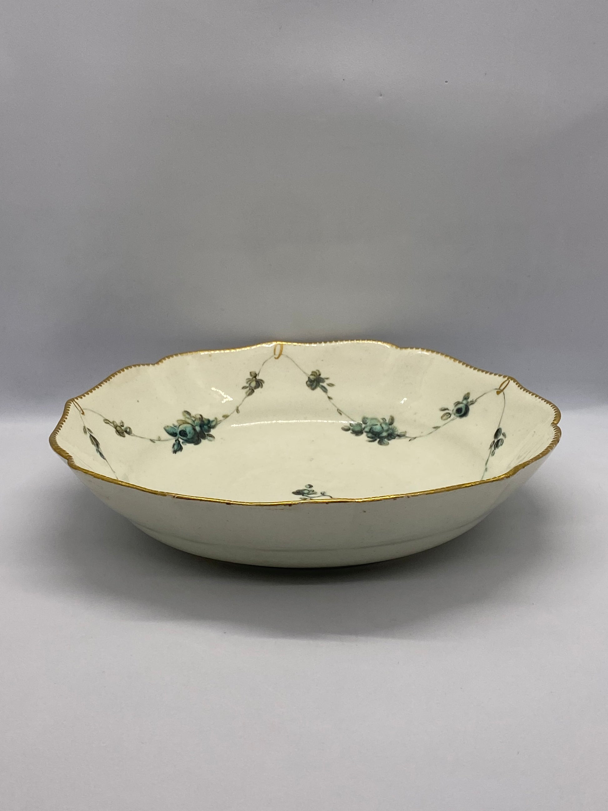 Here you can see the lobed bowl pattern, with a lovely shaped and gilded rim. Loosely executed swags of blue-green roses drape from gold rings; a really classic Regency style and a piece that will only increase in desirability over time. This is a particularly rare and desirable pattern; a teapot in this pattern is in the Met museum collection, while a punchbowl in this pattern was estimated by Bonham to be between £1,000 - £1,200 in 2009.