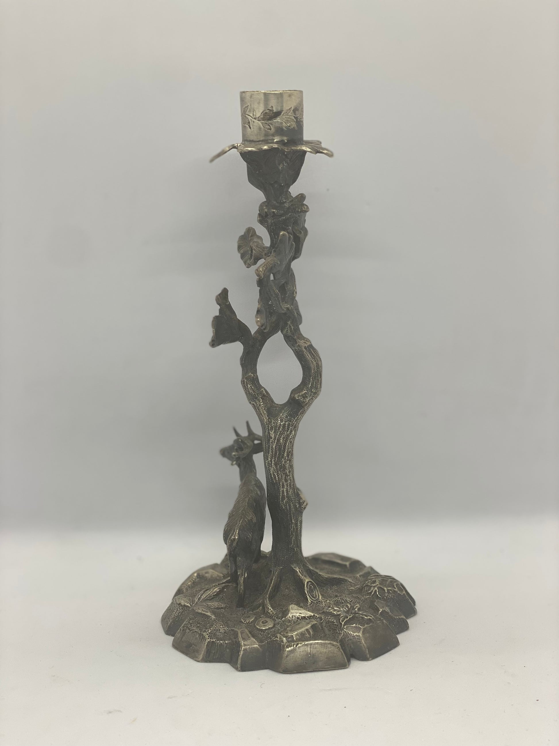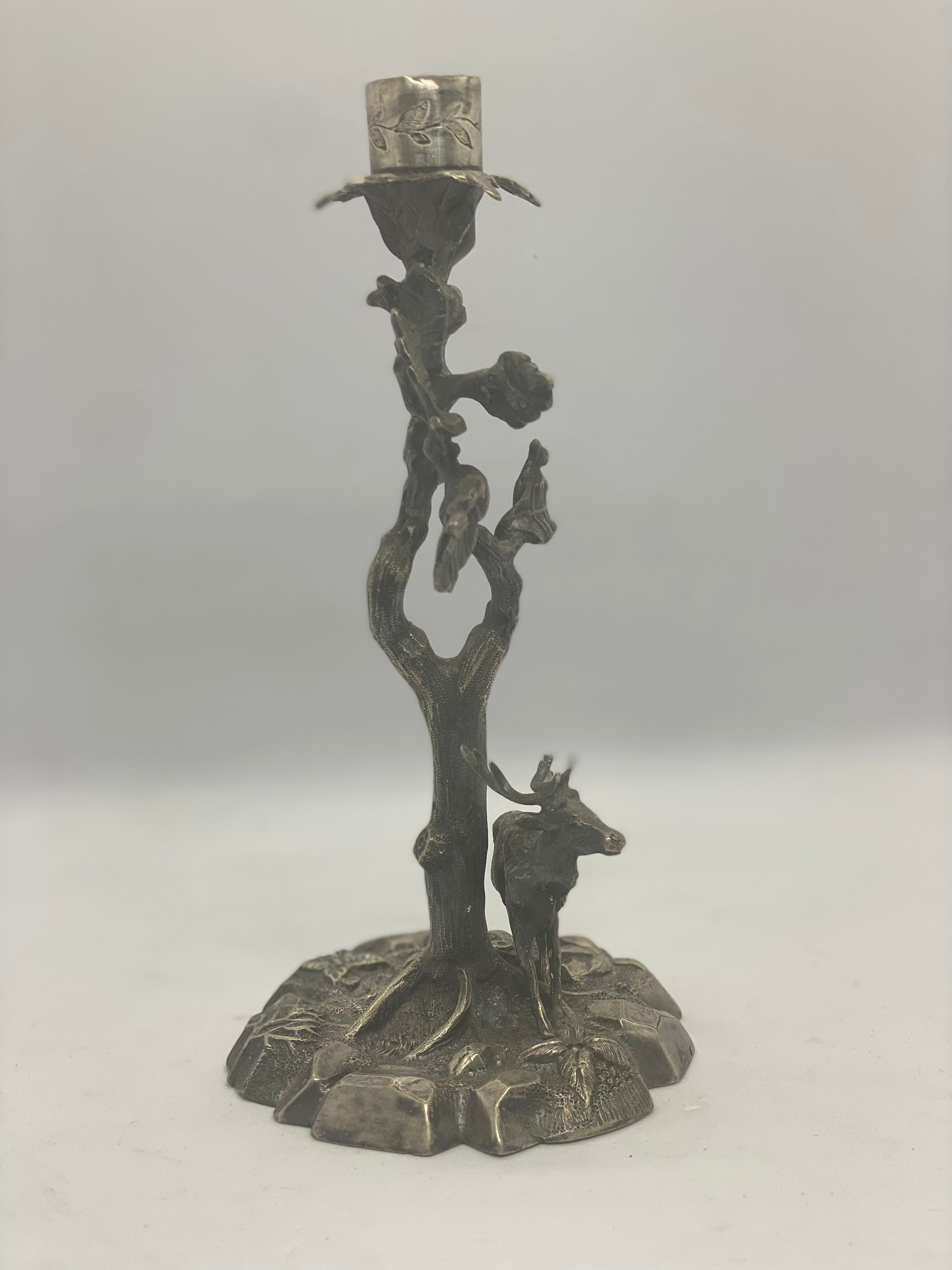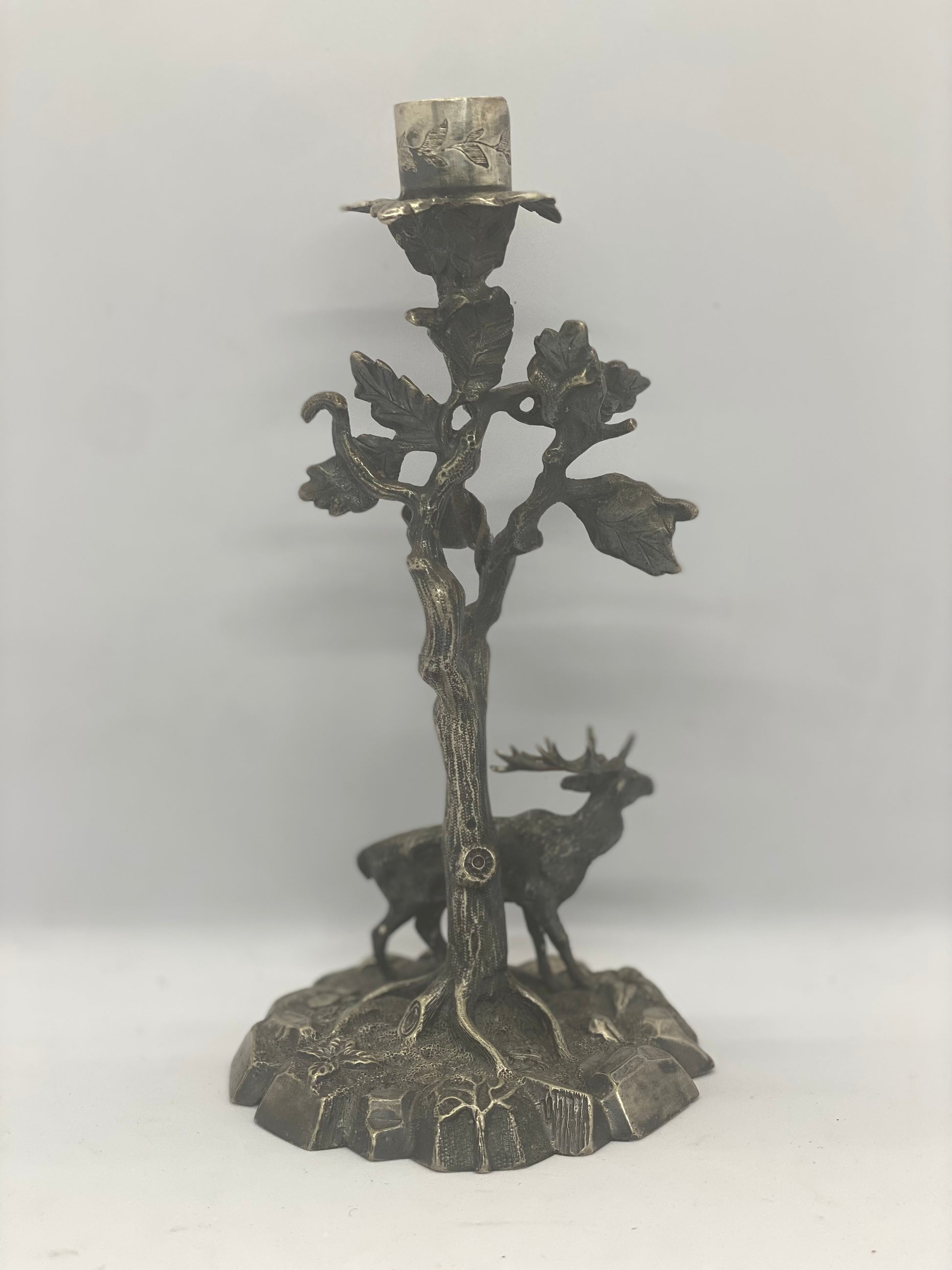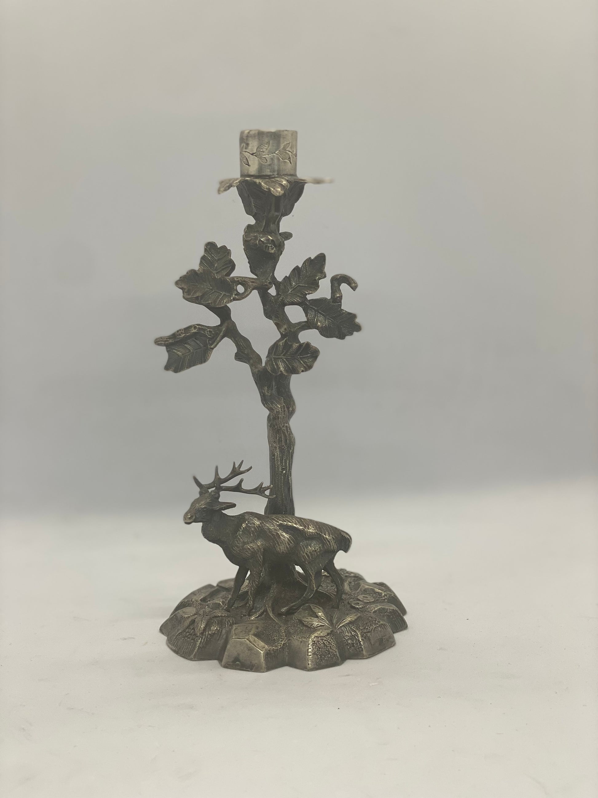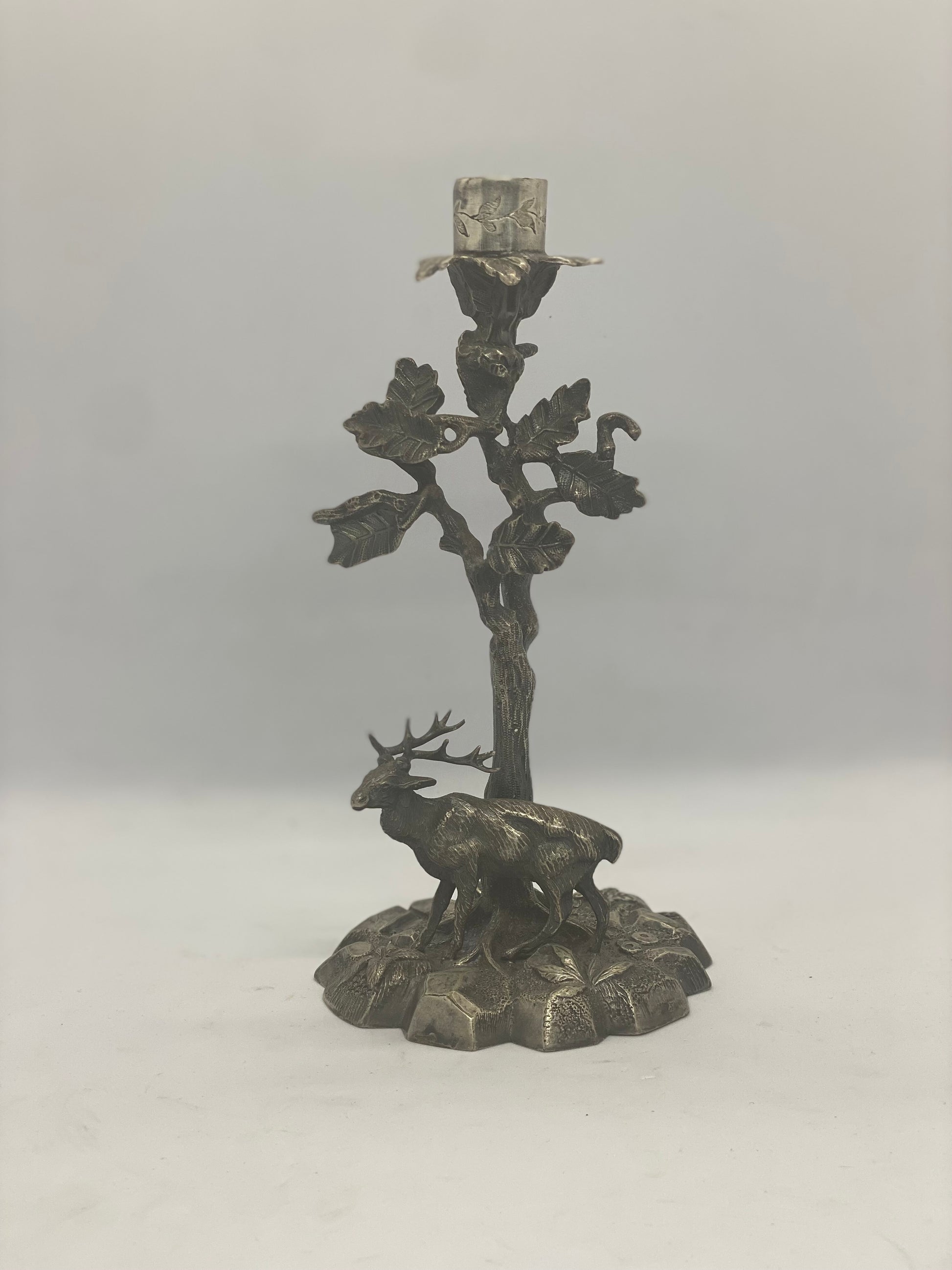Continental European Victorian Era Silver Plated Candlestick Holder w Stag Motif