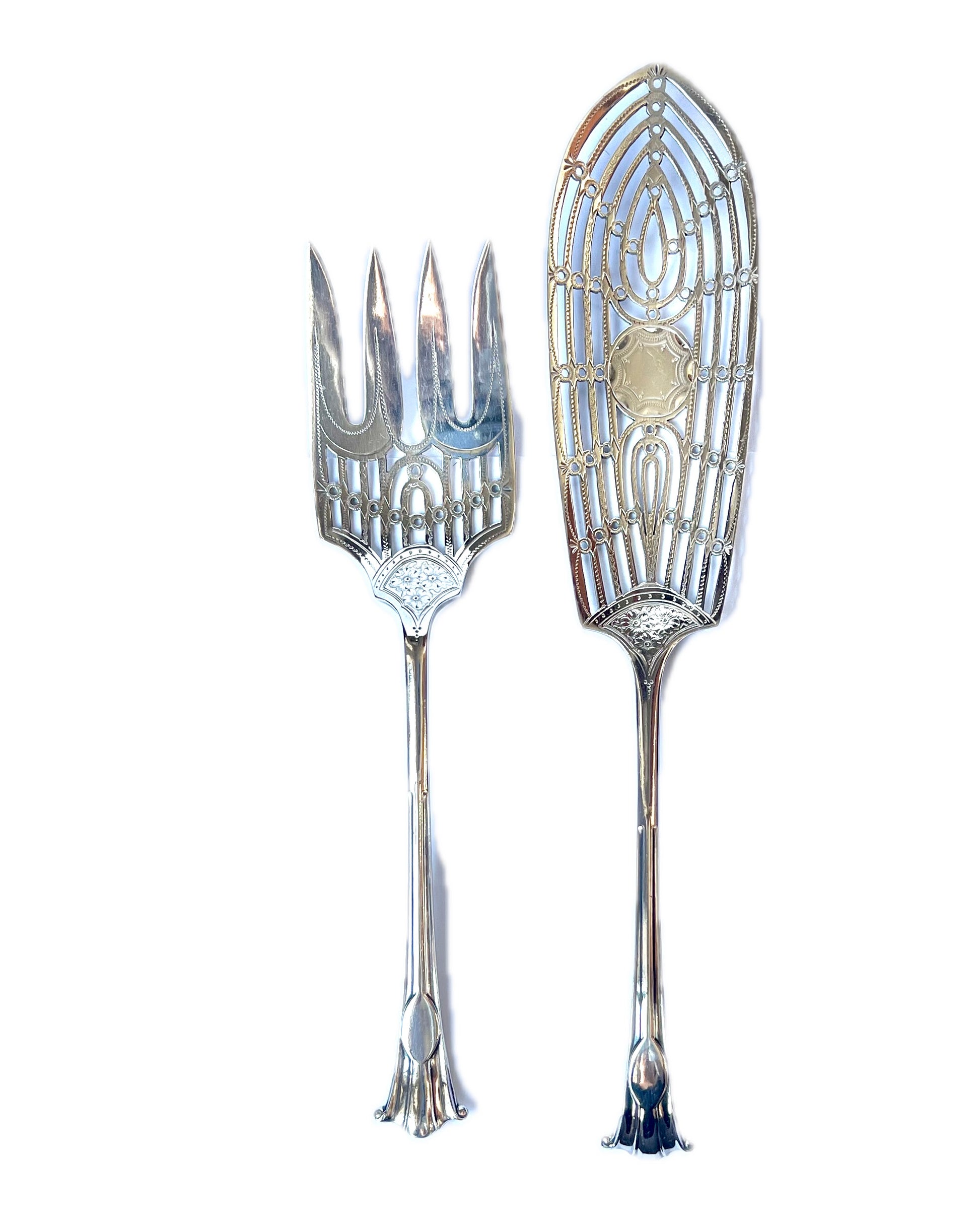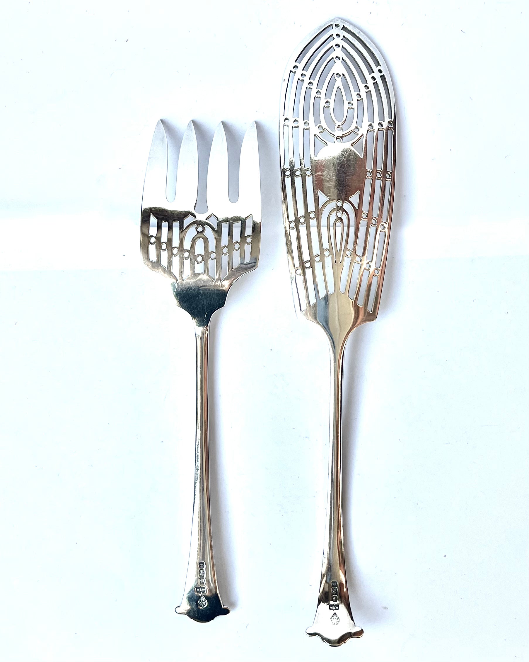 A beautiful set of George V sterling silver fish servers, with marks for Mappin & Webb, Sheffield, 1921. The beautiful pierced design and exquisite etched designs on each piece is a testament to this maker; Mappin & Webb is one of the most storied jewellers in England if not worldwide.