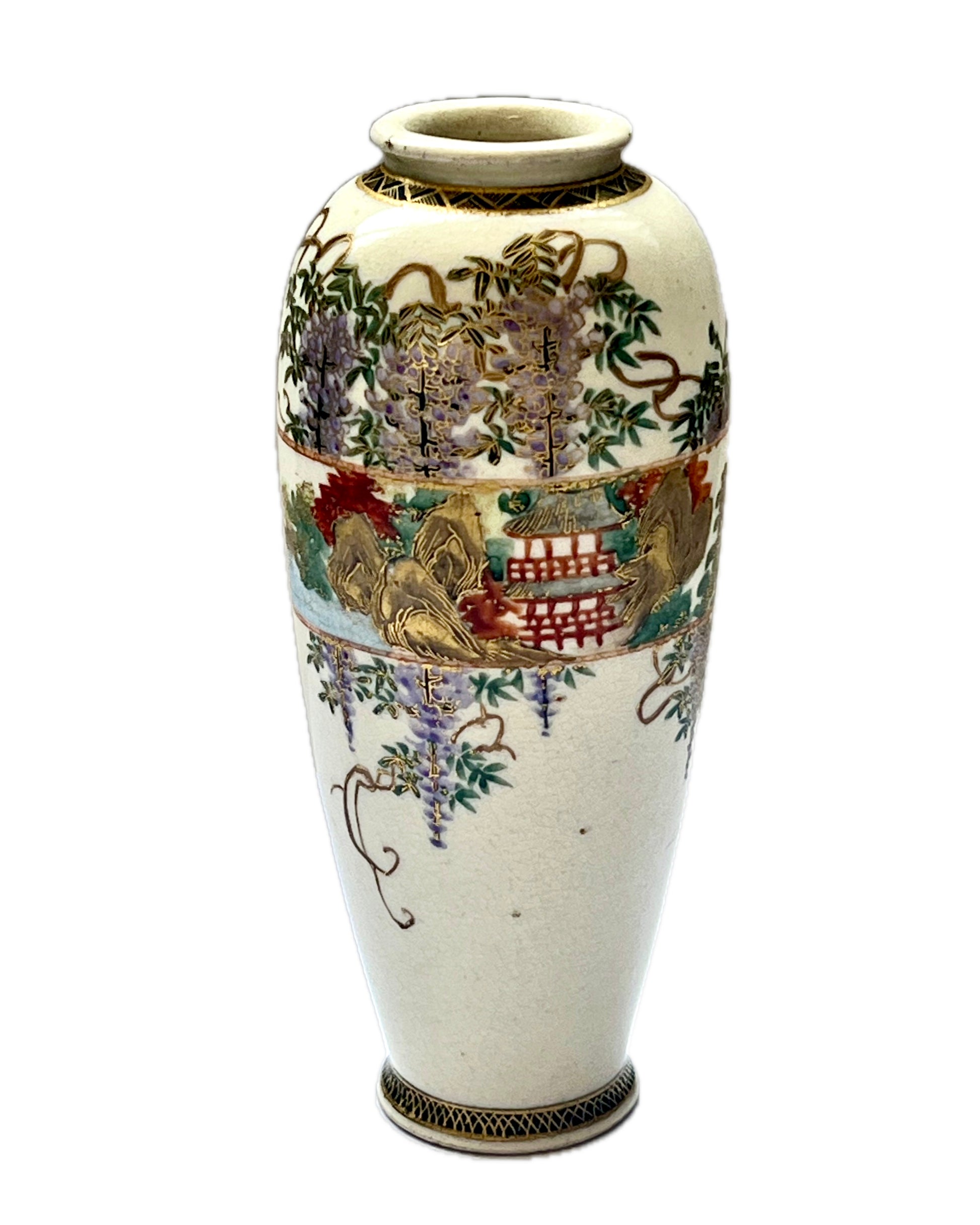 Small but finely painted antique Japanese late Meiji Period Satsuma porcelain vase, approximately late 19th century to early 20th century (1880s to 1910s). Very finely painted with a band circling the entire body featuring temple scenes and rich autumnal foliage, with beautiful wisteria motifs in the background. Richly gilded throughout, which is a signature of Satsuma pottery.