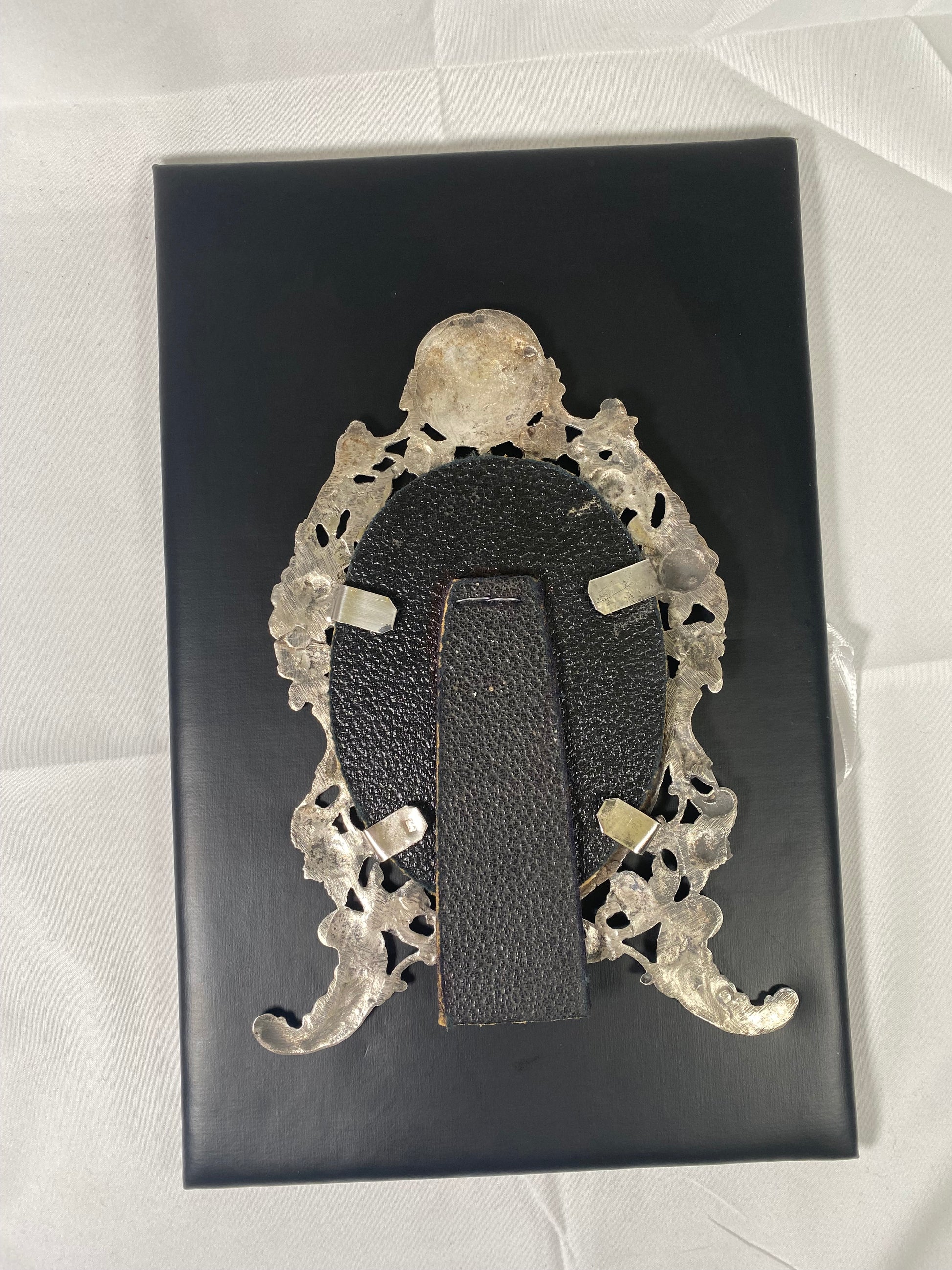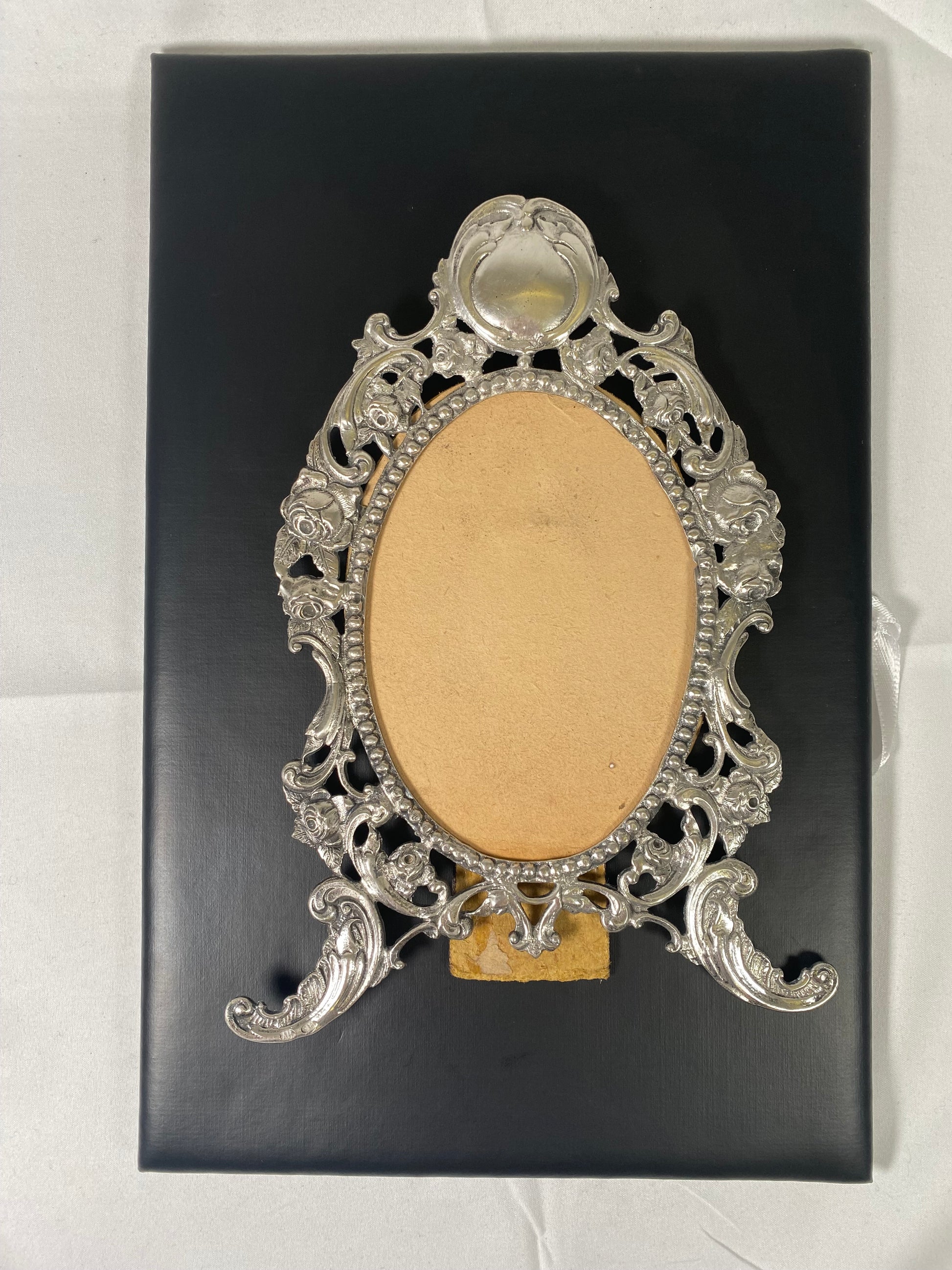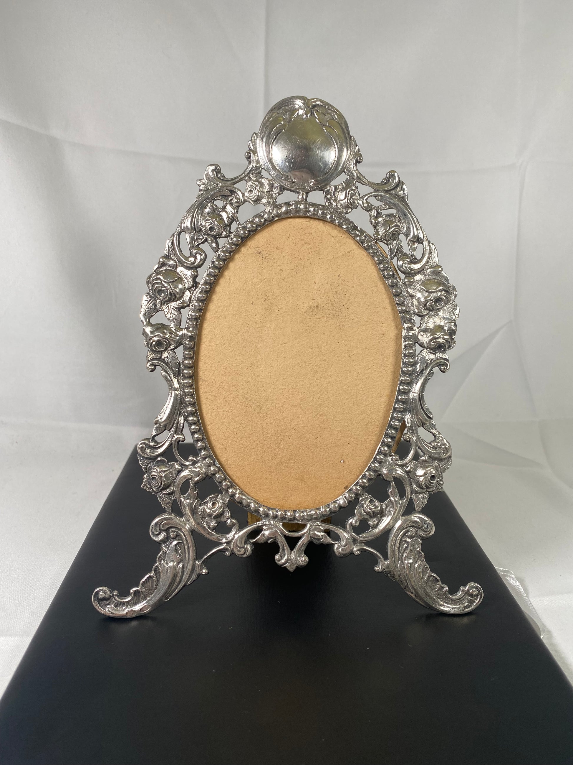 A very lovely Polish silver photo frame. Beautiful craftmanship with a blank cartouche and beautiful repousse work with figural roses and swirls.