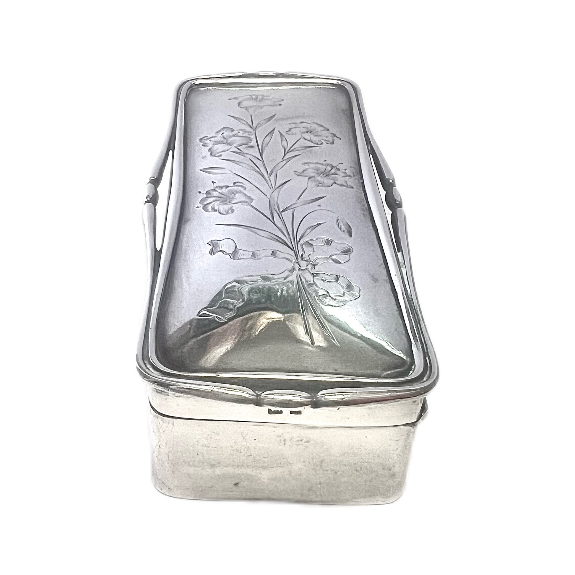 Edwardian sterling silver box with engraved posy to the top of box,