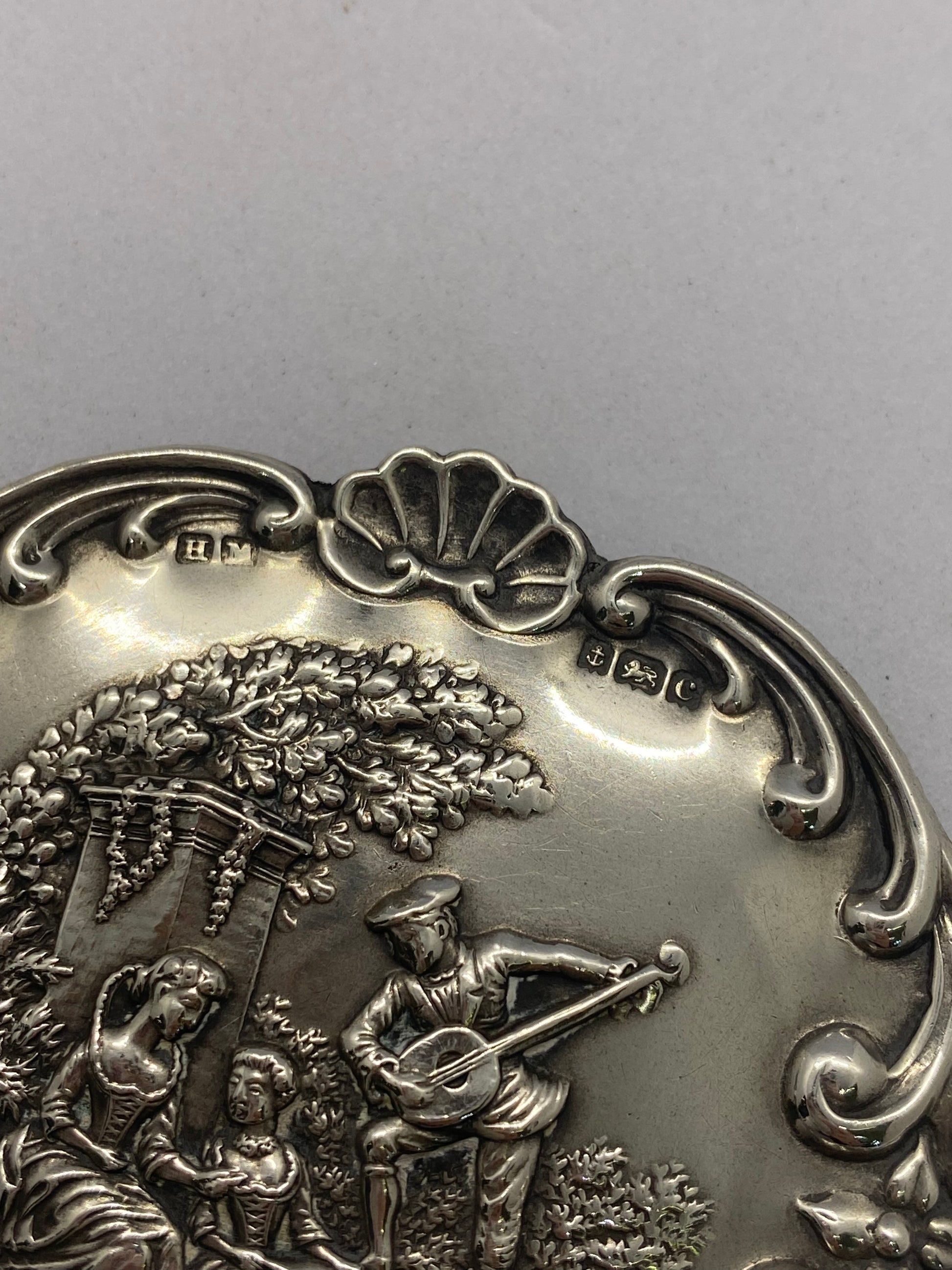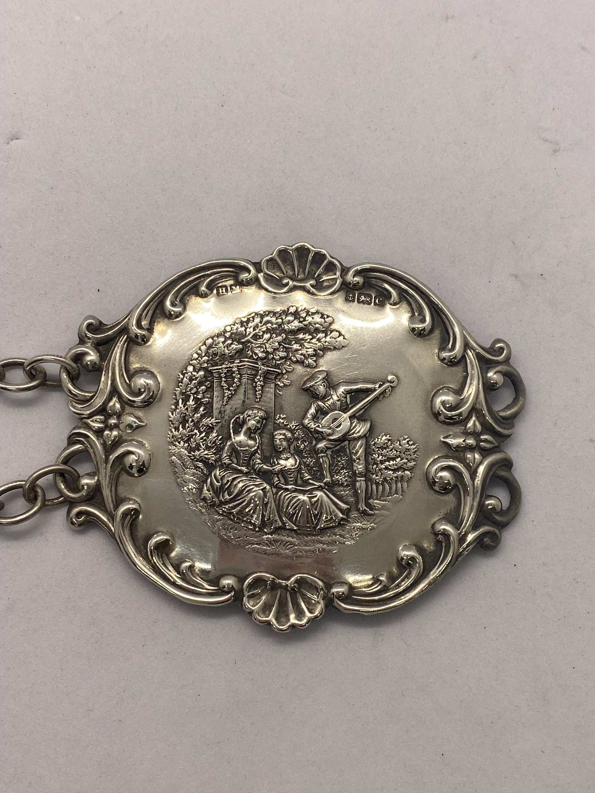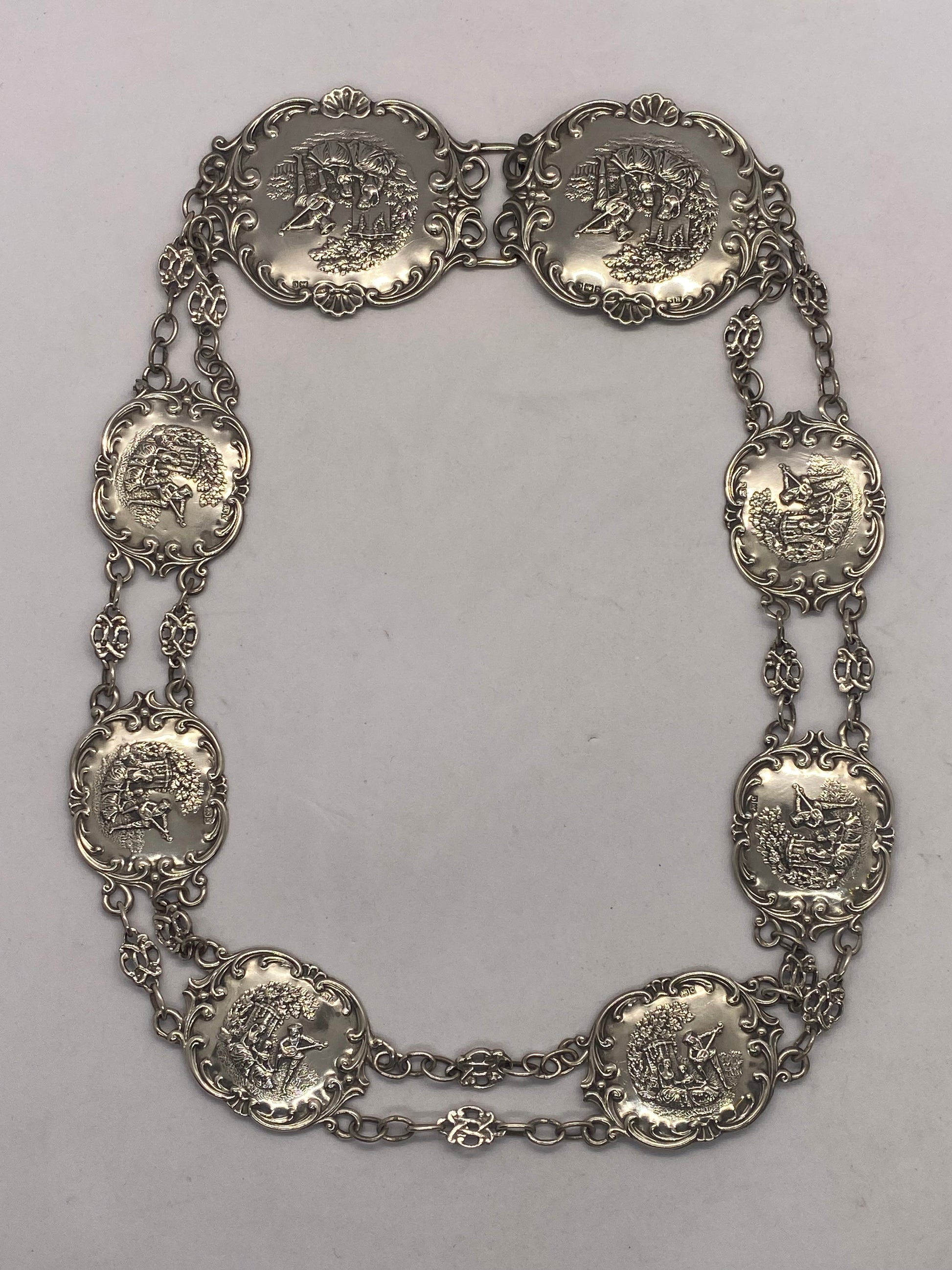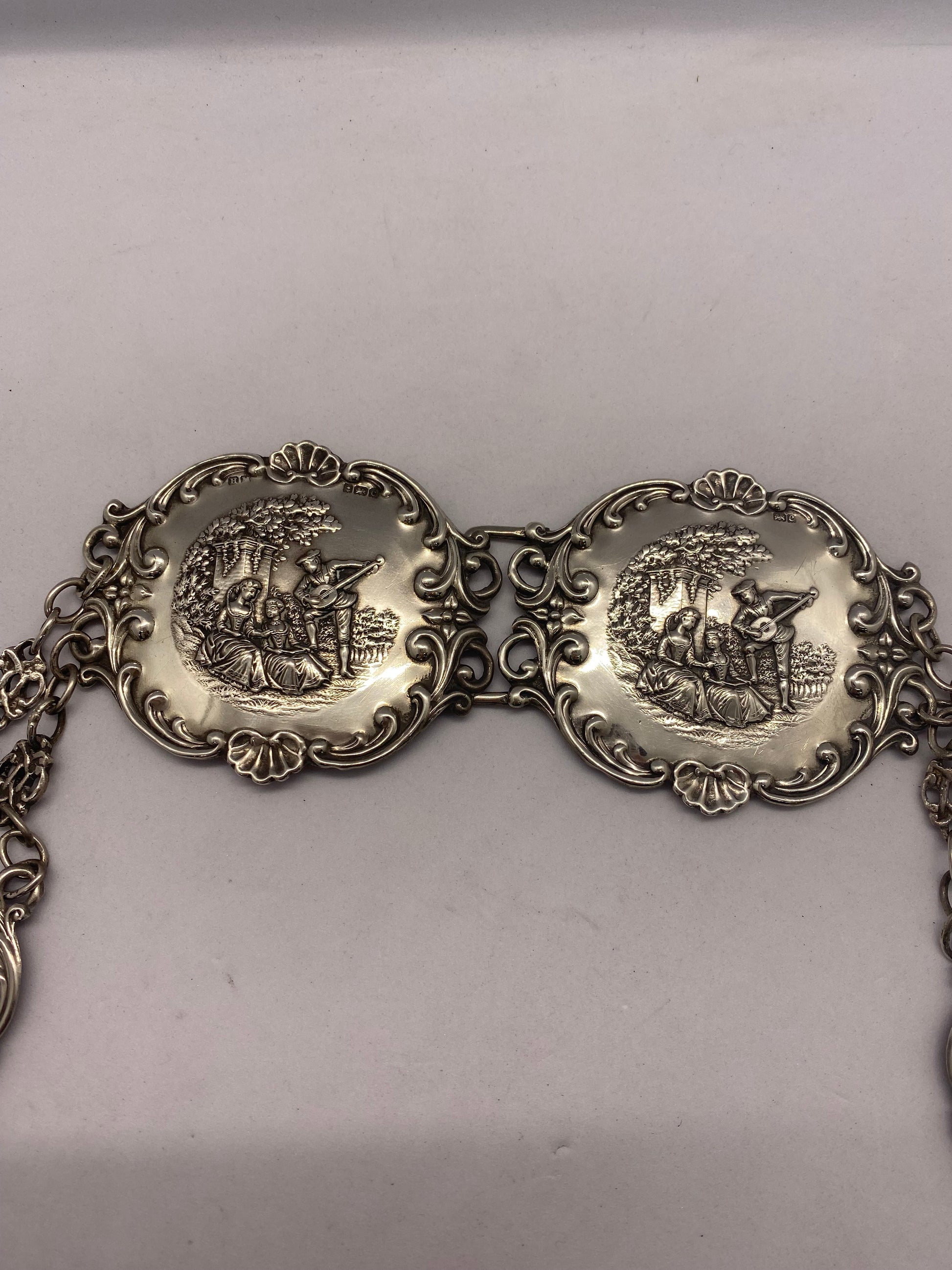 This lovely Edwardian sterling silver belt is a timeless piece that would suit a variety of styles; perhaps a modern slip dress and certainly an Edwardian tea dress or two. The craftsmanship on this is particularly fine, with intricate pierced links and figural motifs forming each chain link, as well as the beautiful countryside scenes on the belt panels (8 including the buckle). The hand hammered and beautifully finished details are part of the charm of antique silver, with hallmarks for Henry Matthews, Birmingham, 1902. Matthews was particularly noted for producing small items which required great attention to detail; this piece despite its larger size still showcases the meticulous nature of his work.