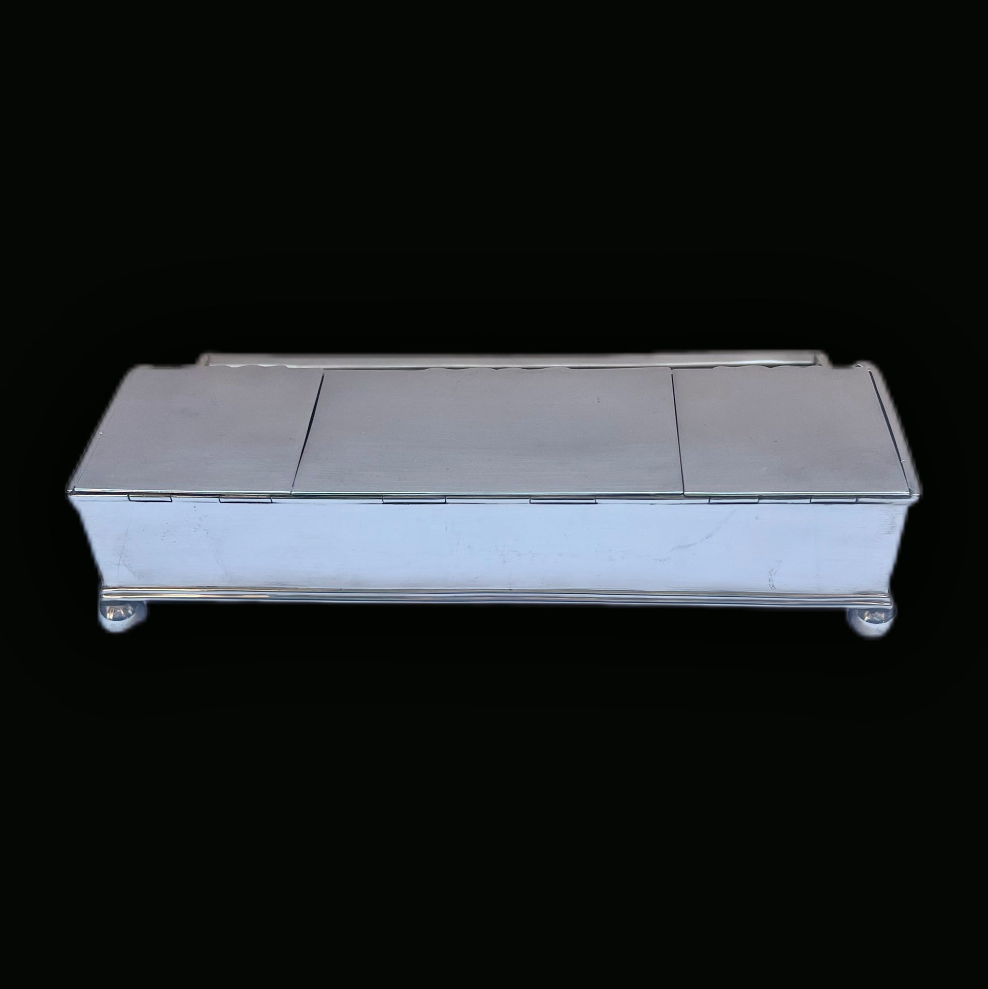An elegant desk accessory with three compartments, the smaller two containing cut glass inkwells. Hallmarks to each compartment as well as the side and base of the standish.