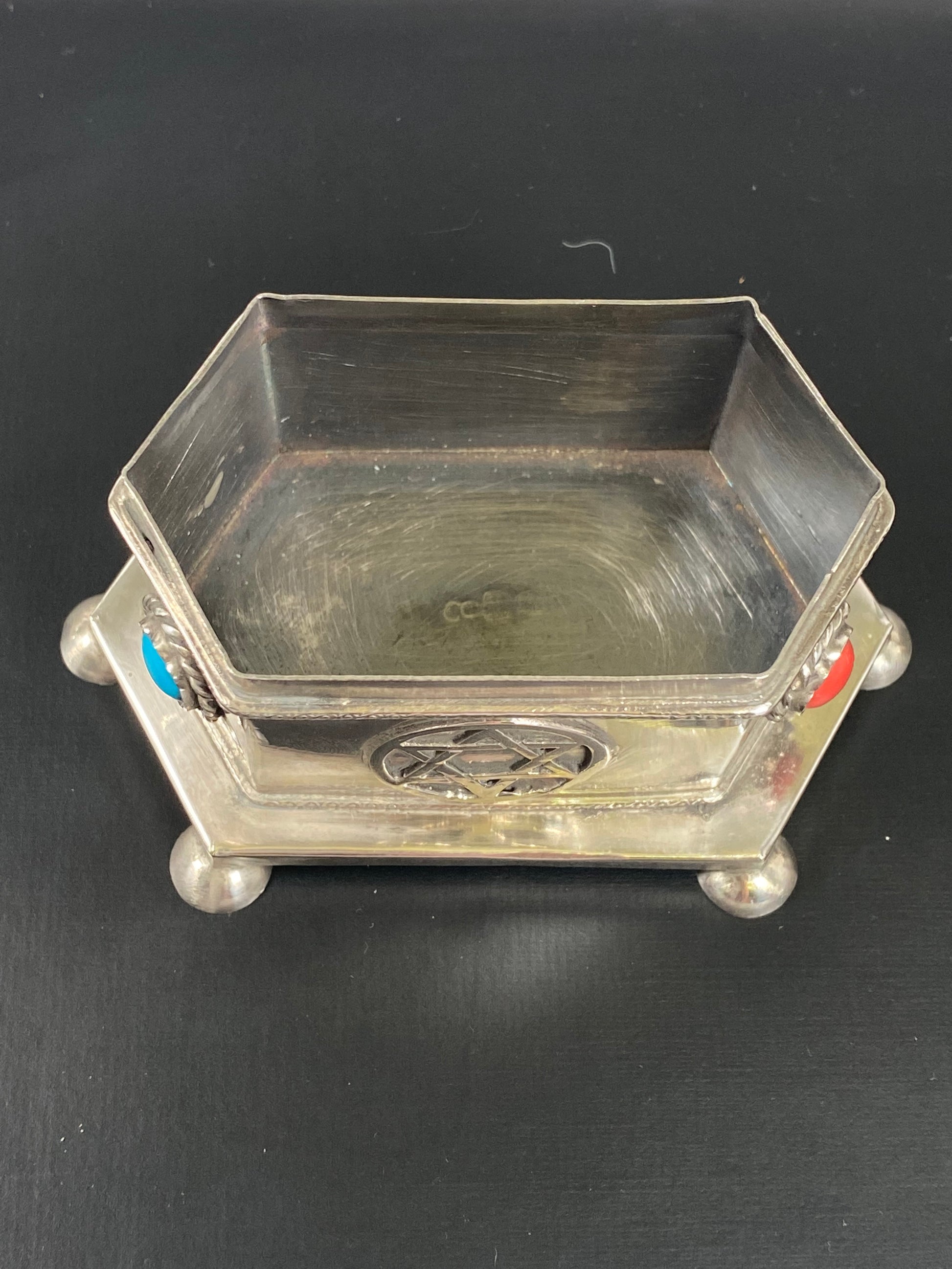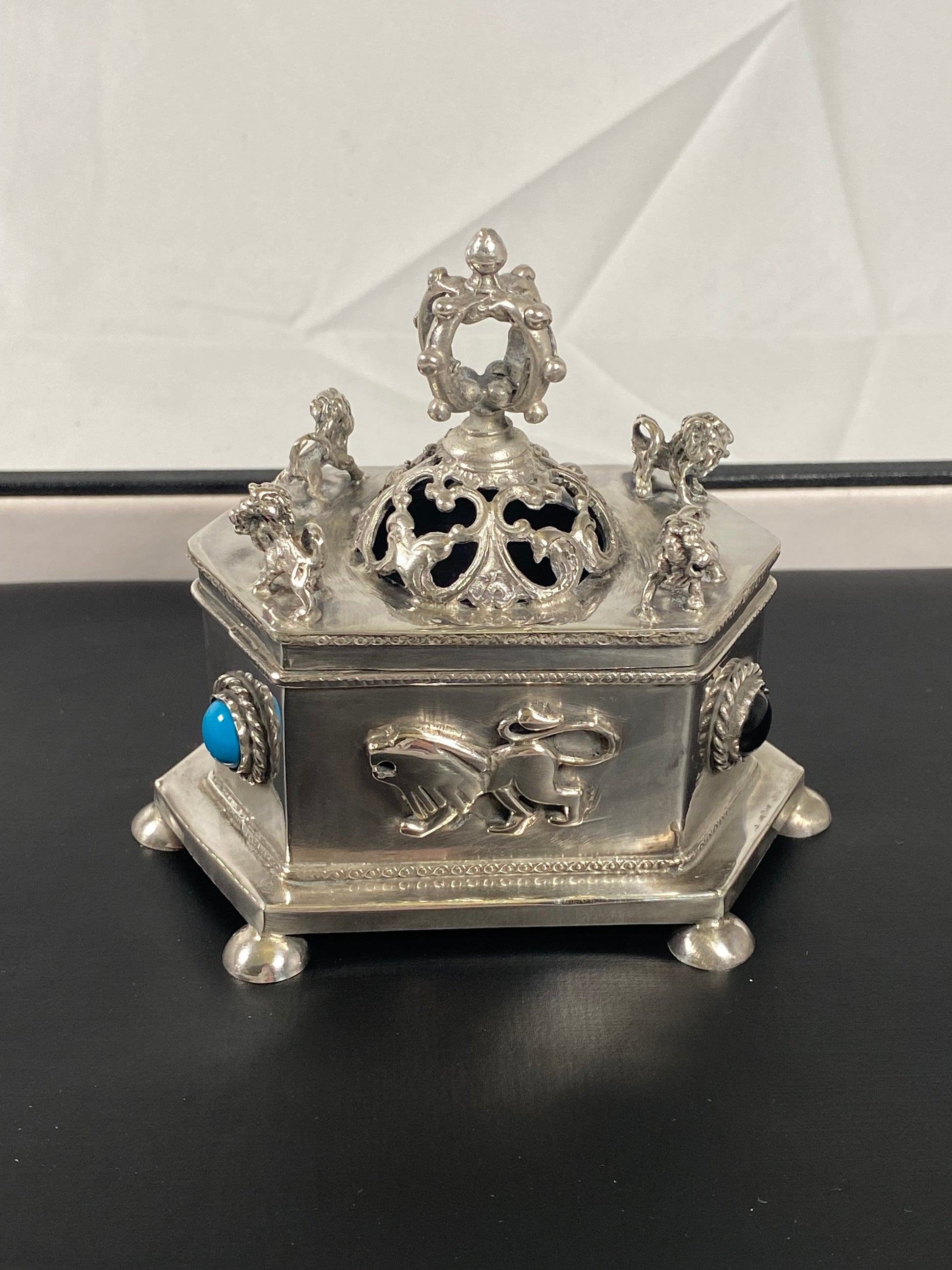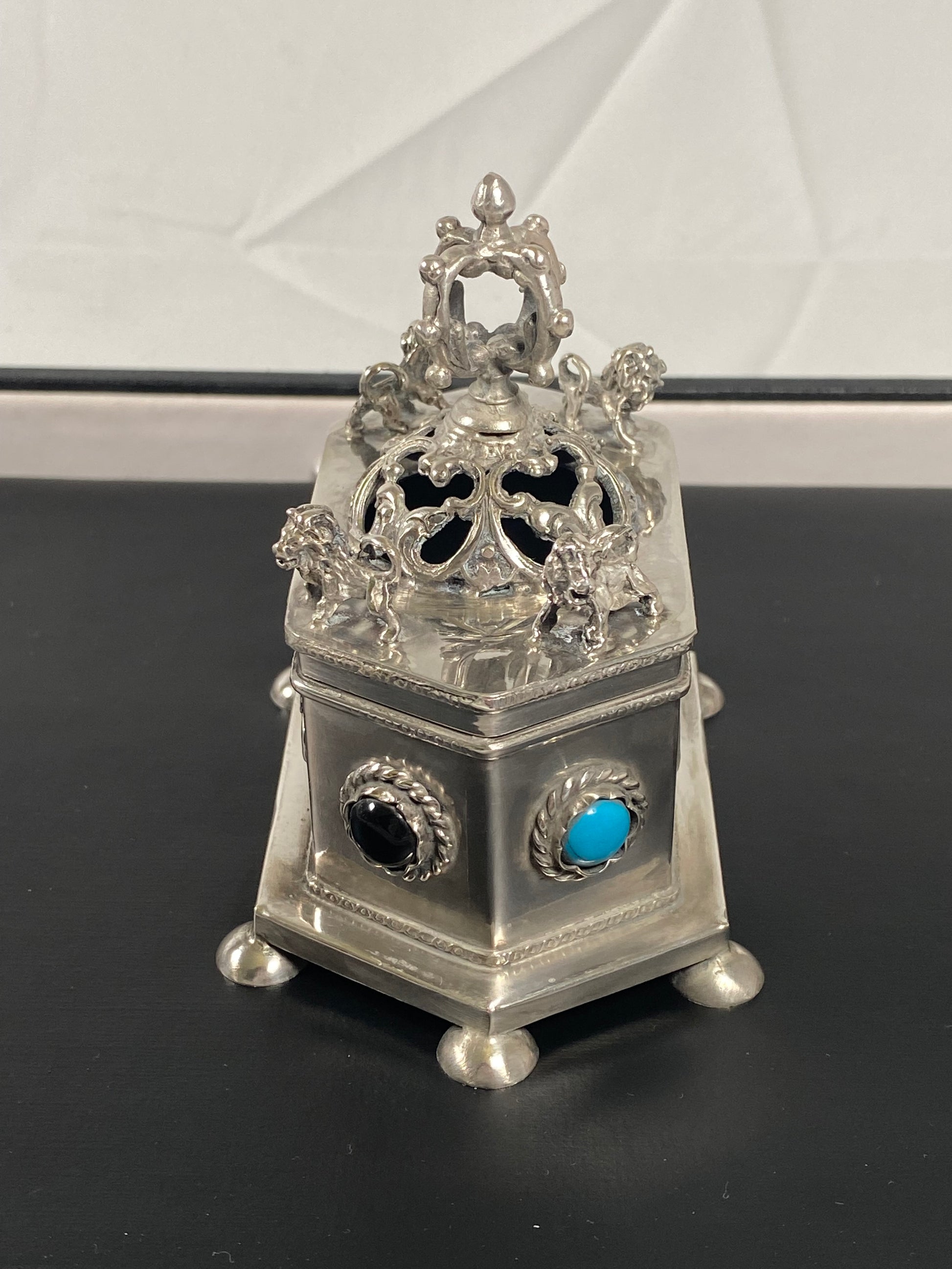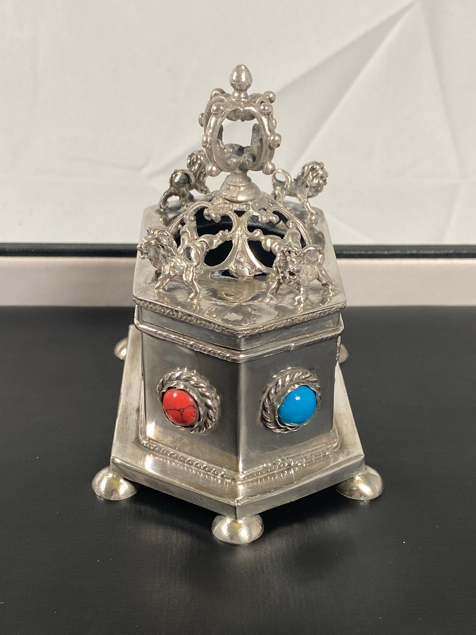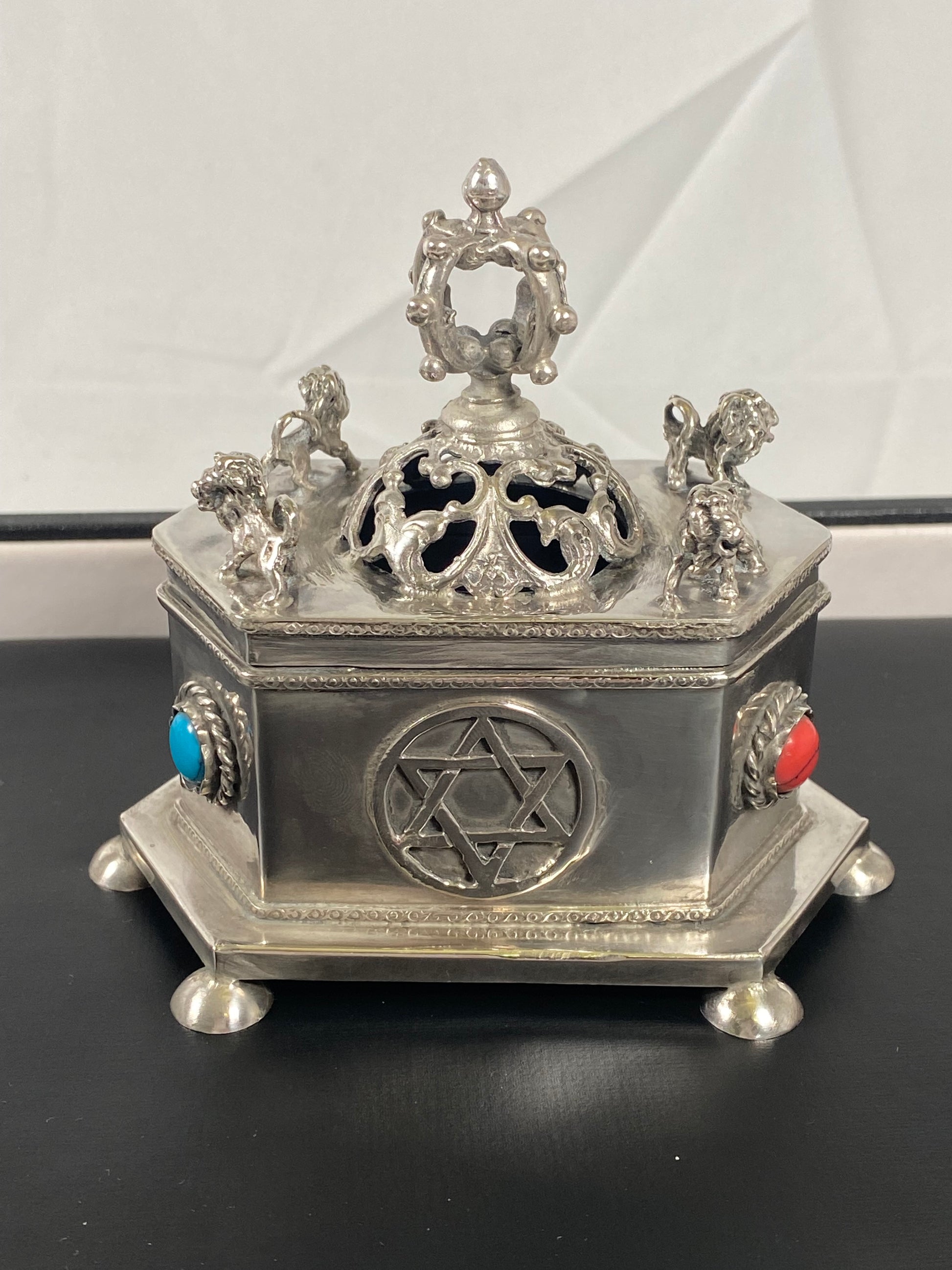 It bears a coral, onyx and two turquoise cabochons, as well as a prominent Star of David motif to the front of the box. Finely worked details including the almost coronet-like central finial as well as the delicately detailed filigree work to the top.