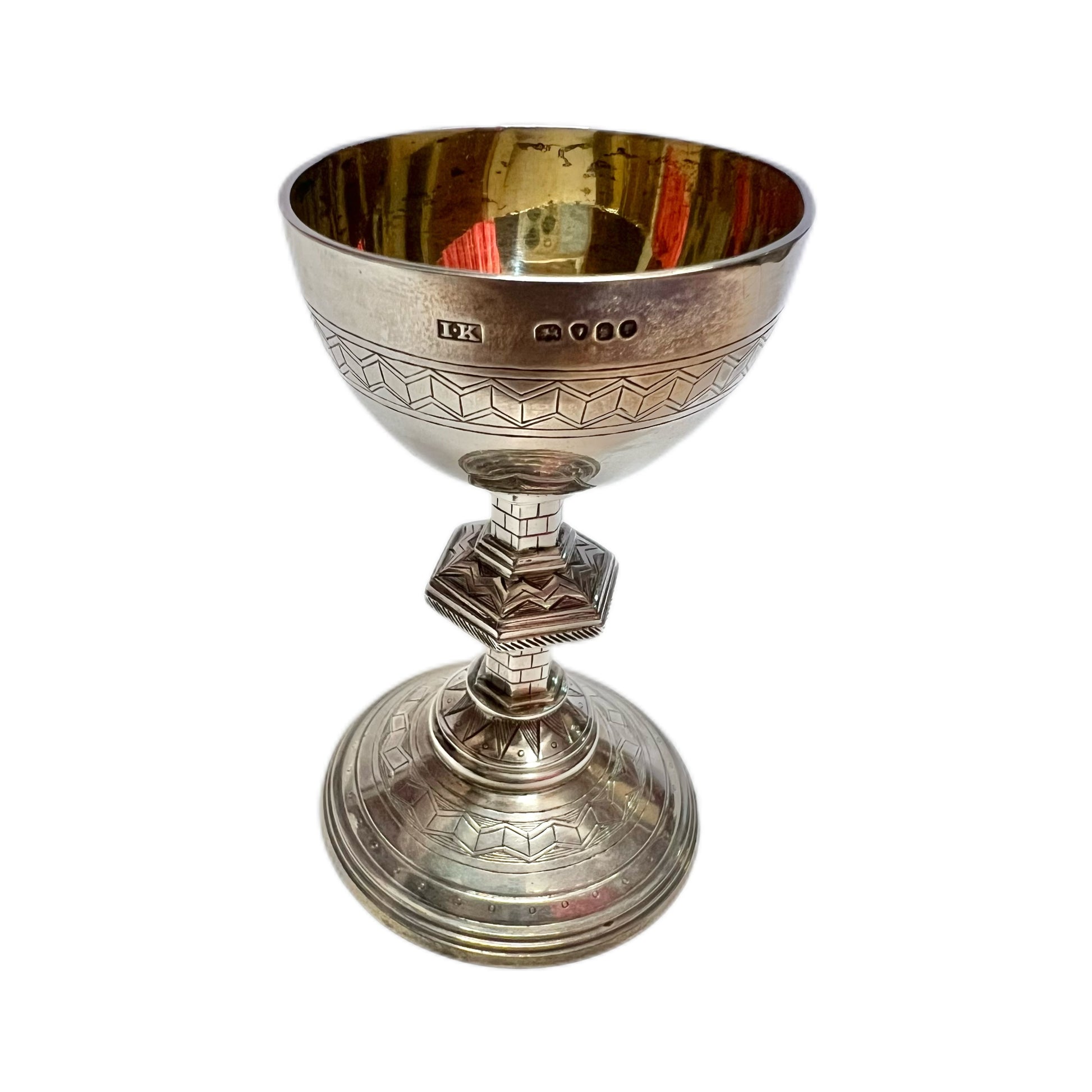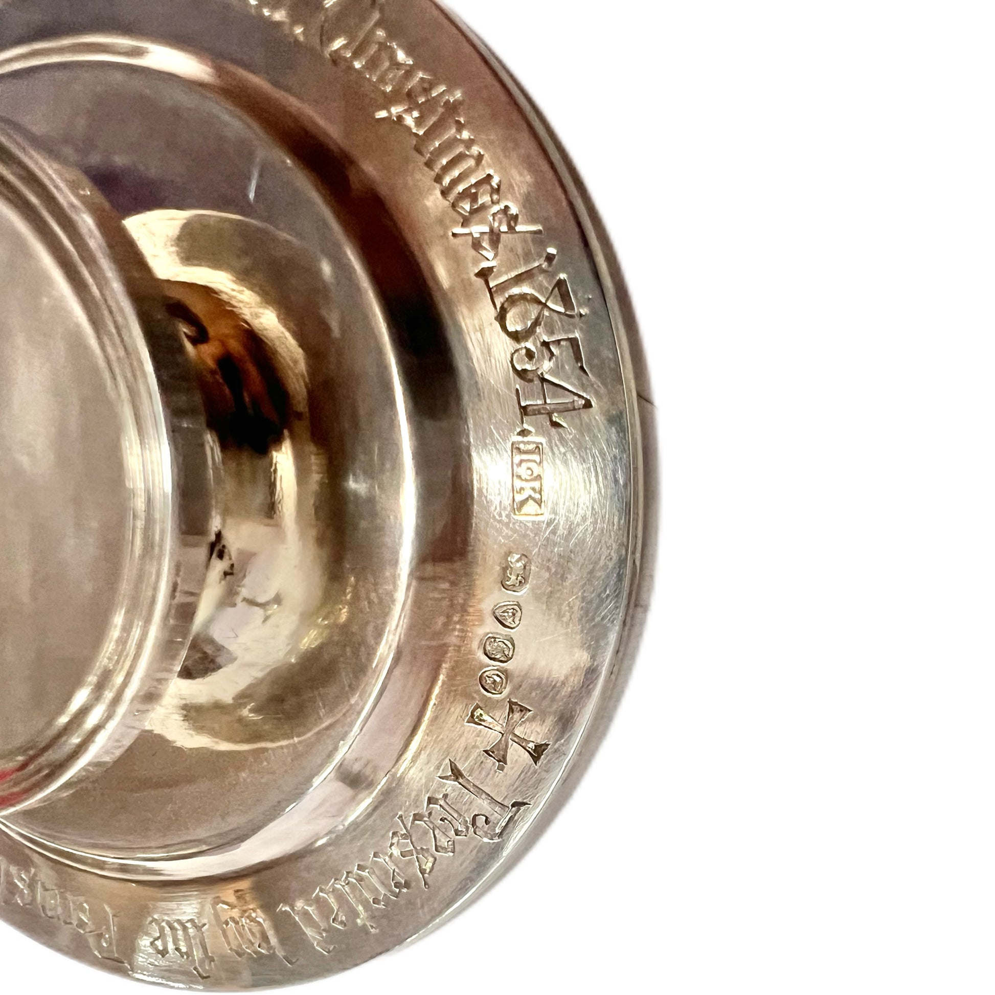Engraved to the front on chalice and plate is the monogram IHS, which stands for Iota, Eta, Sigma, the original Greek letters symbolising Jesus.