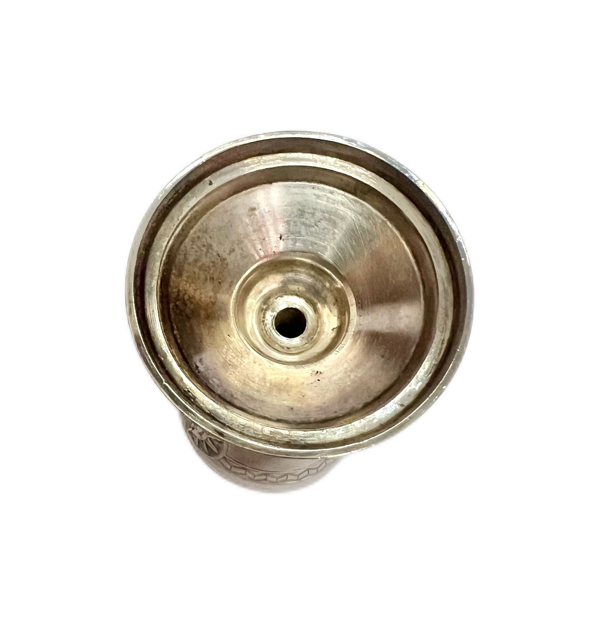 Measurements: 9.5cm height (goblet), 6.5cm width (plate), 2cm plate height. 100.26 grams weight (plate and goblet). Decanter unmarked but tests as sterling silver to collar and cap, height is 10.5. Pontil mark to base of decanter.