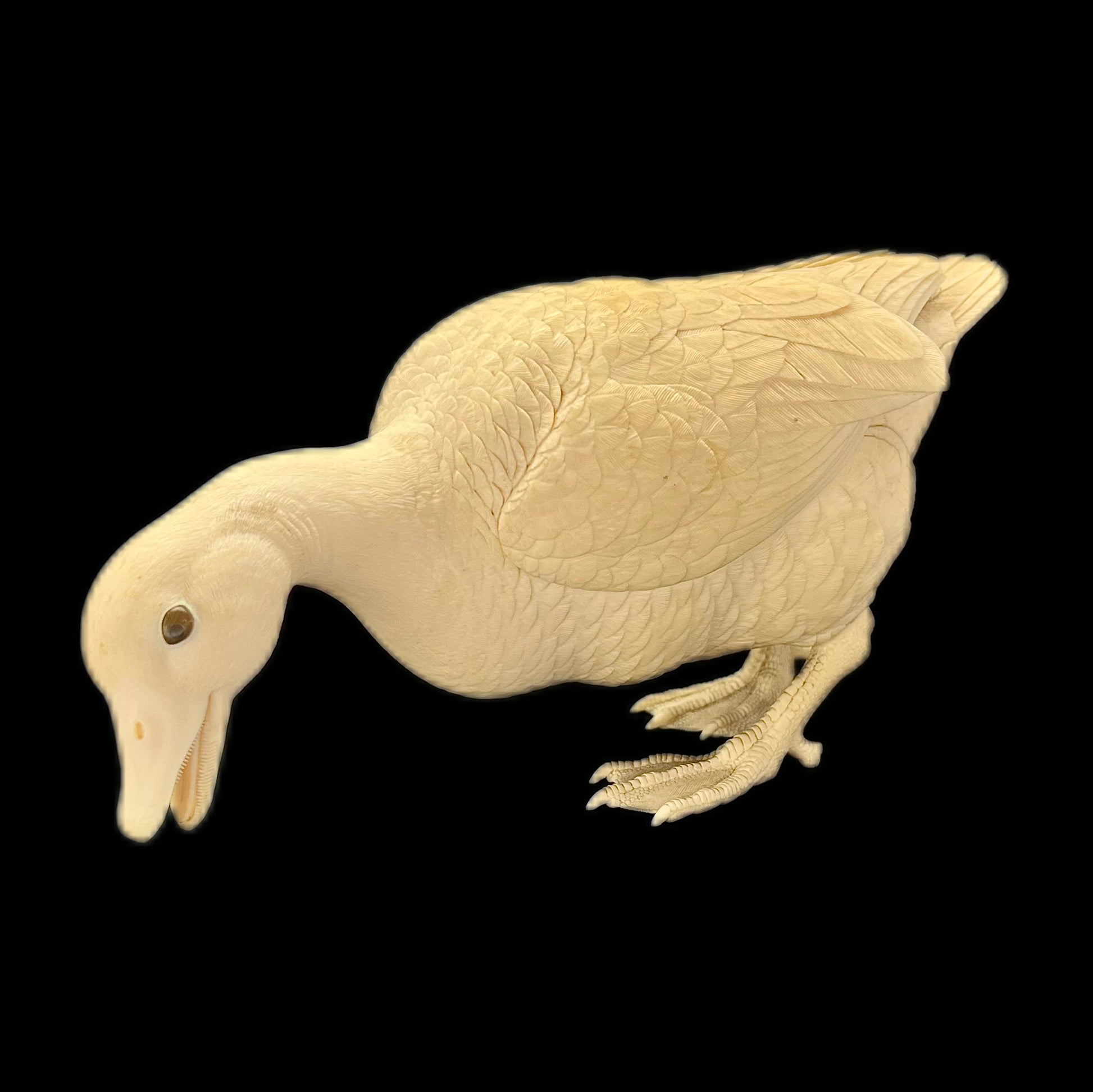 As can be seen in the pictures, this duck is superbly carved with feathered details, naturalistic eyes and attention to every detail, including the duck’s teeth and tongue. The duck's main body is carved from single large piece of ivory. Truly, a masterpiece in every aspect.