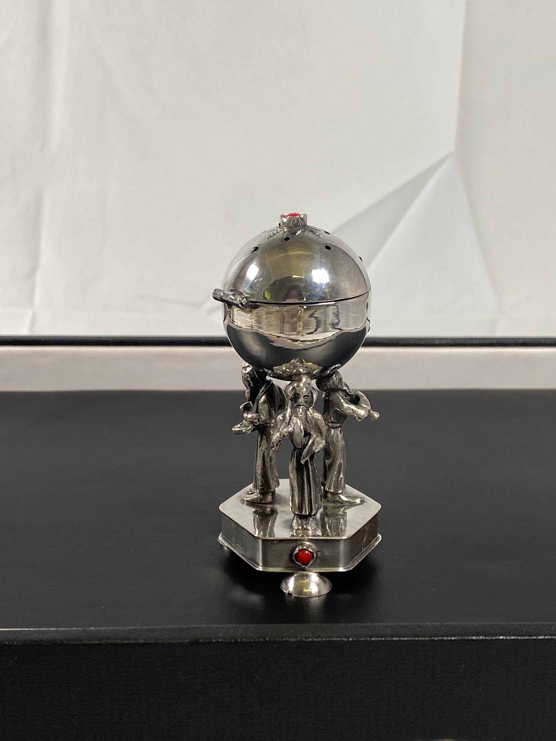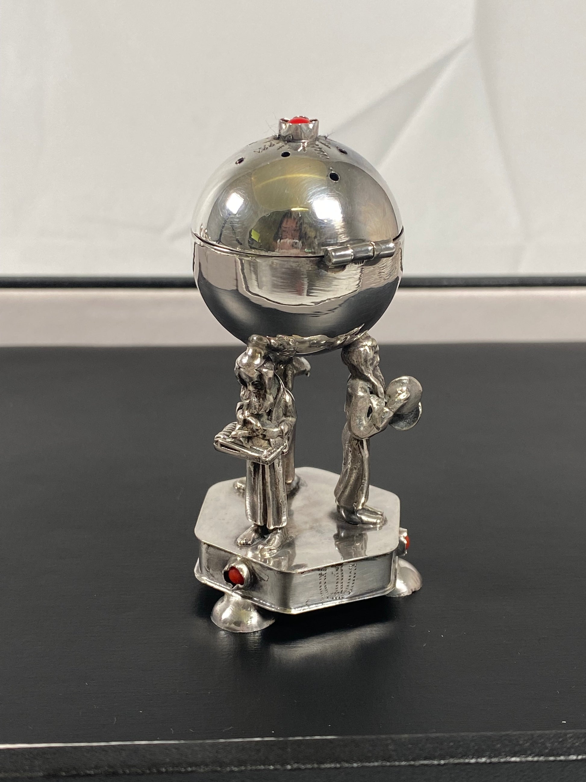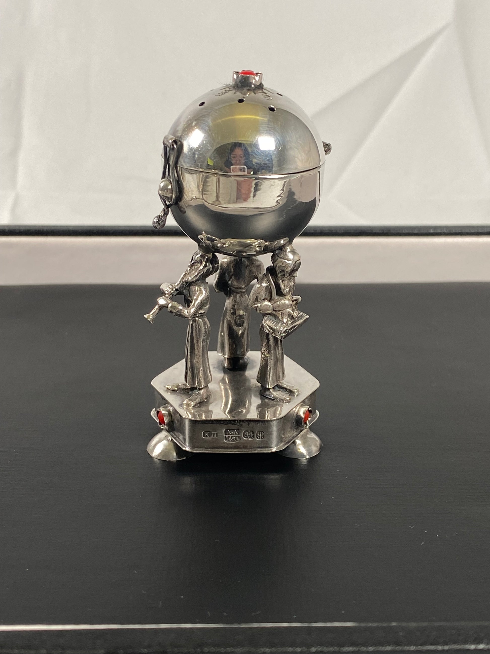 It bears a coral cabochon top and 3 more around the sides of the base, as well as finely worked details including rabbinical figures carrying musical instruments, bearing the lidded spice vessel atop their heads.