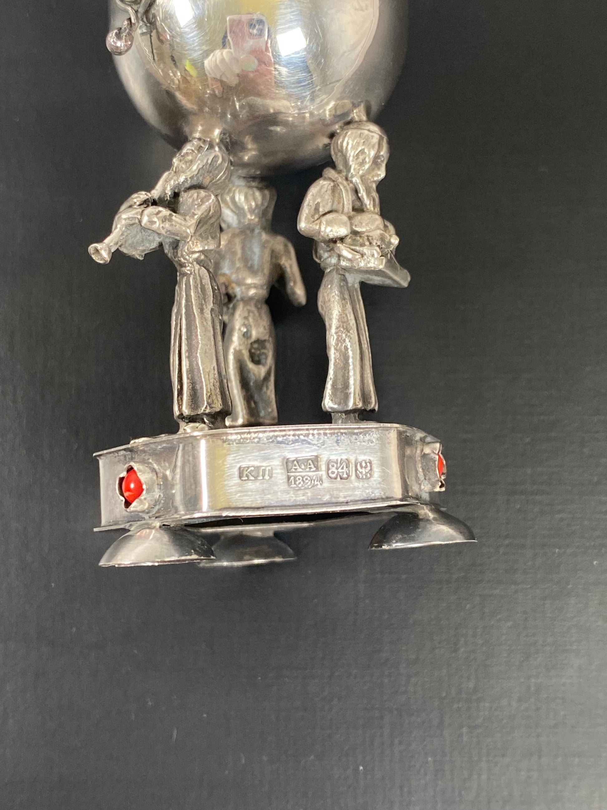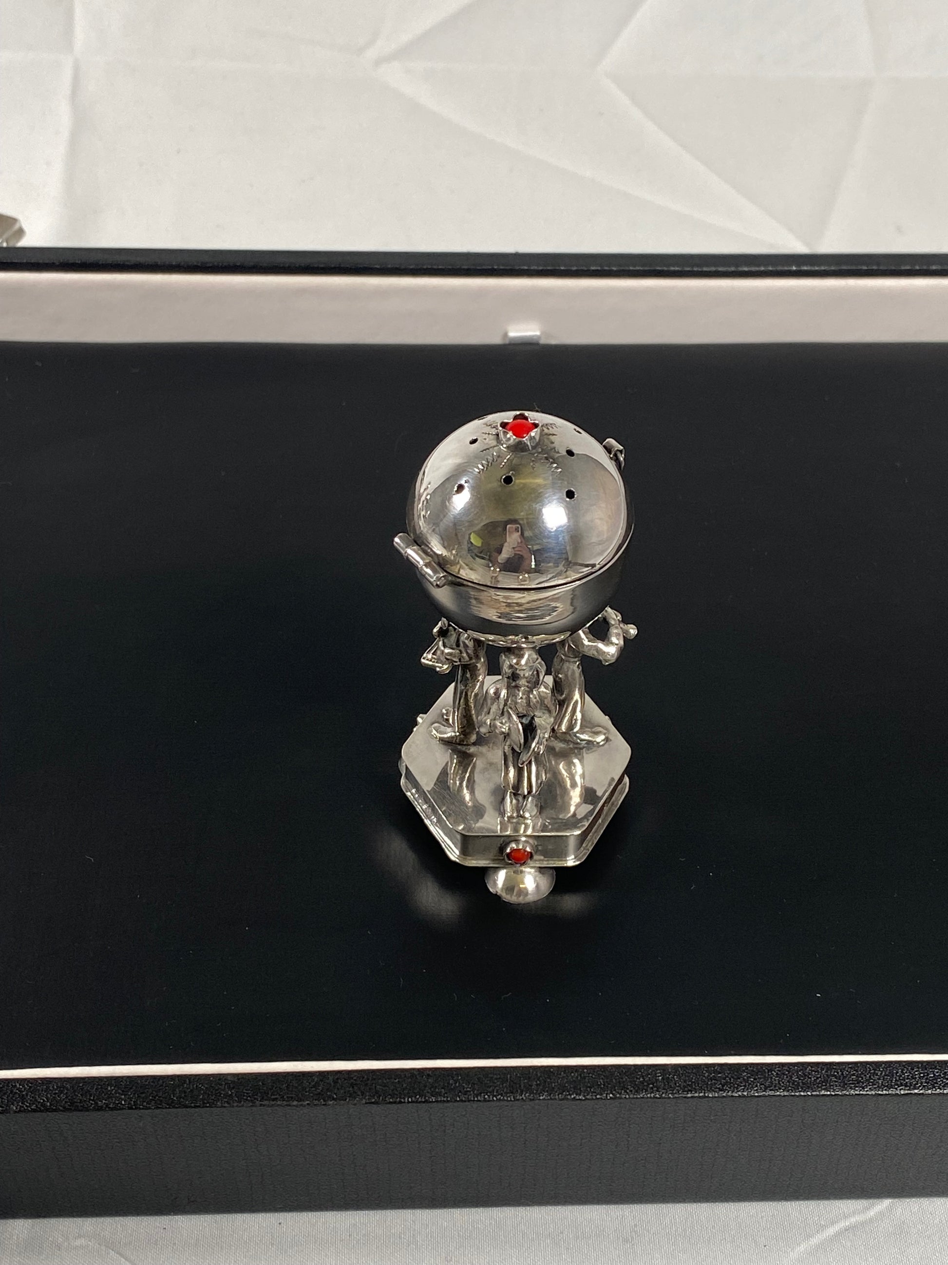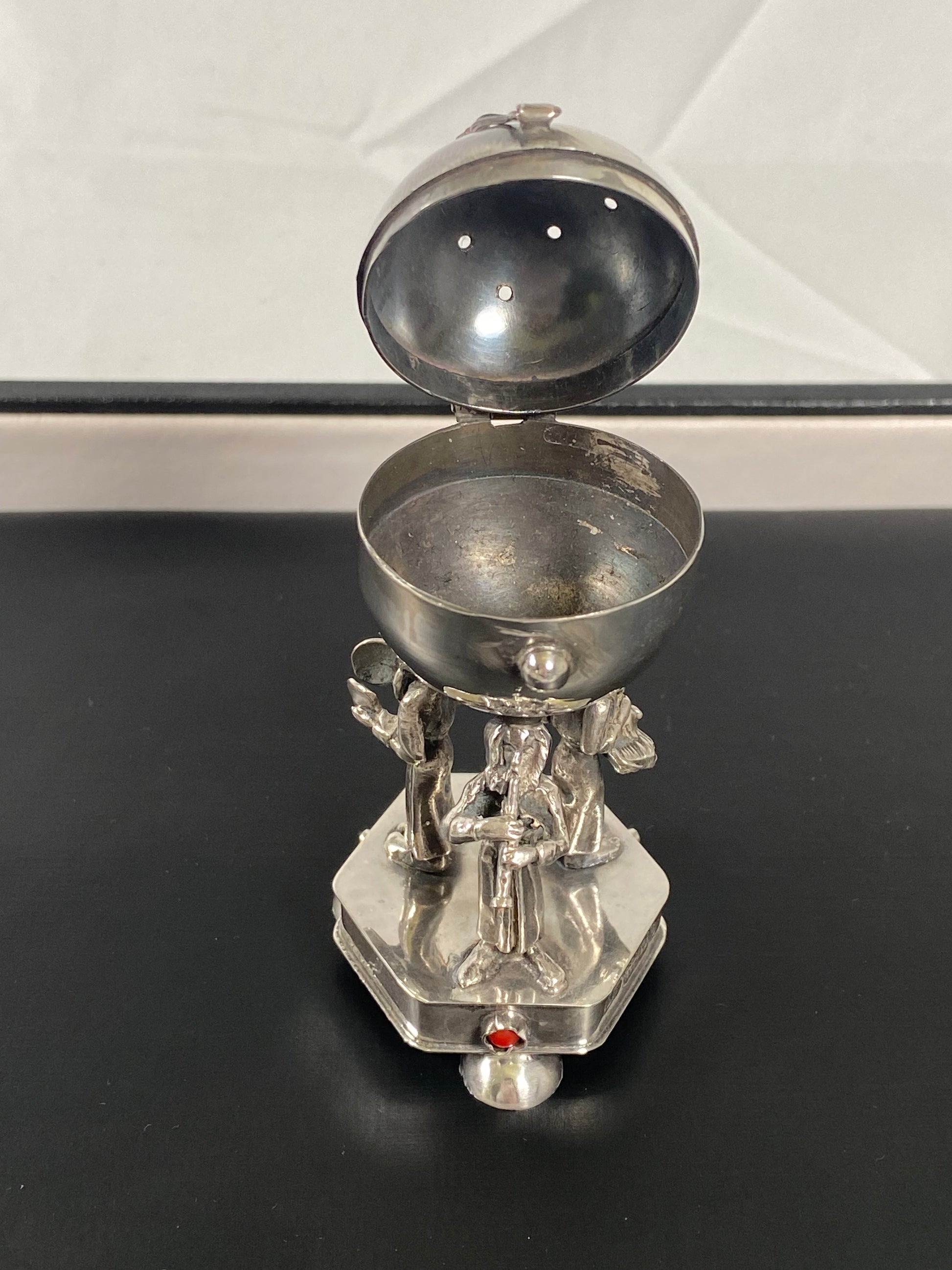 It bears a coral cabochon top and 3 more around the sides of the base, as well as finely worked details including rabbinical figures carrying musical instruments, bearing the lidded spice vessel atop their heads.