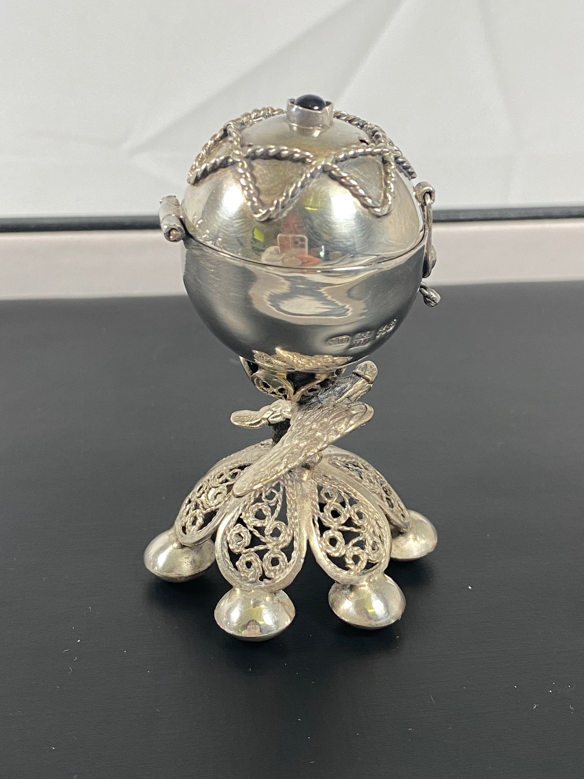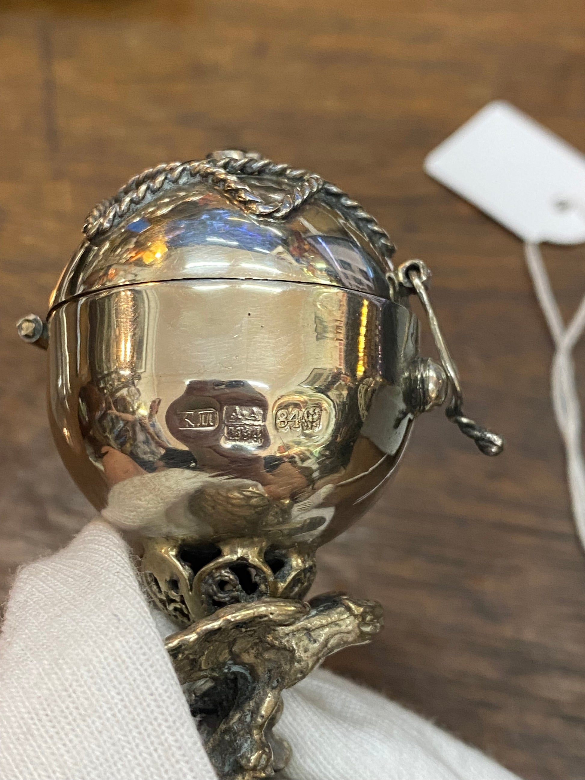 It bears an onyx cabochon top and finely worked details including an eagle central motif, bearing the lidded spice vessel atop its wings.