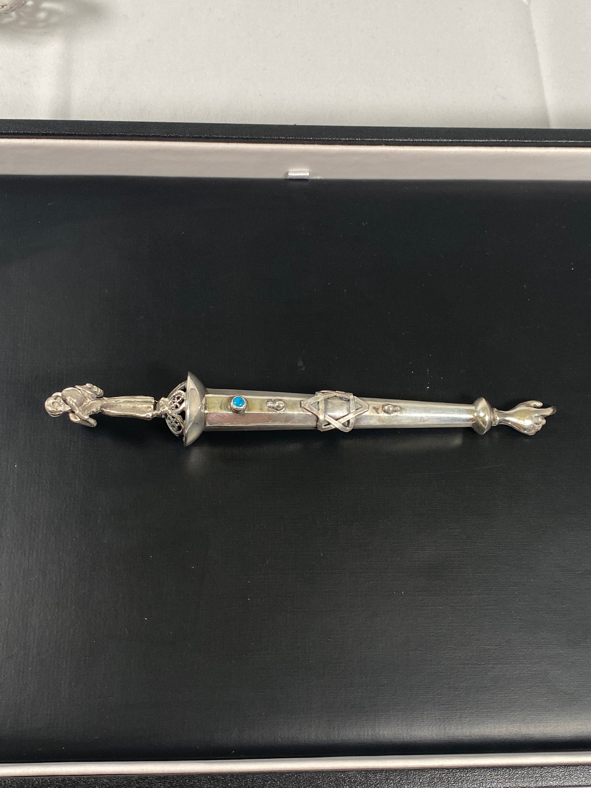 This is a finely made piece with a rabbinical figure playing the cymbals. The turquoise finial and Star of David further add symbolic as well as aesthetic details.