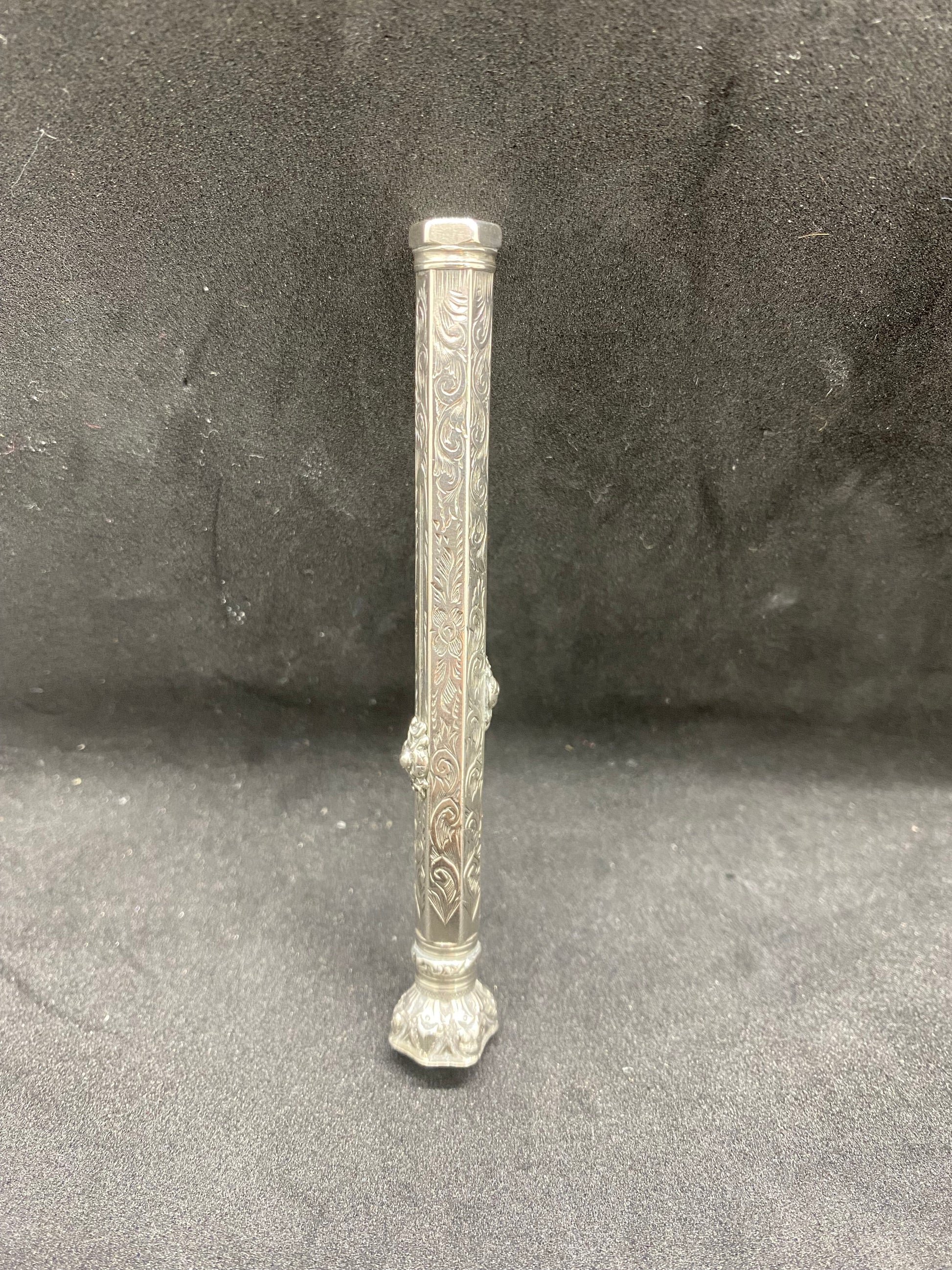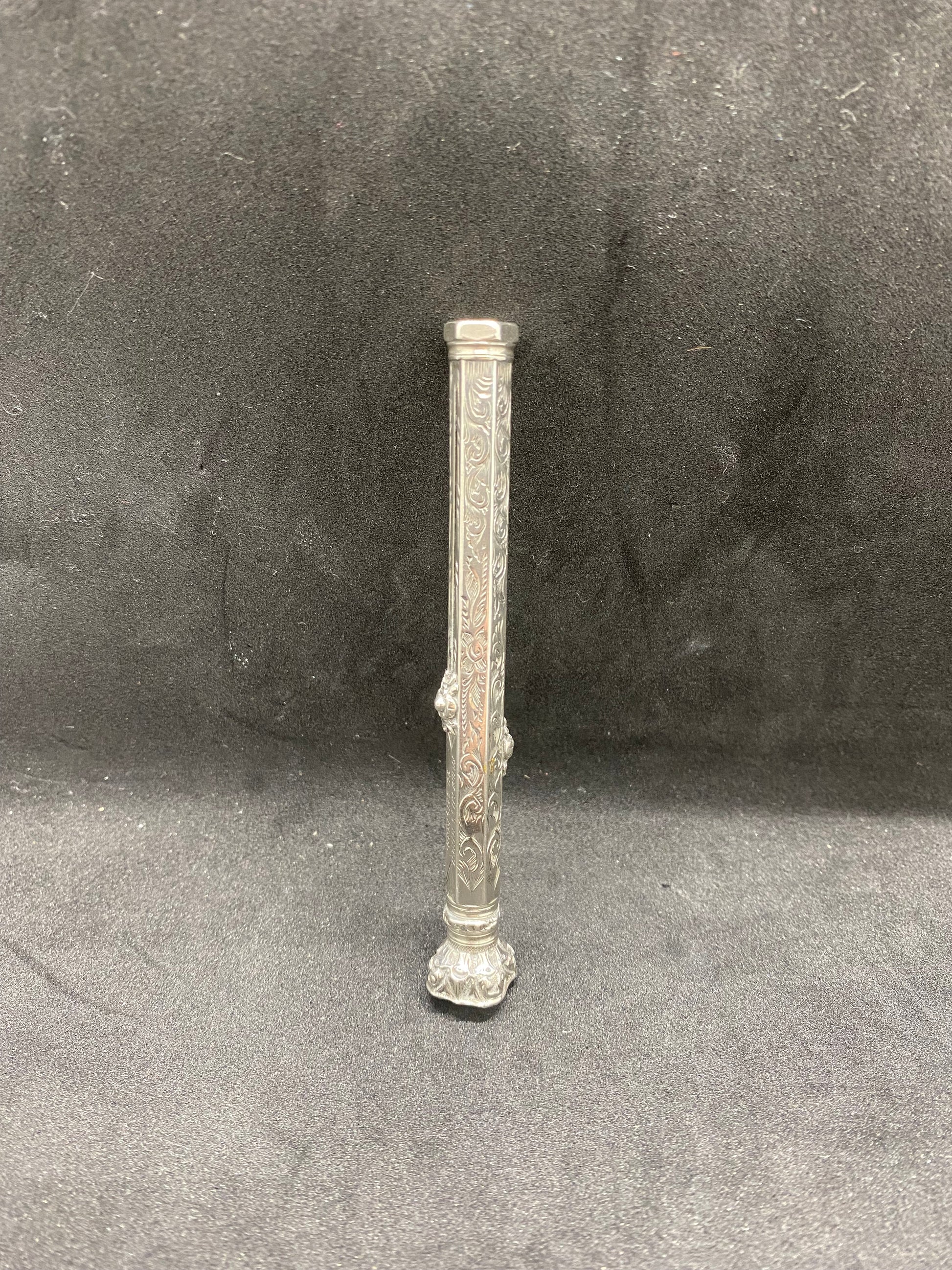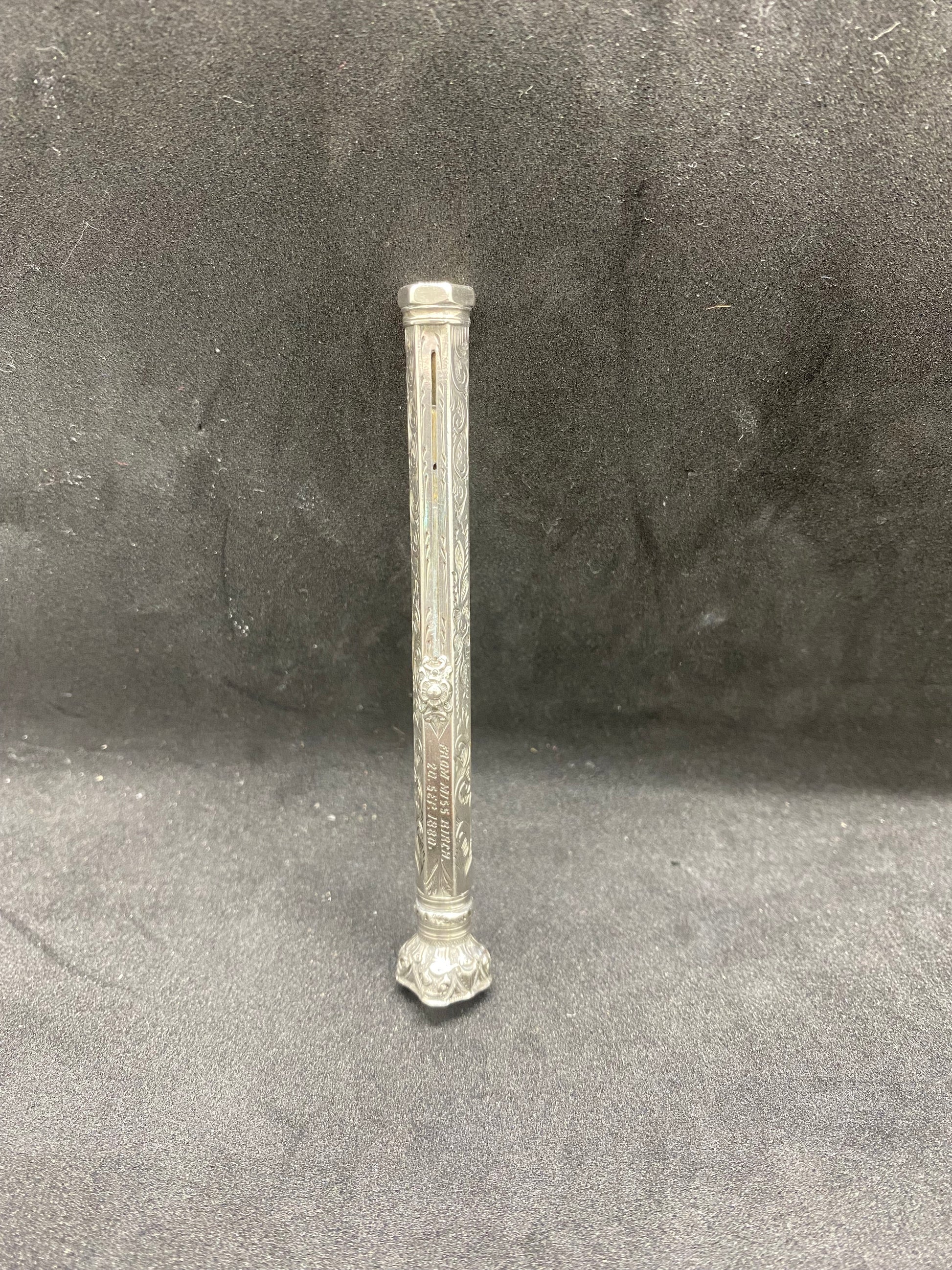 Lovely late Victorian sterling silver combination fountain pen & propelling pencil circa 1880. Lovely shield shaped agate seal to top. Really lovely engine turned detail and repousse work.