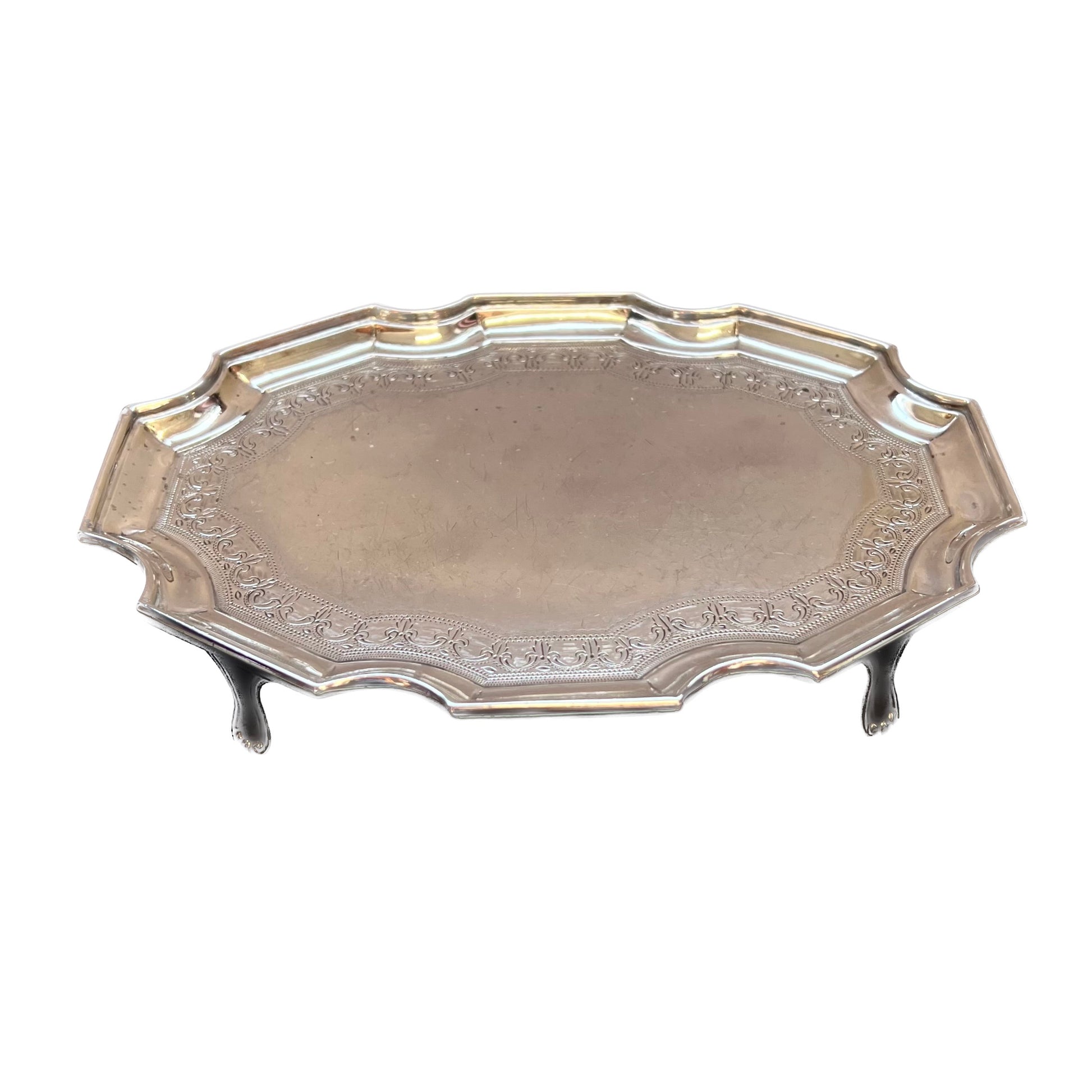 A fine antique late Victorian sterling silver salver / waiter with marks for Charles Stuart Harris, London, 1896 . A classic style with a well shaped border and etched pattern. A fine practical piece that would serve equally well in the office or dining area.
