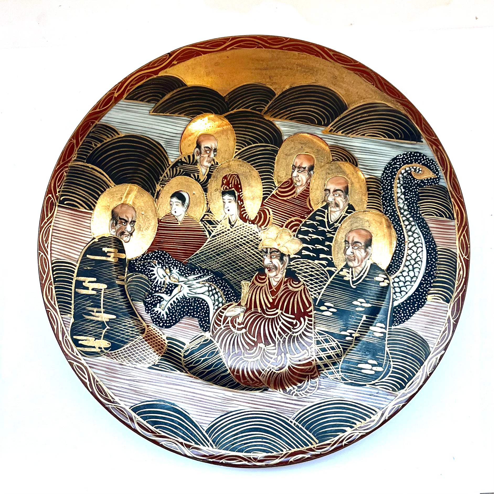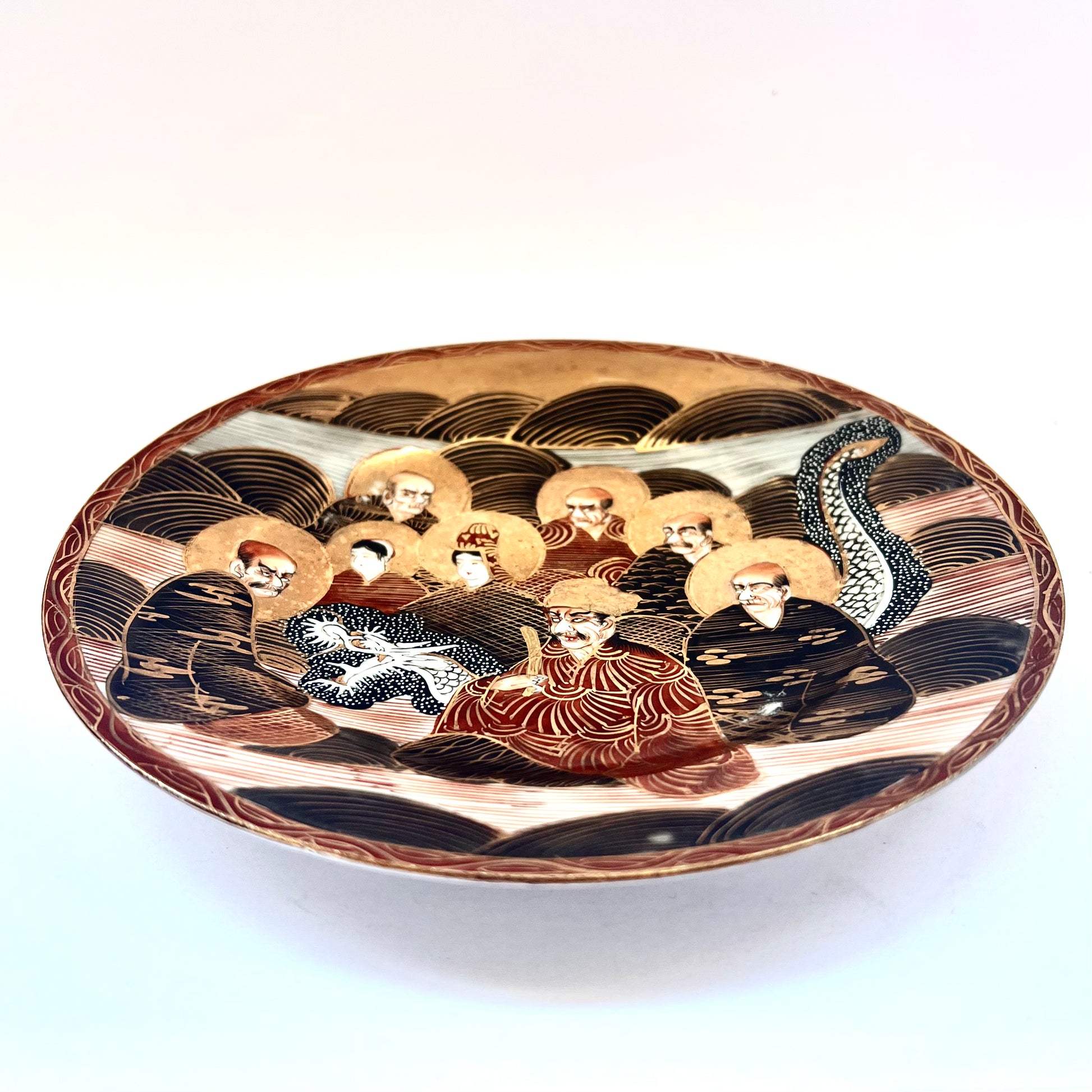 Charming mid 20th century Japanese plate depicting several Immortals handpainted in the Satsuma tradition, with gilt and hand-painted details throughout.