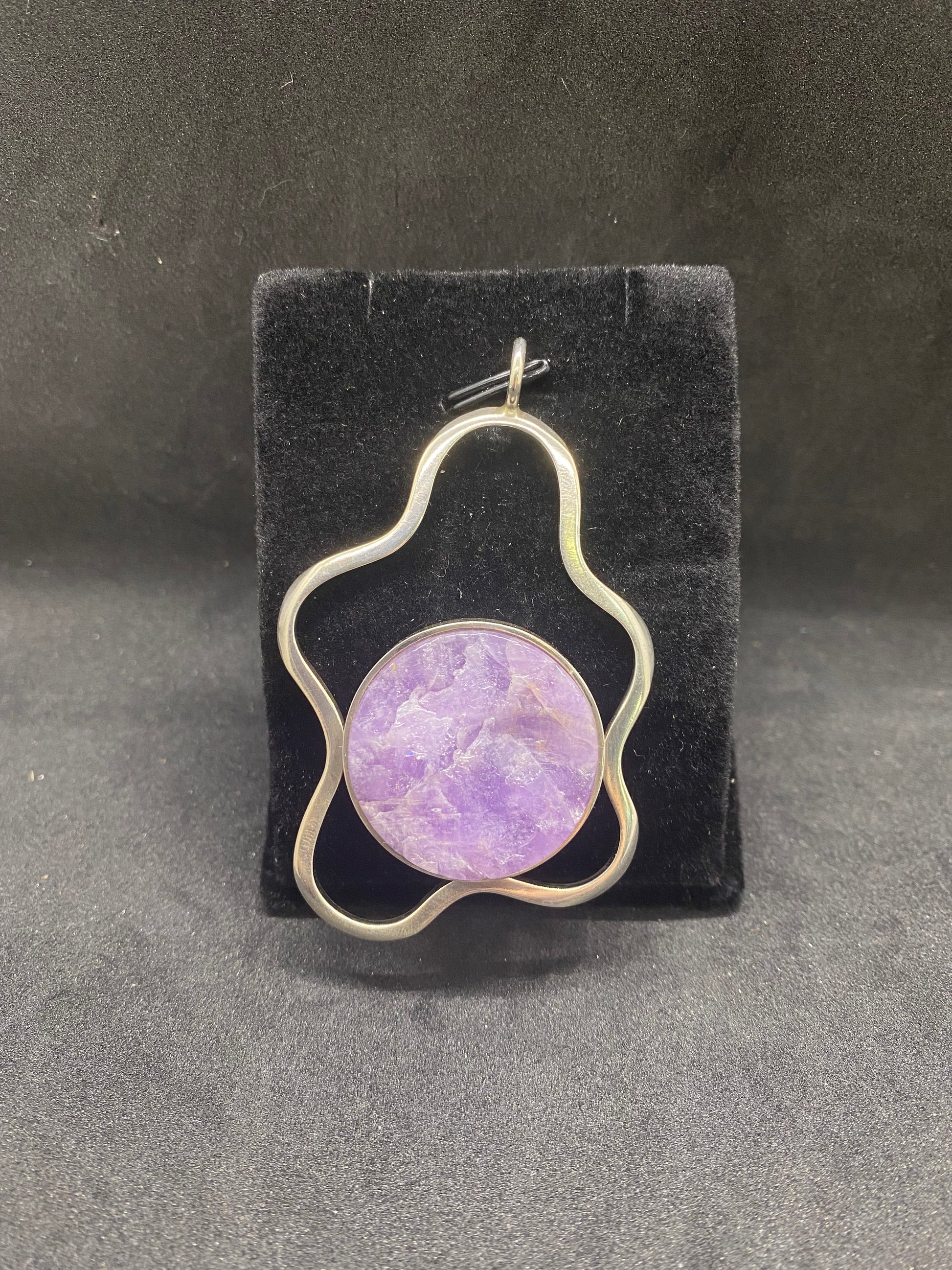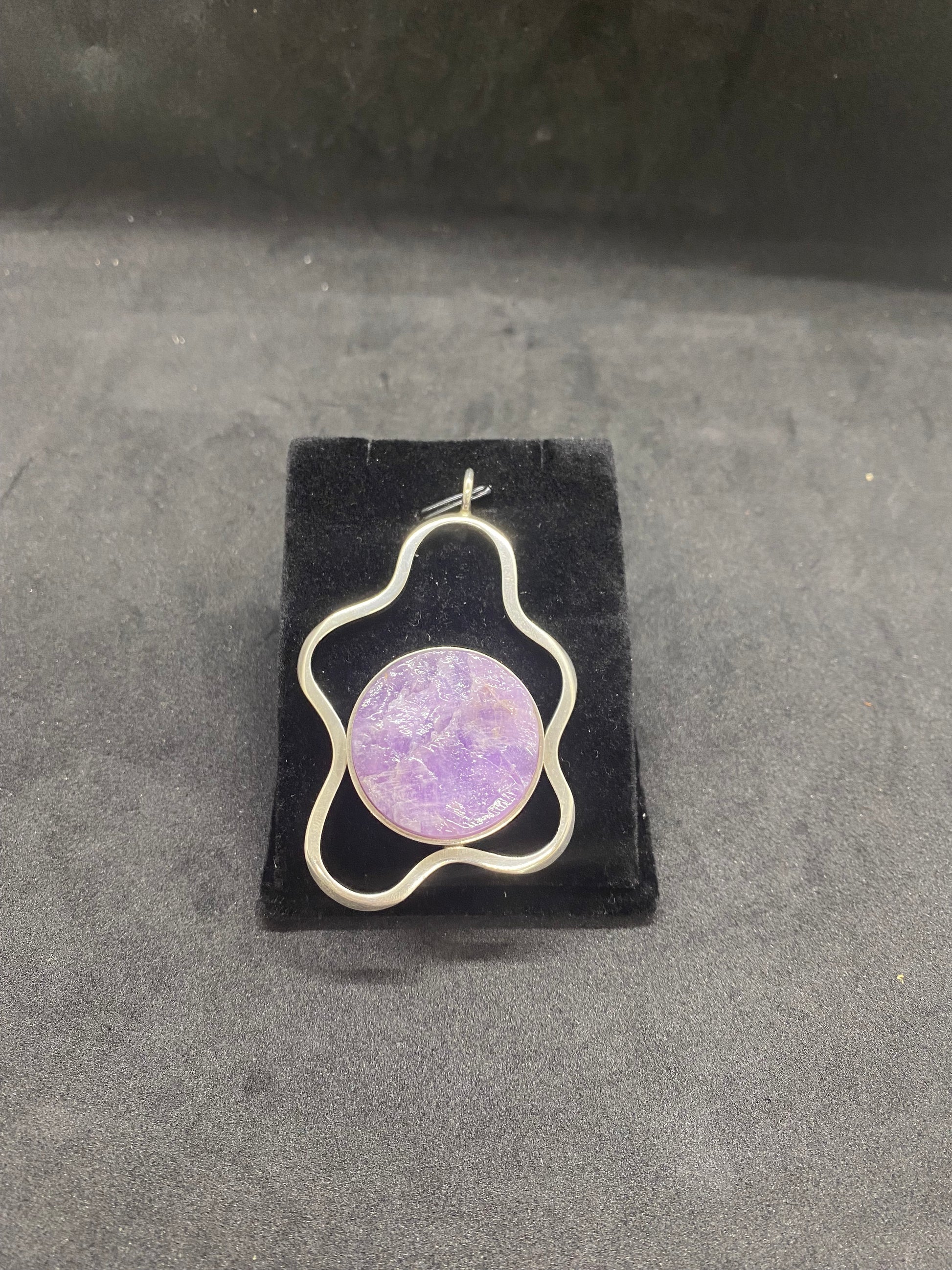 This sterling silver amethyst pendant is made in a great midcentury modern style.