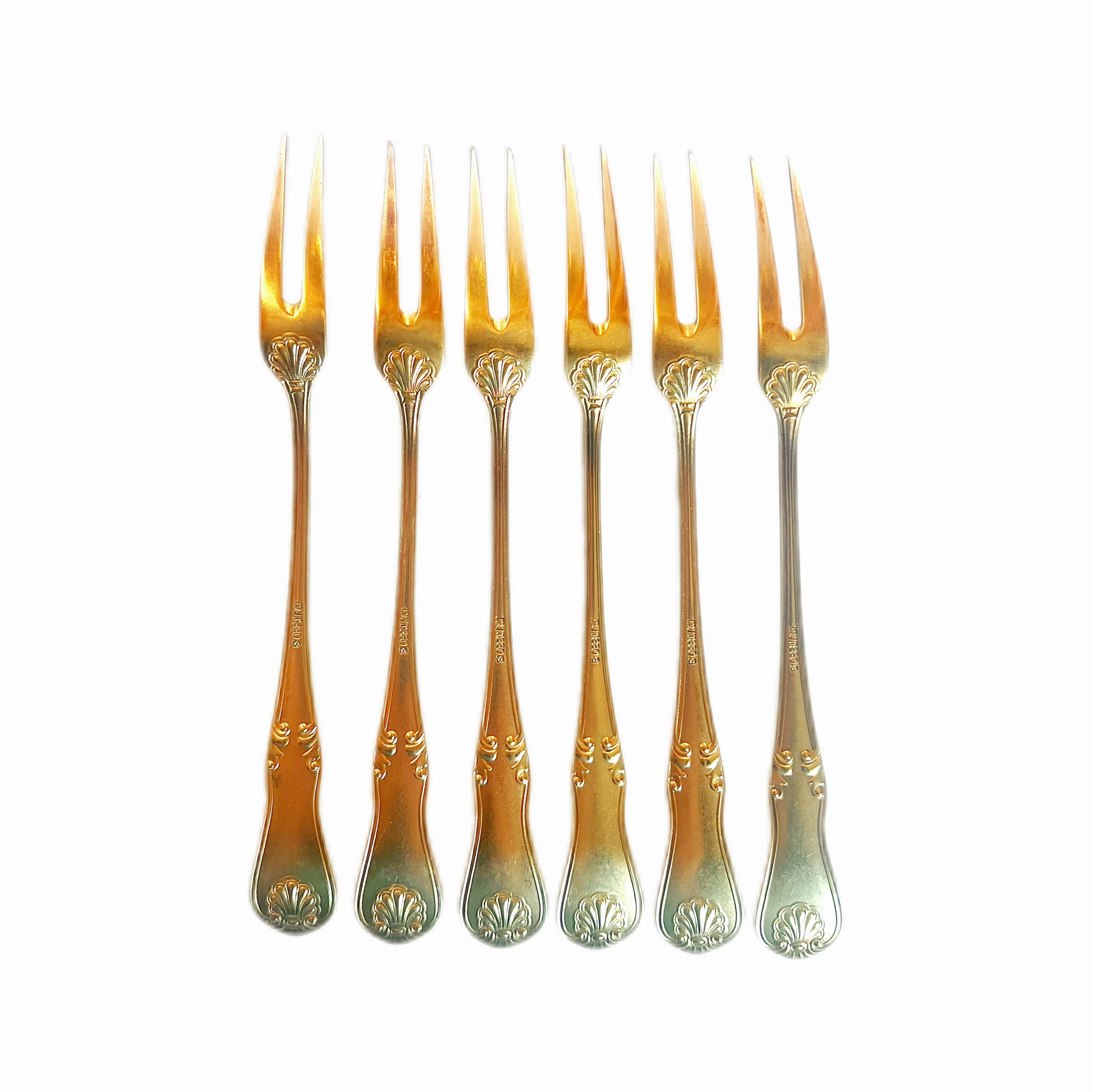 A beautiful set of 6 early to mid 20th century Norwegian .830 gilt silver cocktail forks with maker’s marks for J. Tostrup, a prolific and popular silverware manufacturer founded in Oslo, 1832 by Jacob Tostrup and still active today.